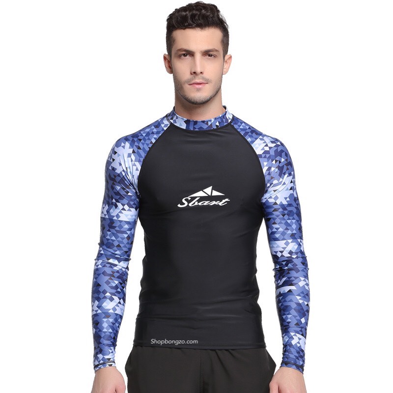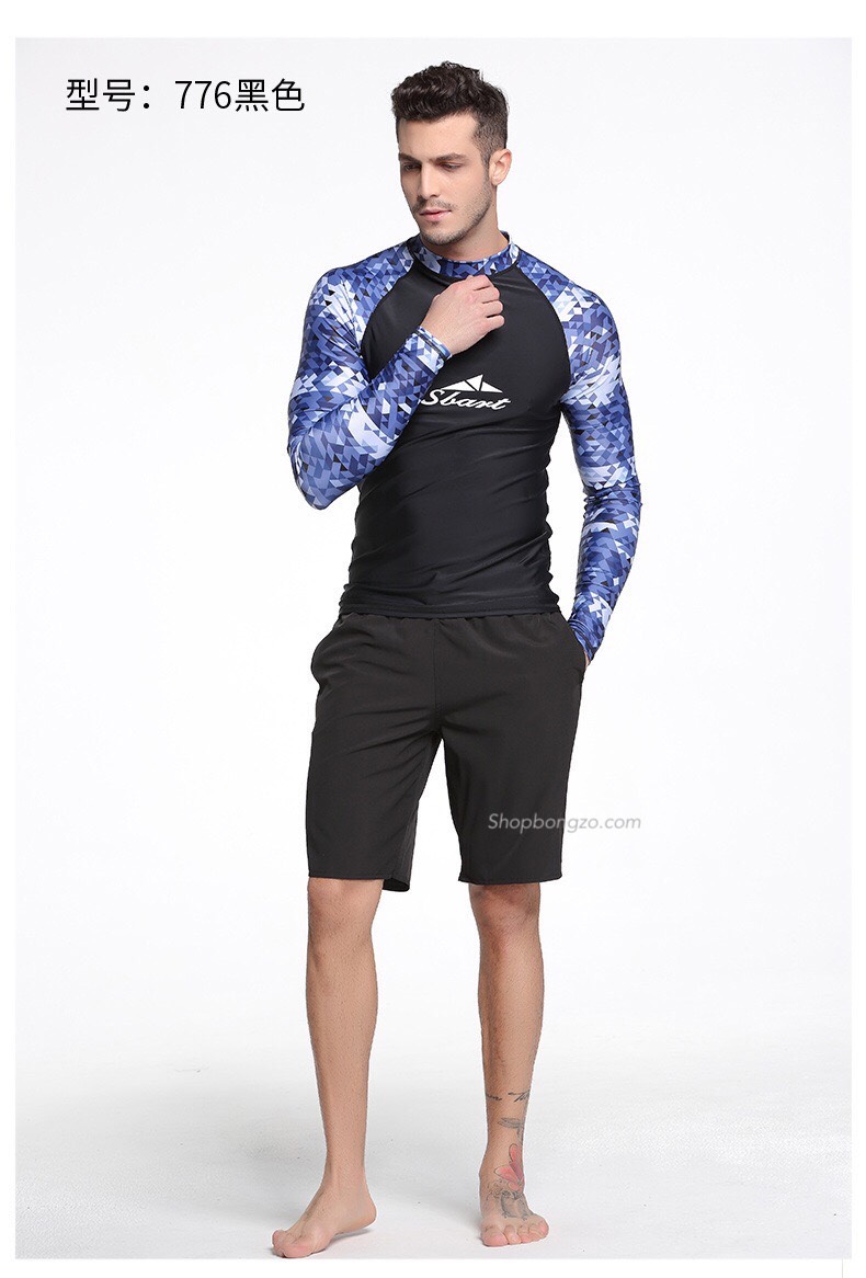 Áo bơi nam dài tay màu đen, tay hoạ tiết ô, vải chống nắng- Sbart 776 đen