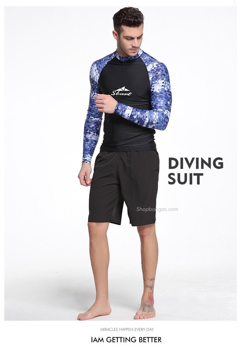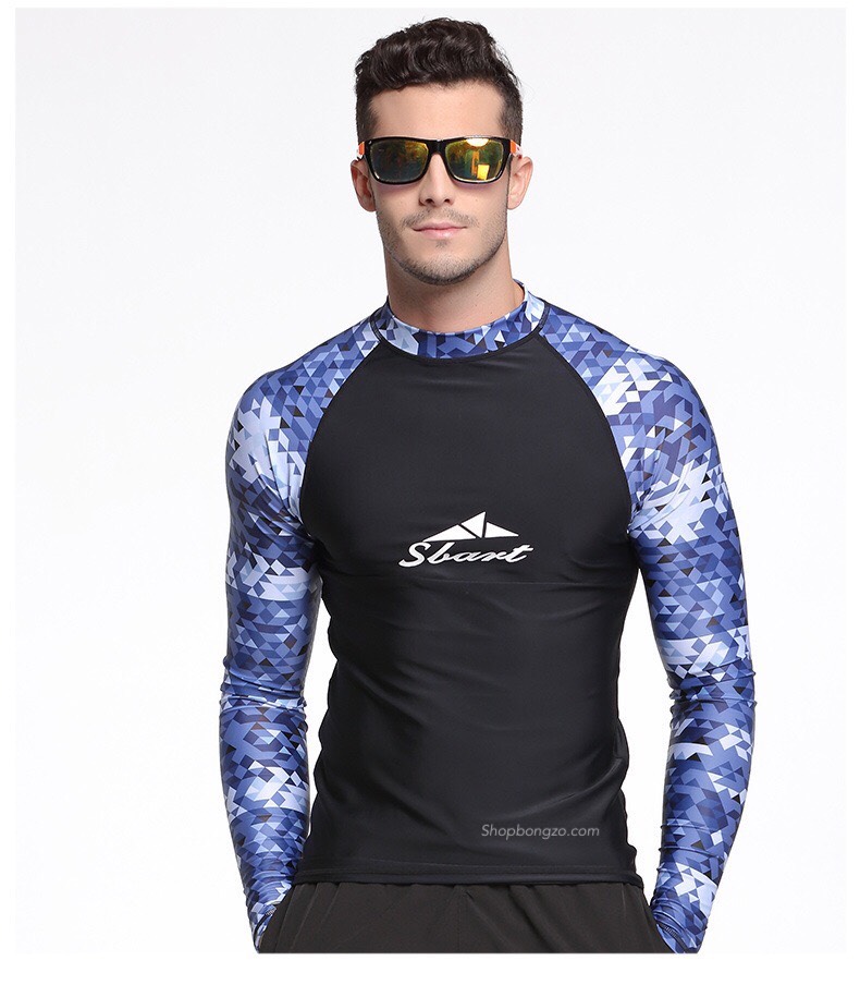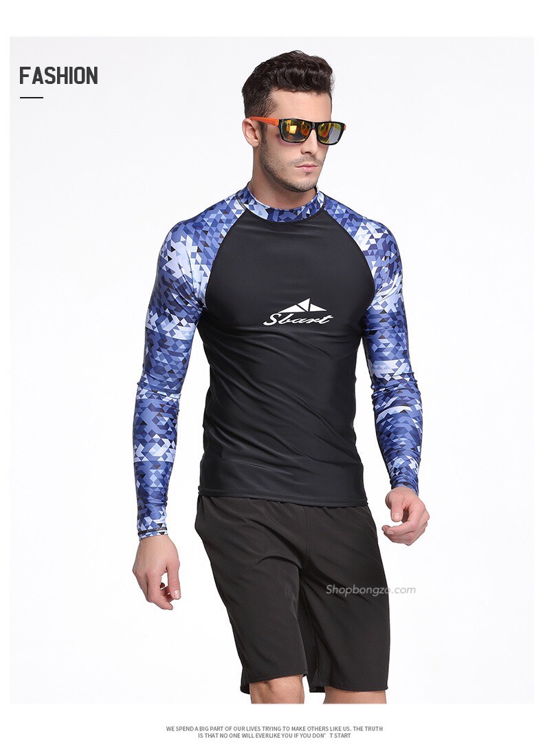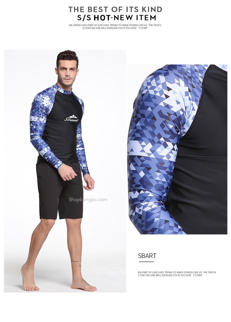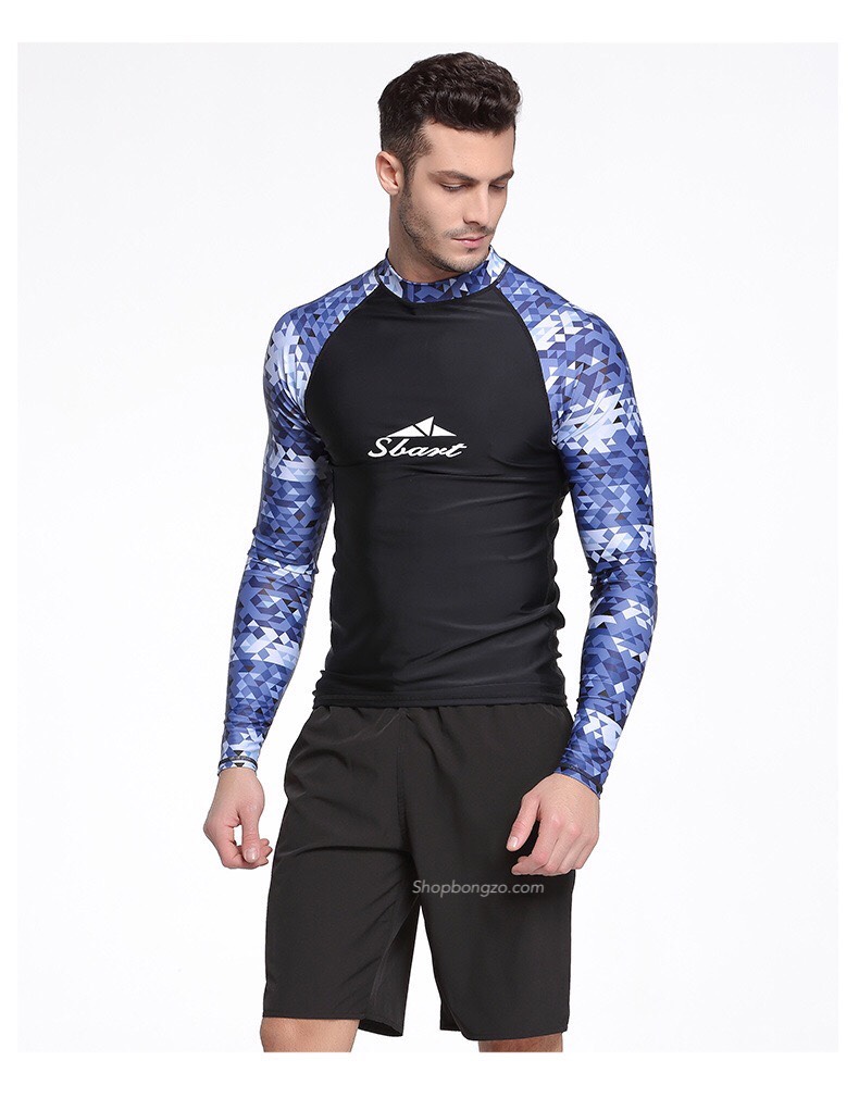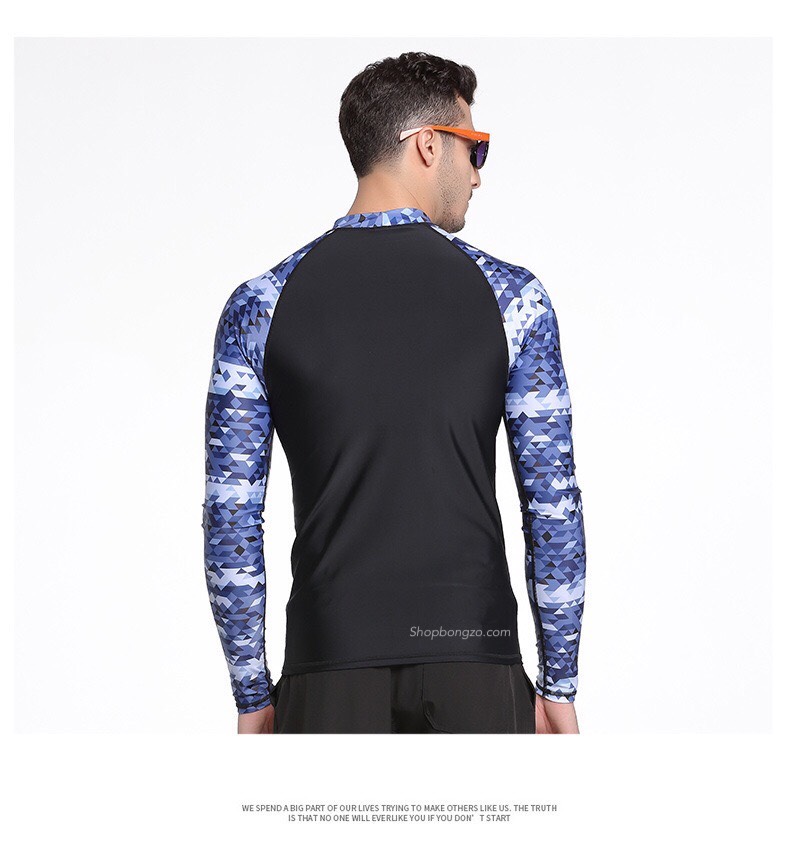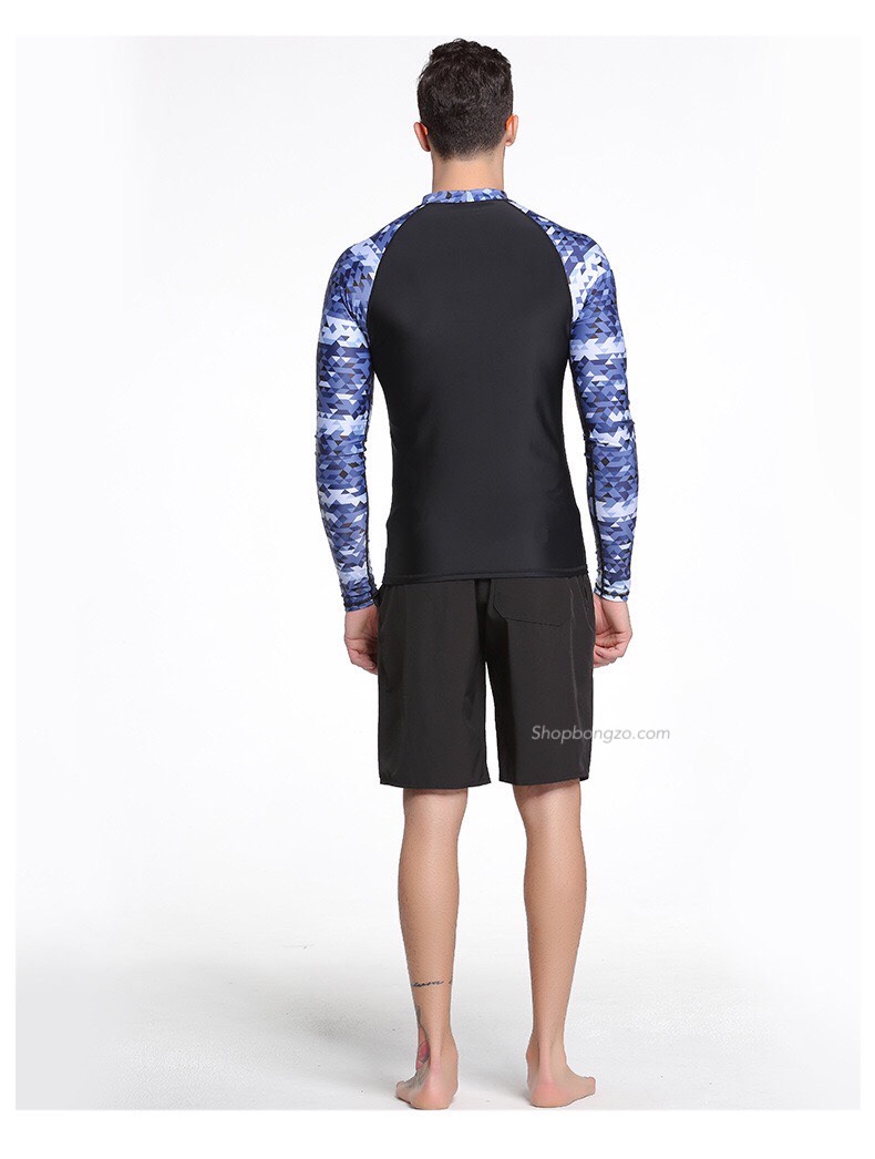 Áo bơi nam dài tay, màu xanh, tay hoạ tiết, 776