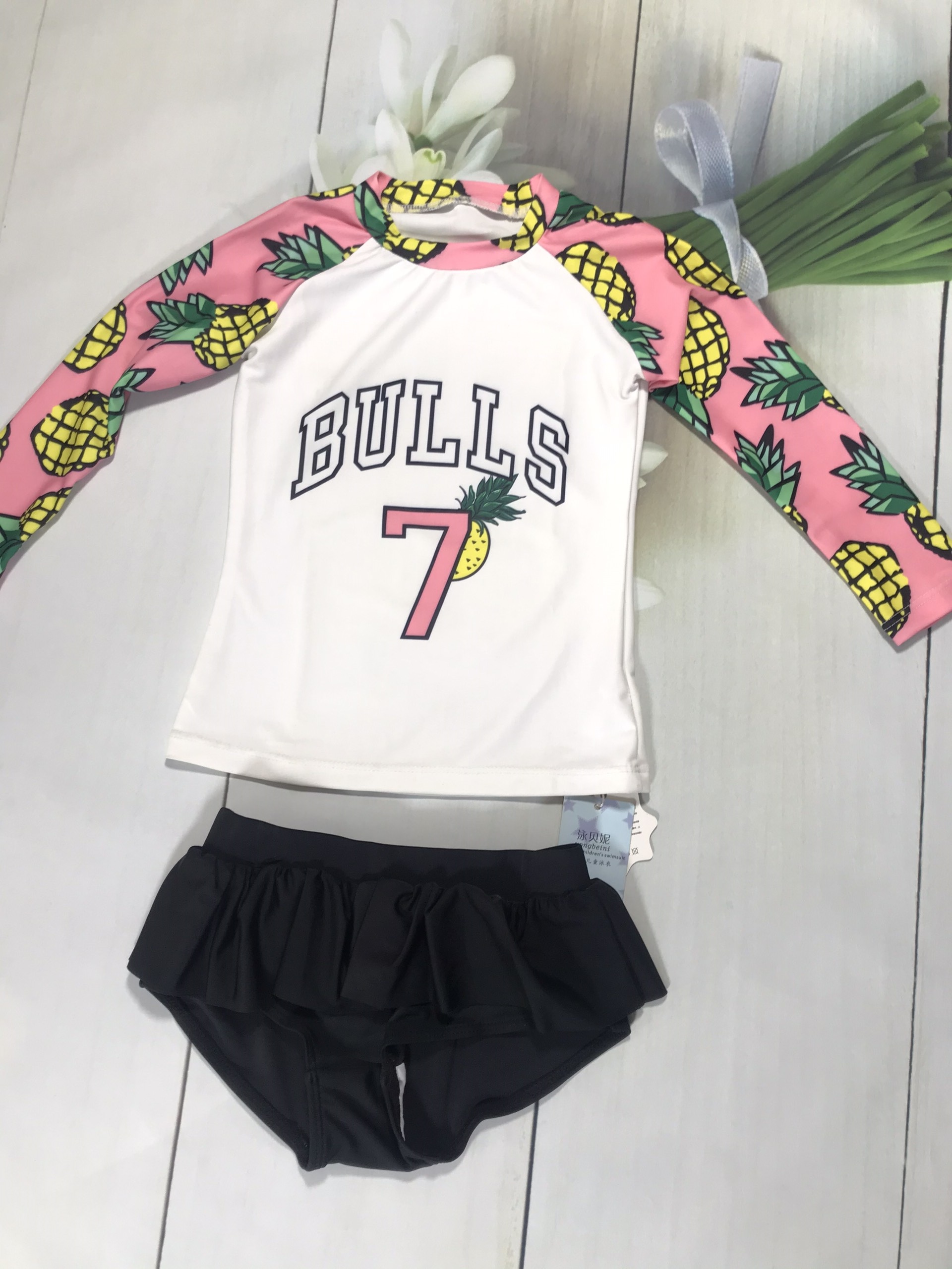 Bộ bơi bé gái cộc tay, màu trắng đen, vải cao cấp chống nắng UPF 50+, YUKE