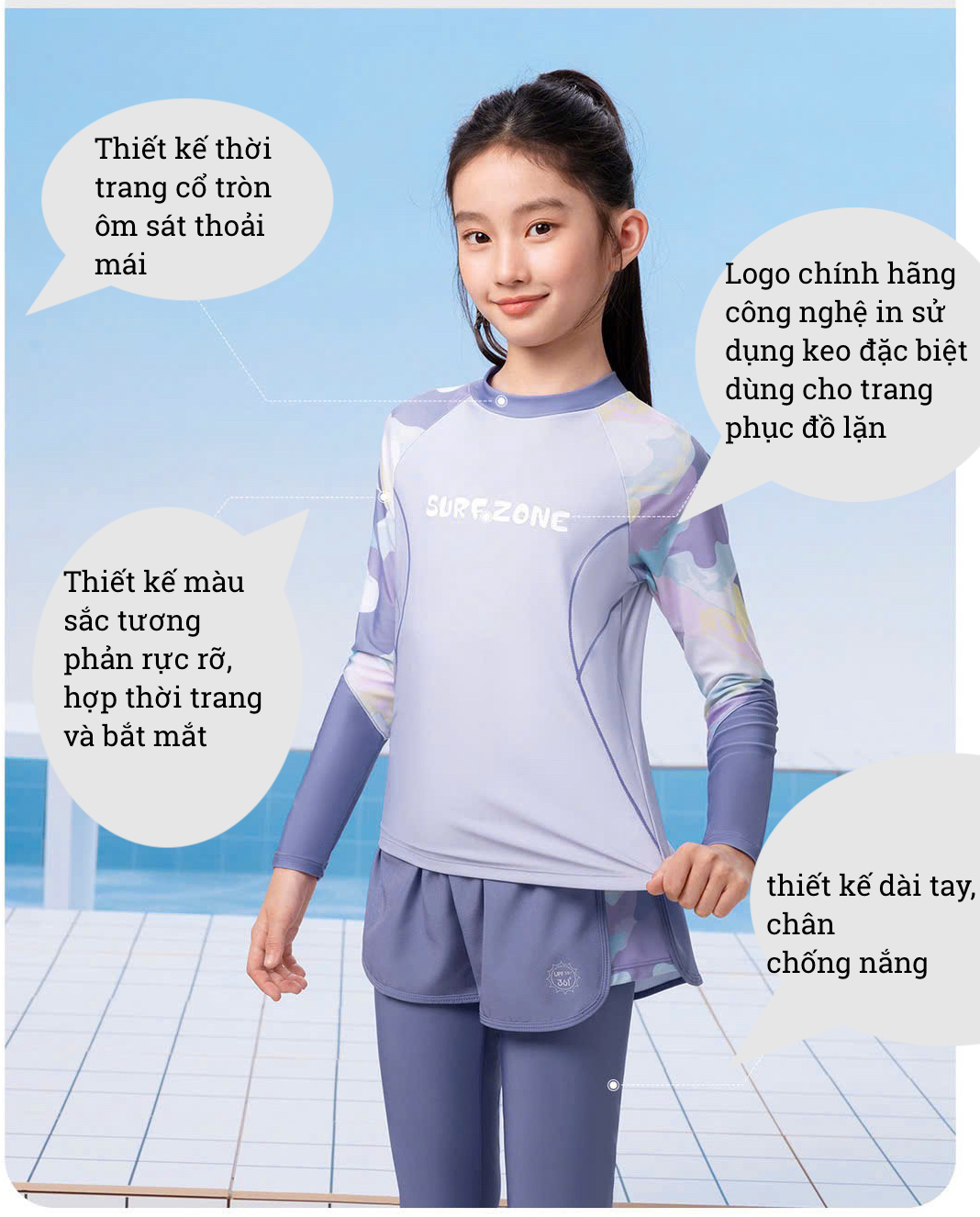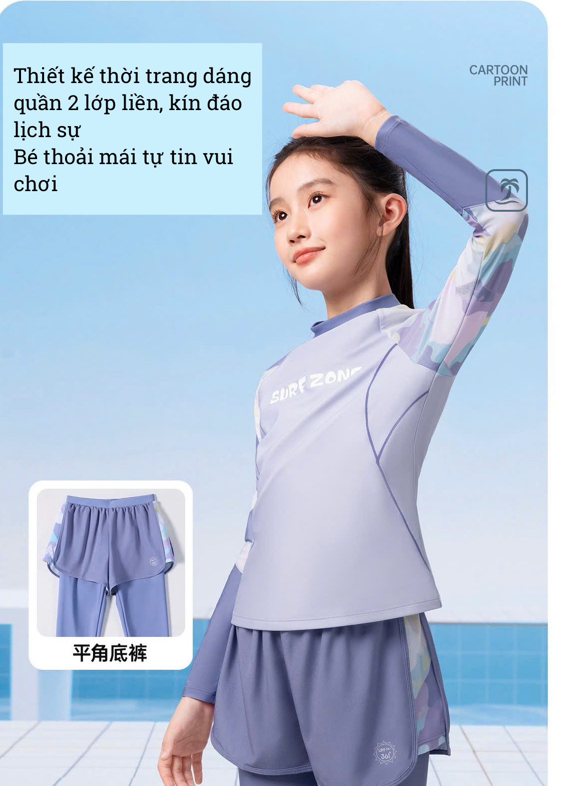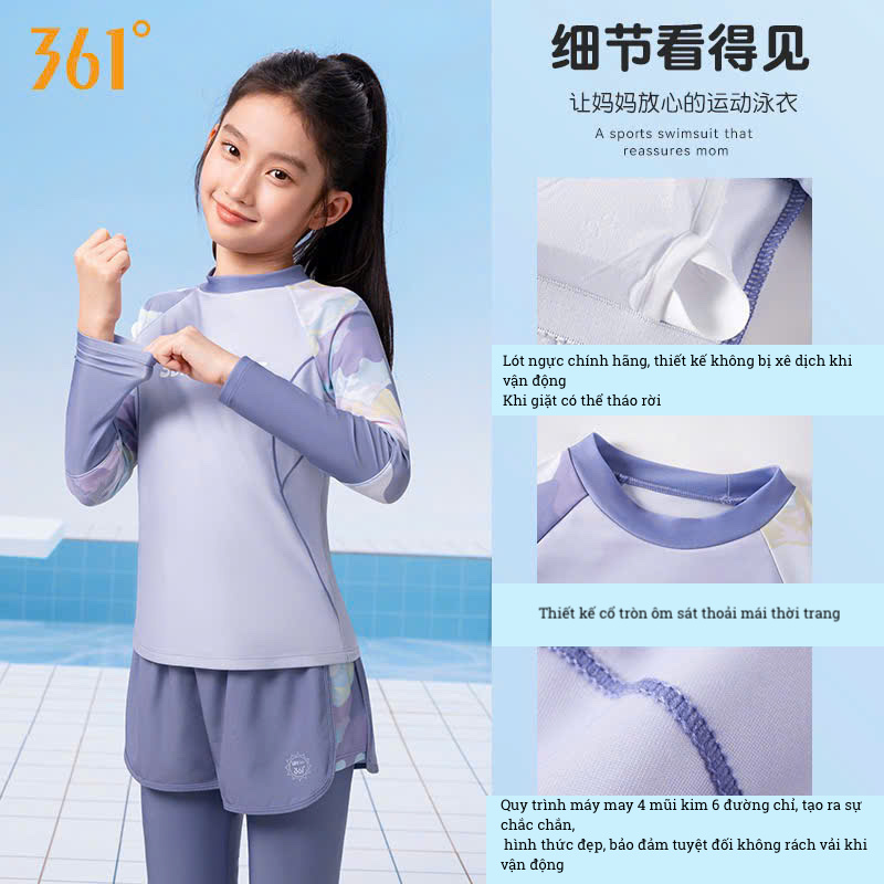 Bộ bơi 361 bé gái, dài tay chân, chống lạnh, chống nắng UPF 50+, bơi tắm biển, khoáng nóng, màu tím