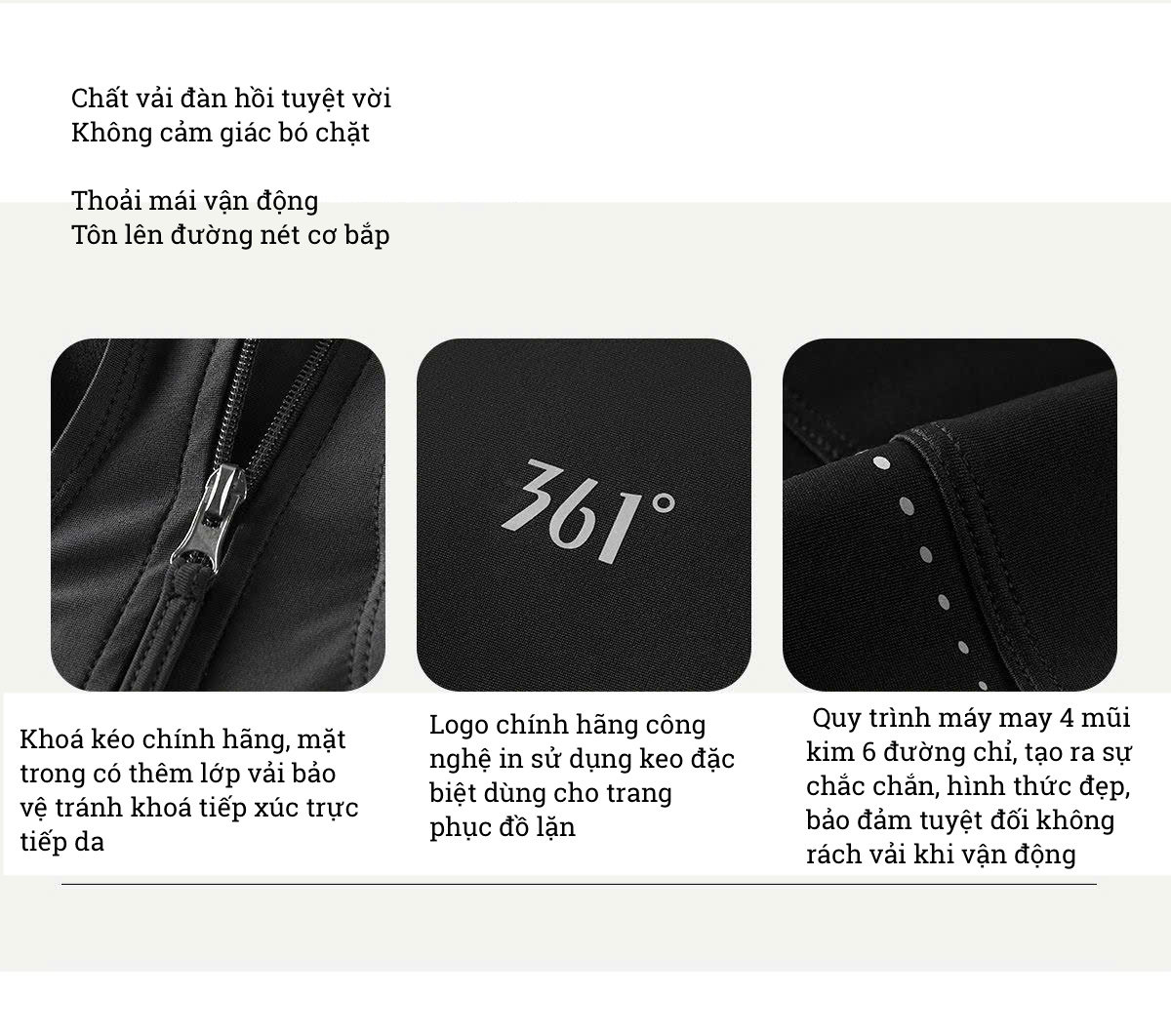+ Quy trình máy may 4 mũi kim 6 đường chỉ, tạo ra sự chắc chắn, hình thức đẹp, bảo đảm tuyệt đối không rách vải khi vận động