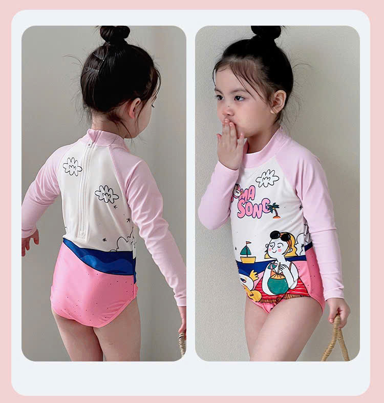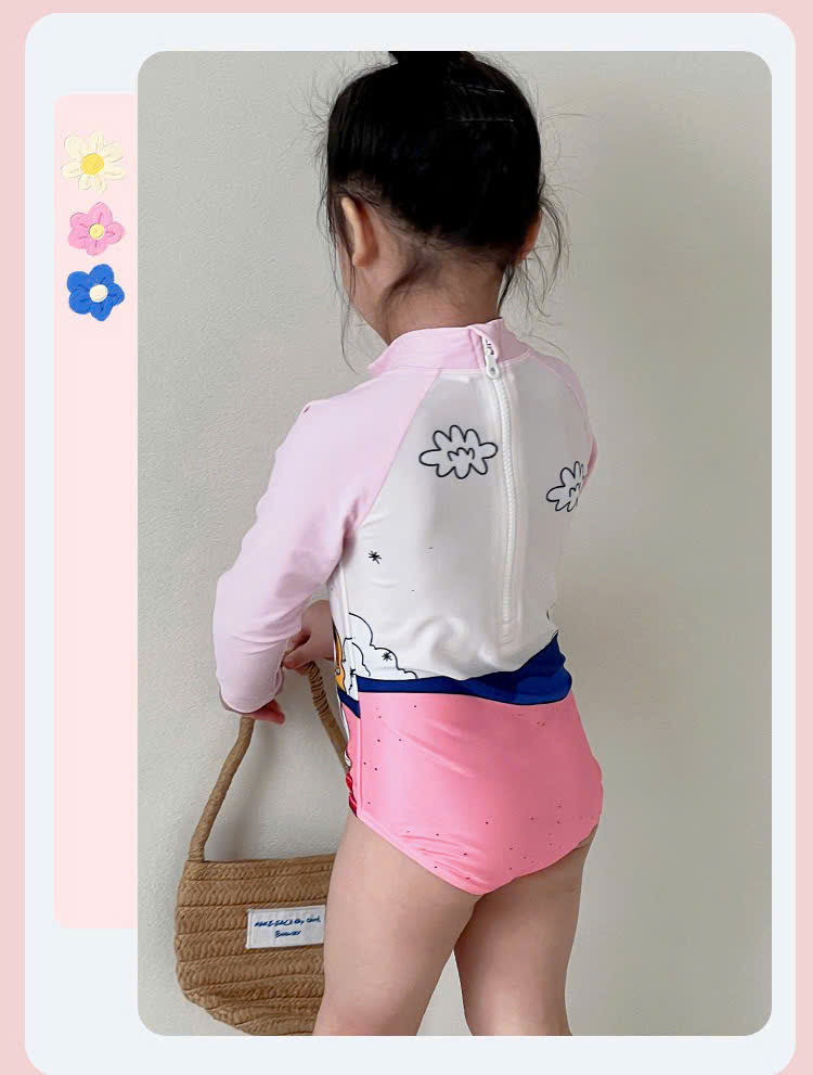 Bộ bơi bé gái chống nắng chống clo, dài tay liền thân, màu hồng trắng, Momasong(Korea)