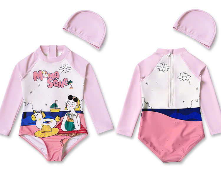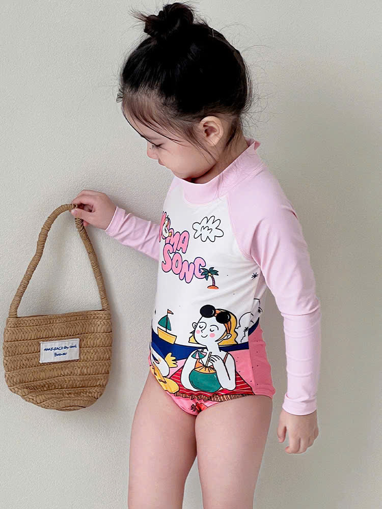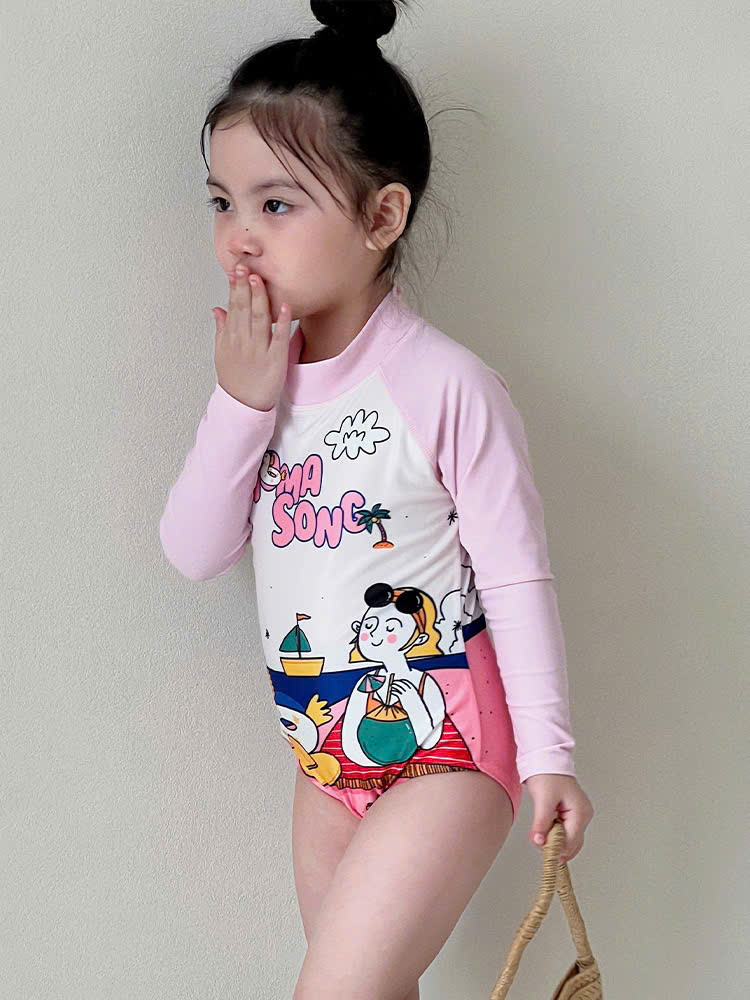 Bộ bơi bé gái dài tay, vải chống nắng UPF 50+ Momasong (Korea), hồng trắng