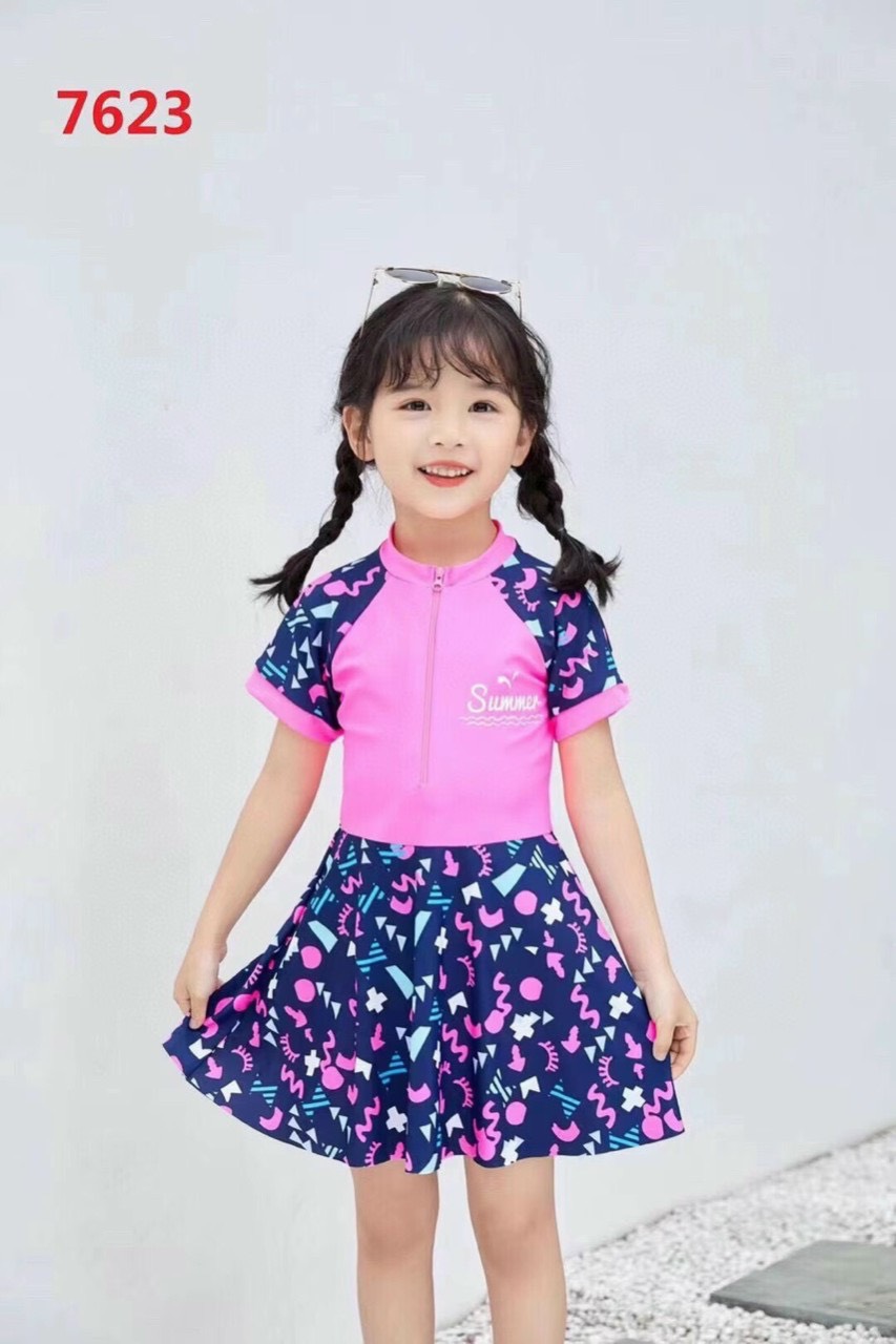 Bộ bơi bé gái cộc liền chân váy, hồng than 7623