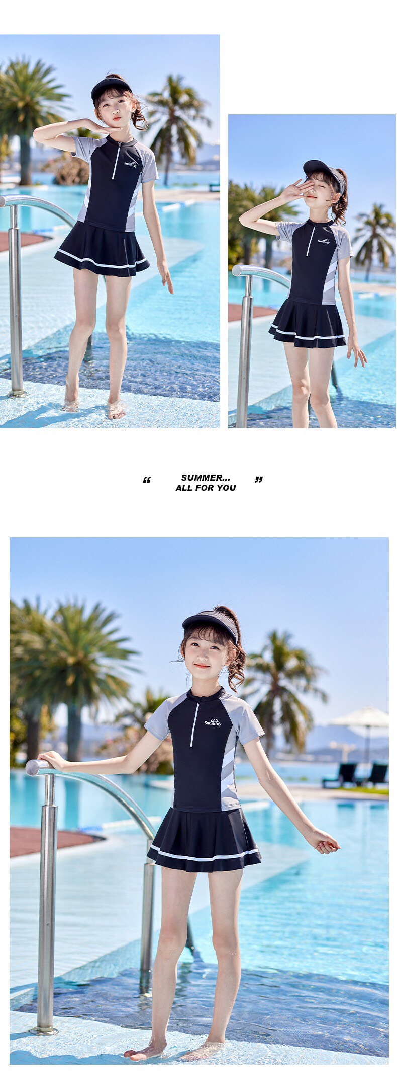 Bộ bơi bé gái cộc tay, đen tay ghi, chân váy rời Sunshiny 32003