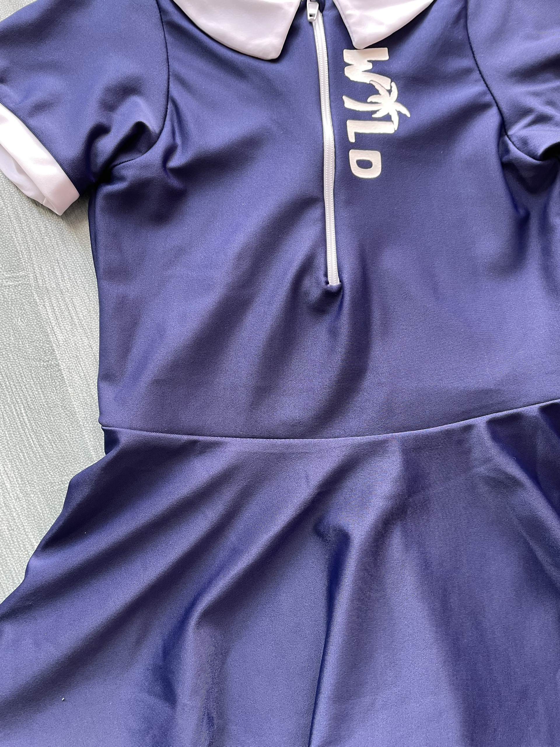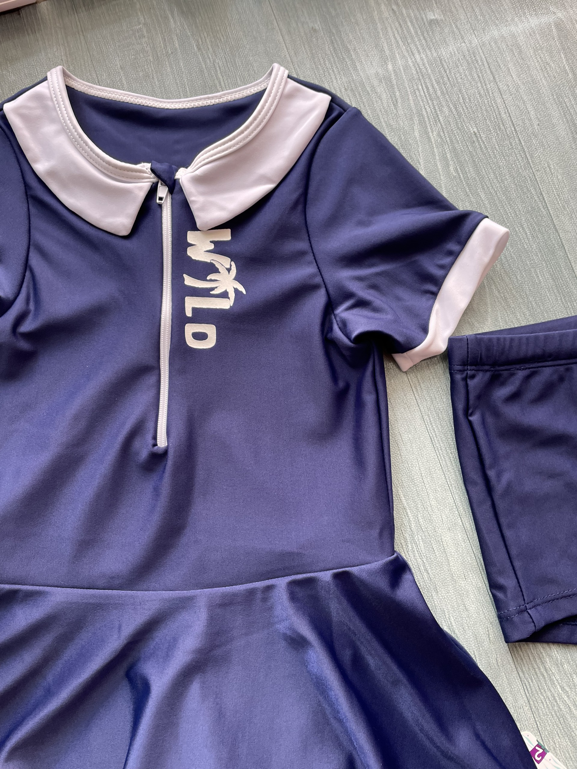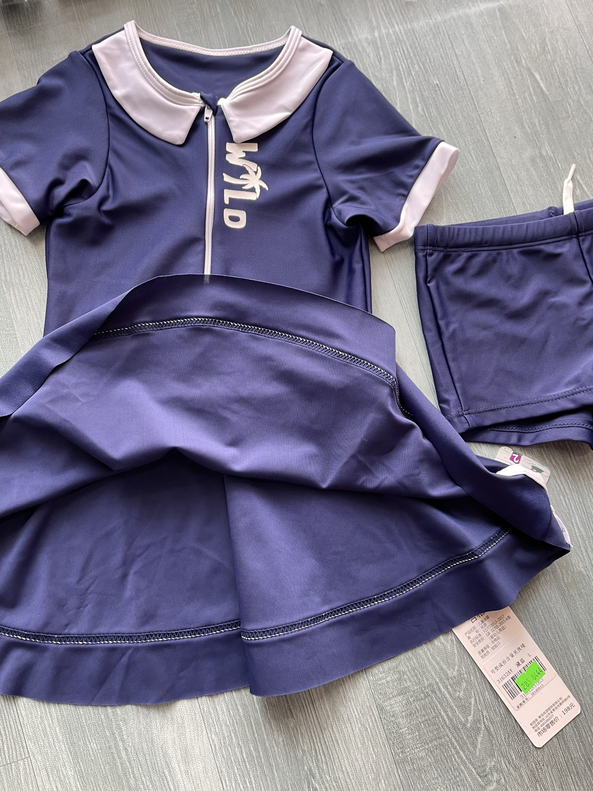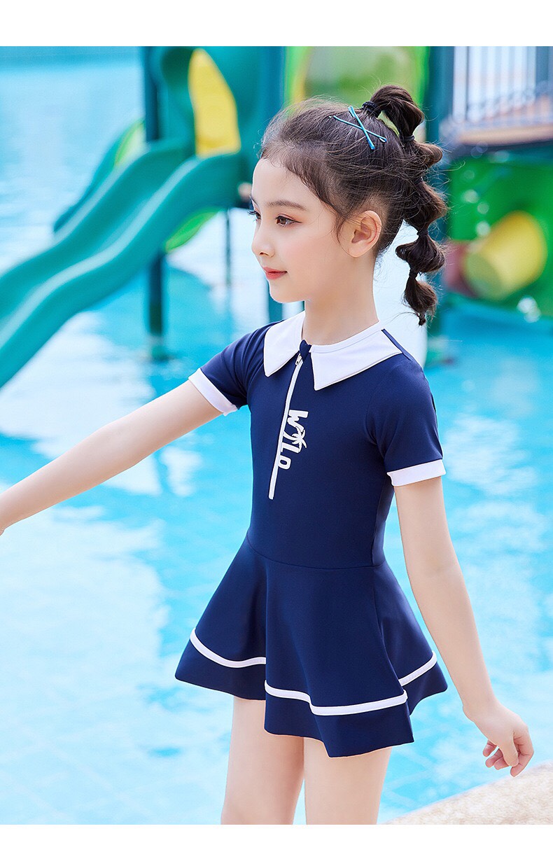 Bộ bơi bé gái cộc tay liền chân váy, xanh than, cổ trắng 31632
