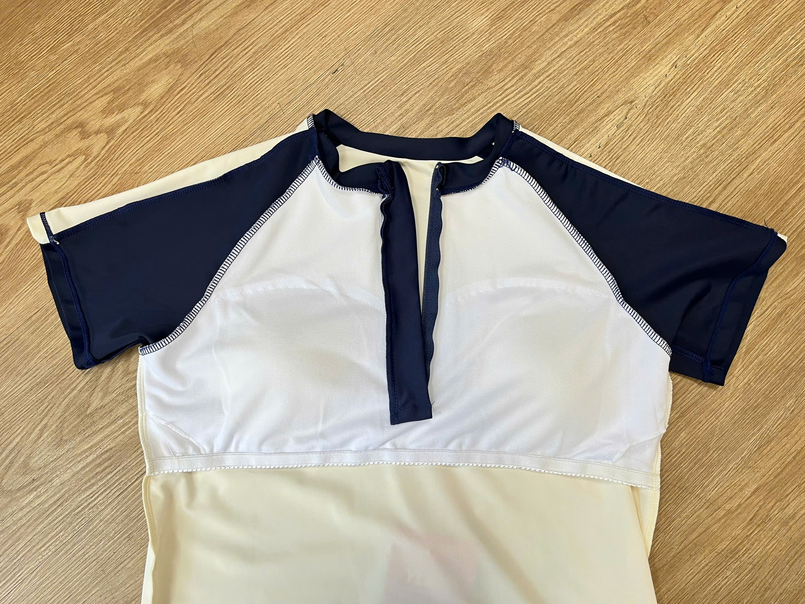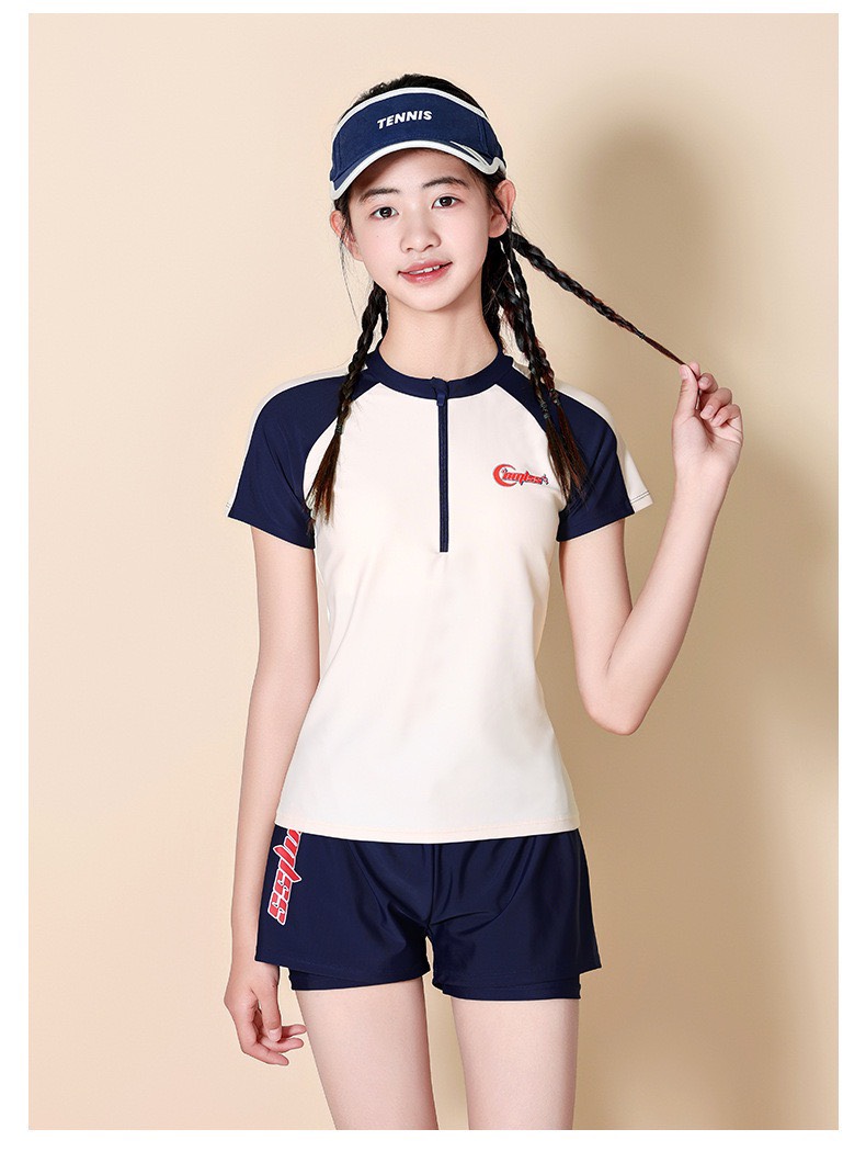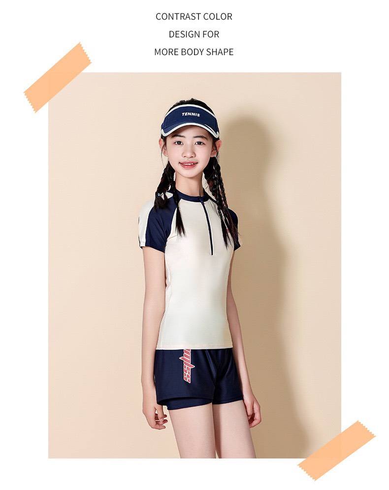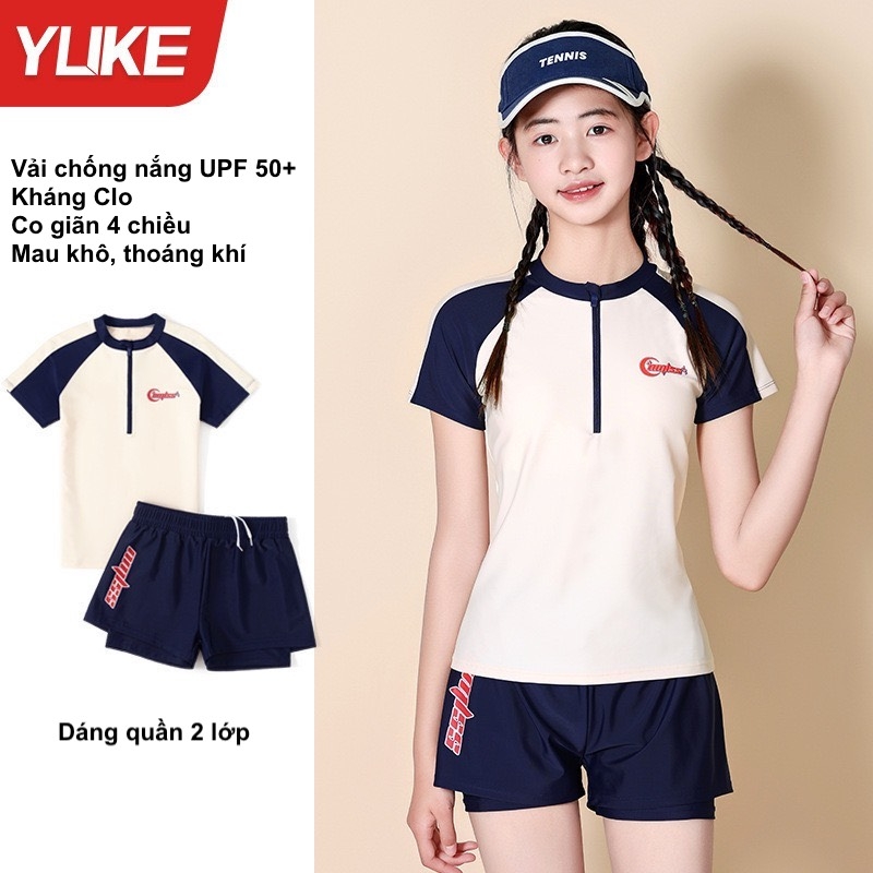 Bộ bơi bé gái cộc tay, màu trắng đen, vải cao cấp chống nắng UPF 50+, YUKE