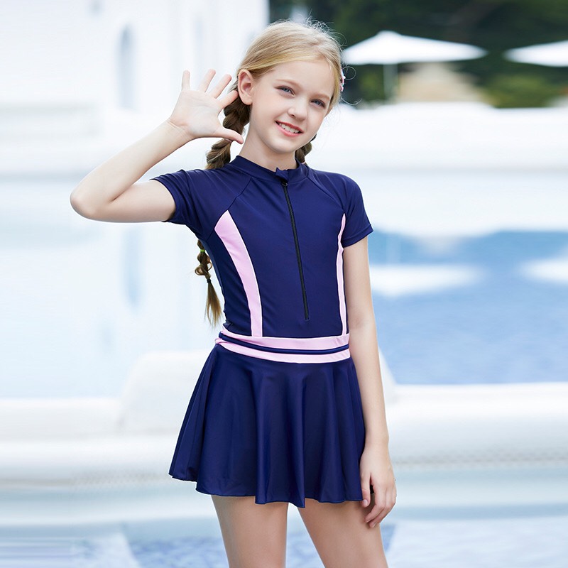 Bộ bơi bé gái cộc xanh than, liền chân váy
