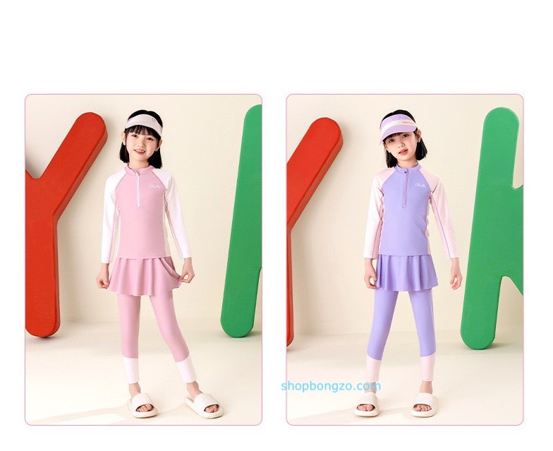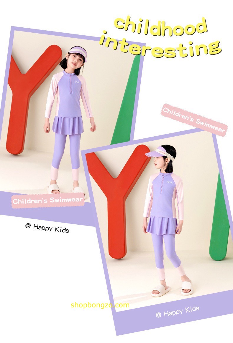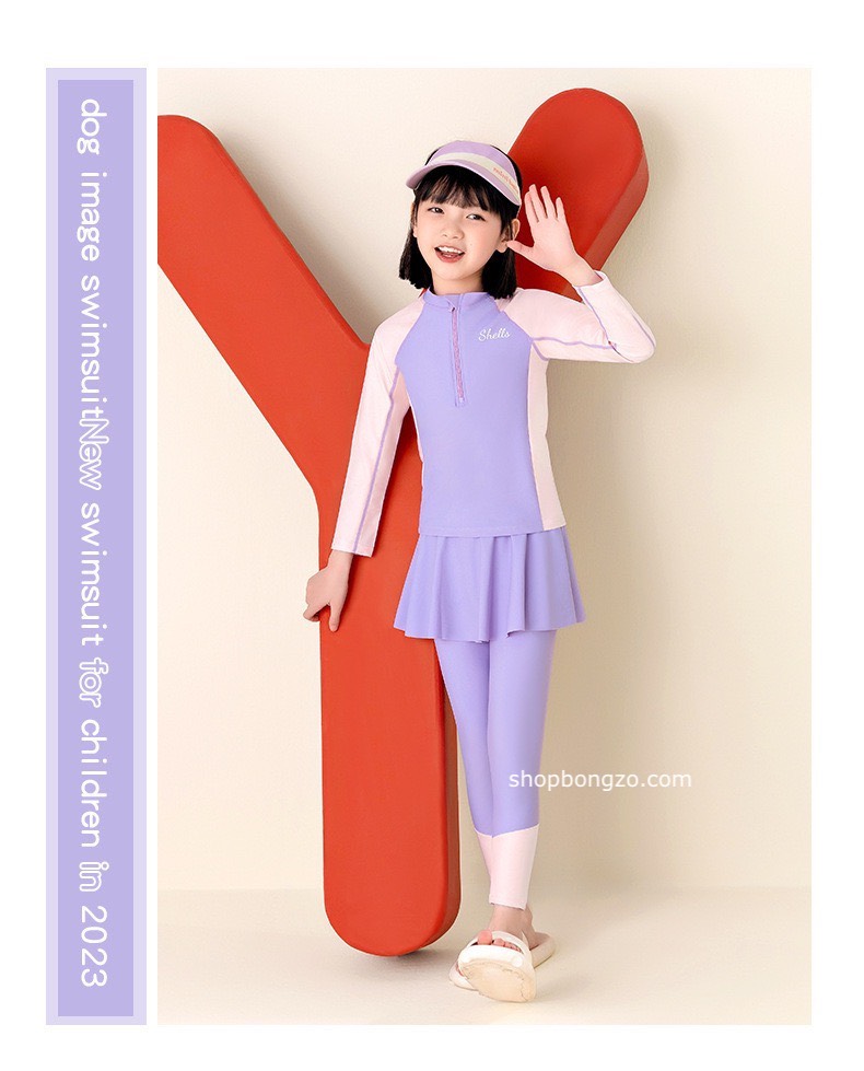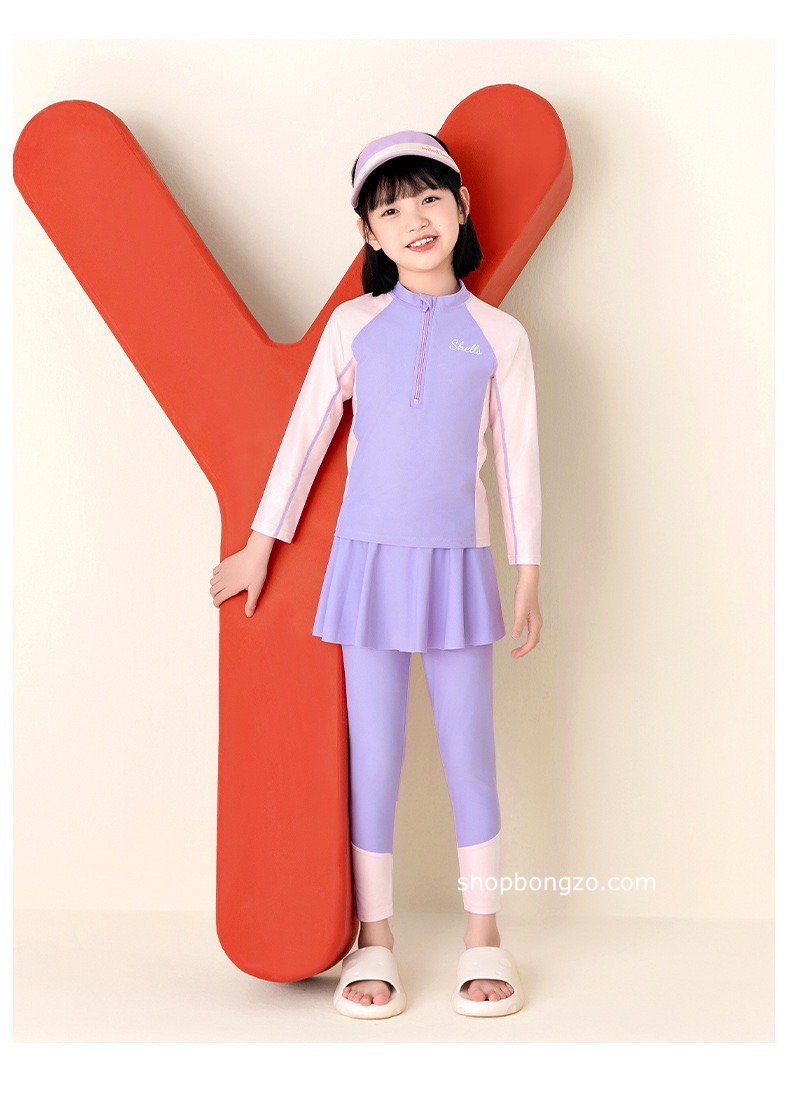 Bộ bơi bé gái dài, chân váy liền quần, màu tím, Shells