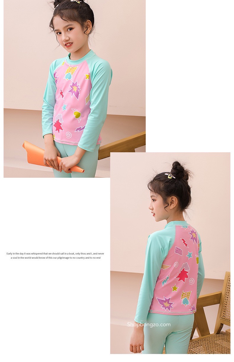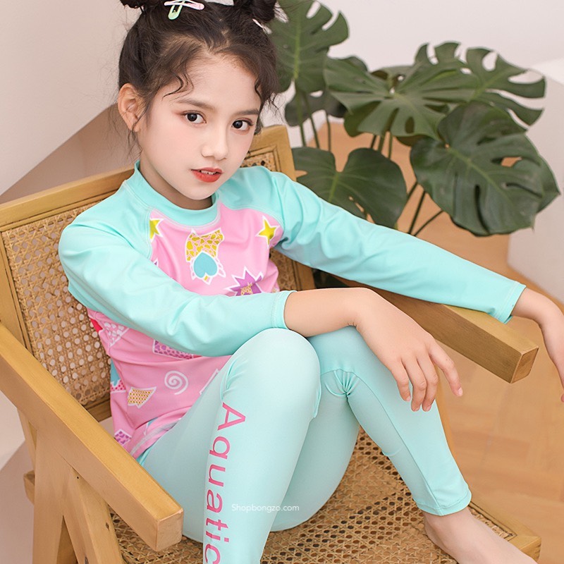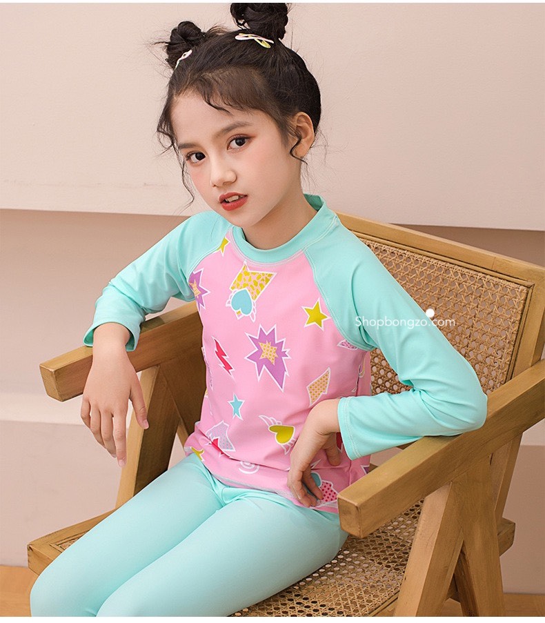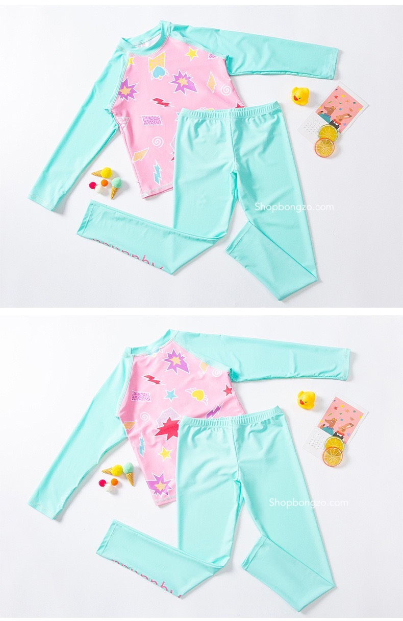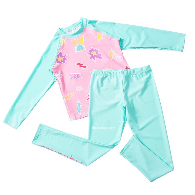 Bộ bơi bé gái dài hồng xanh, dáng rời, hoạ tiết