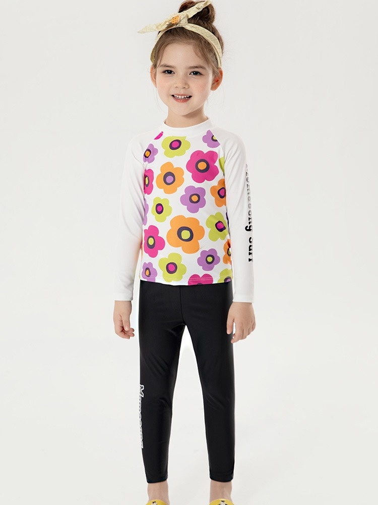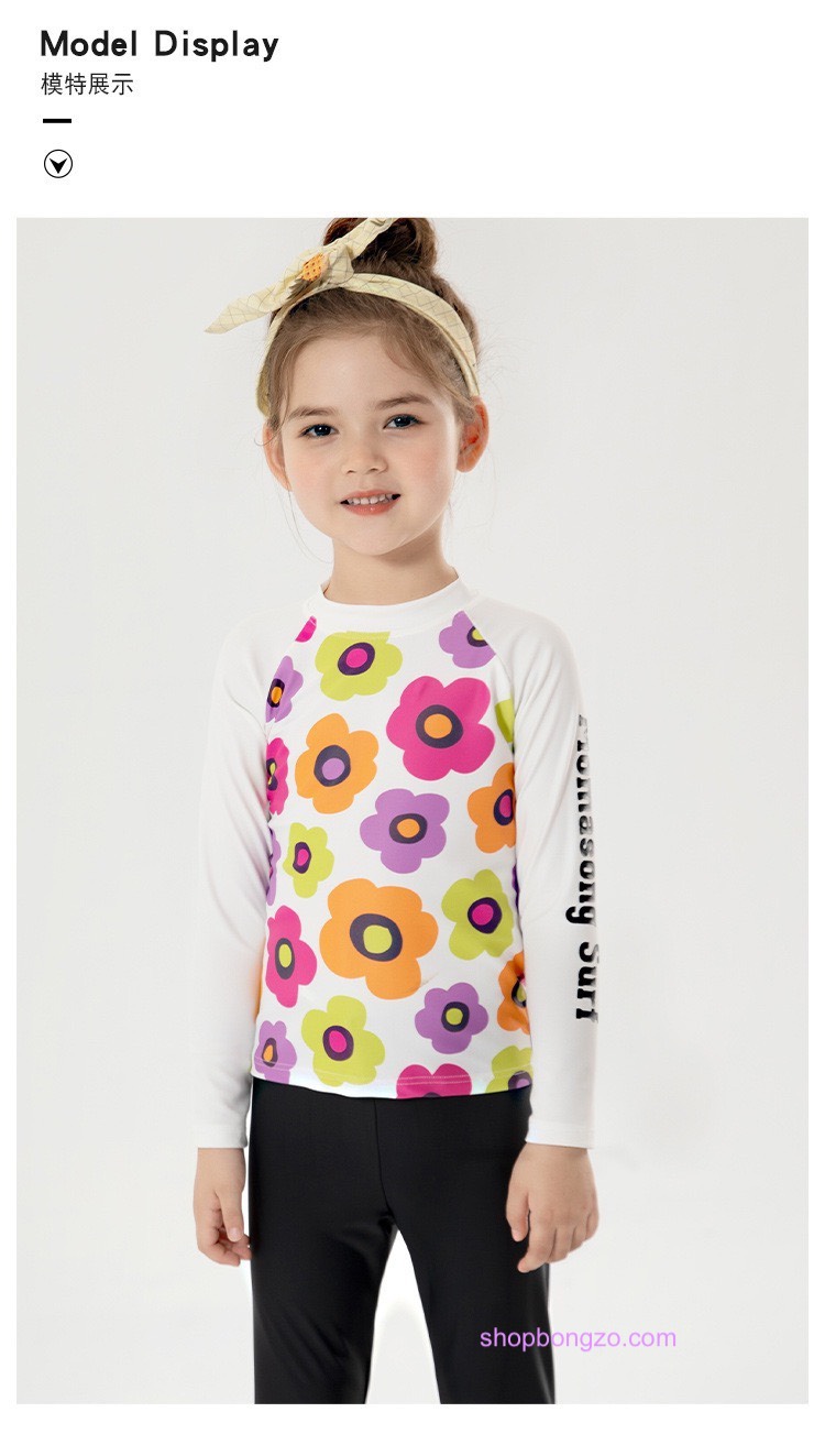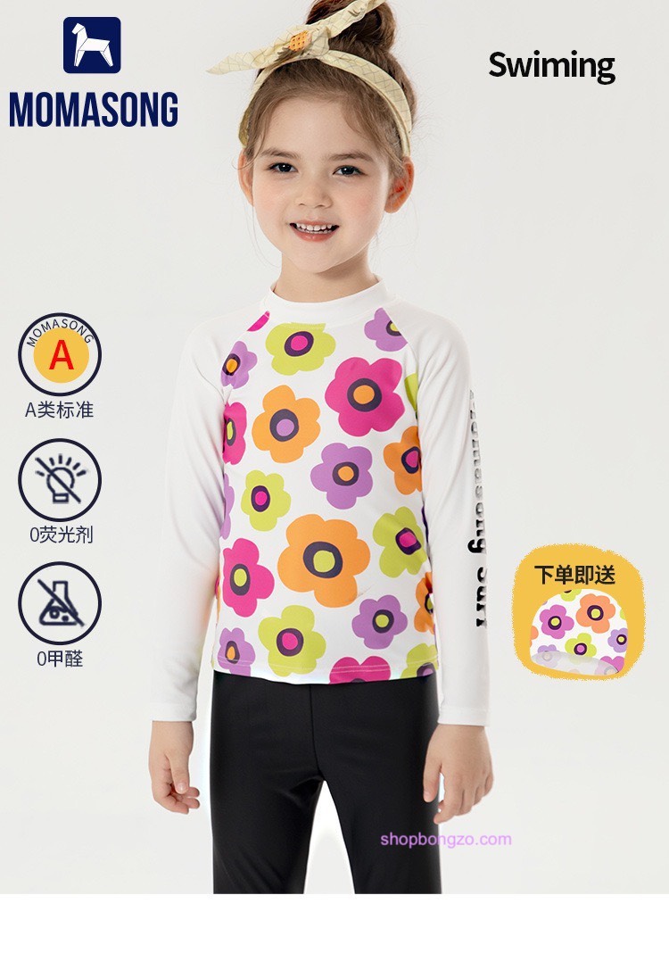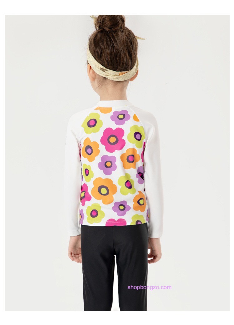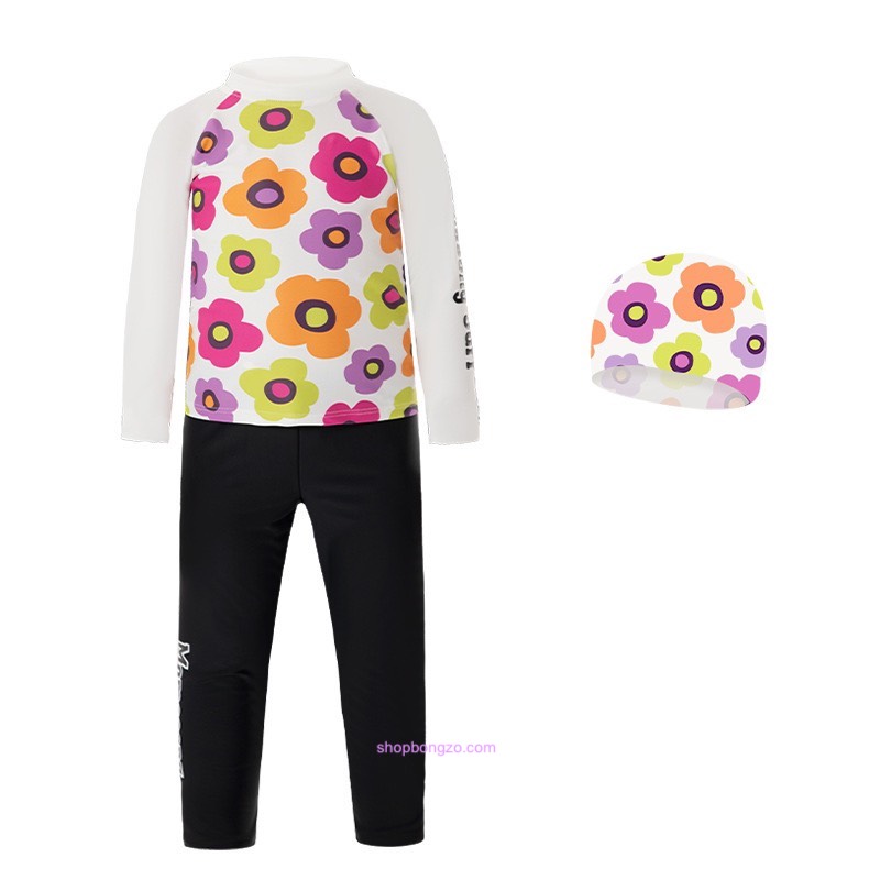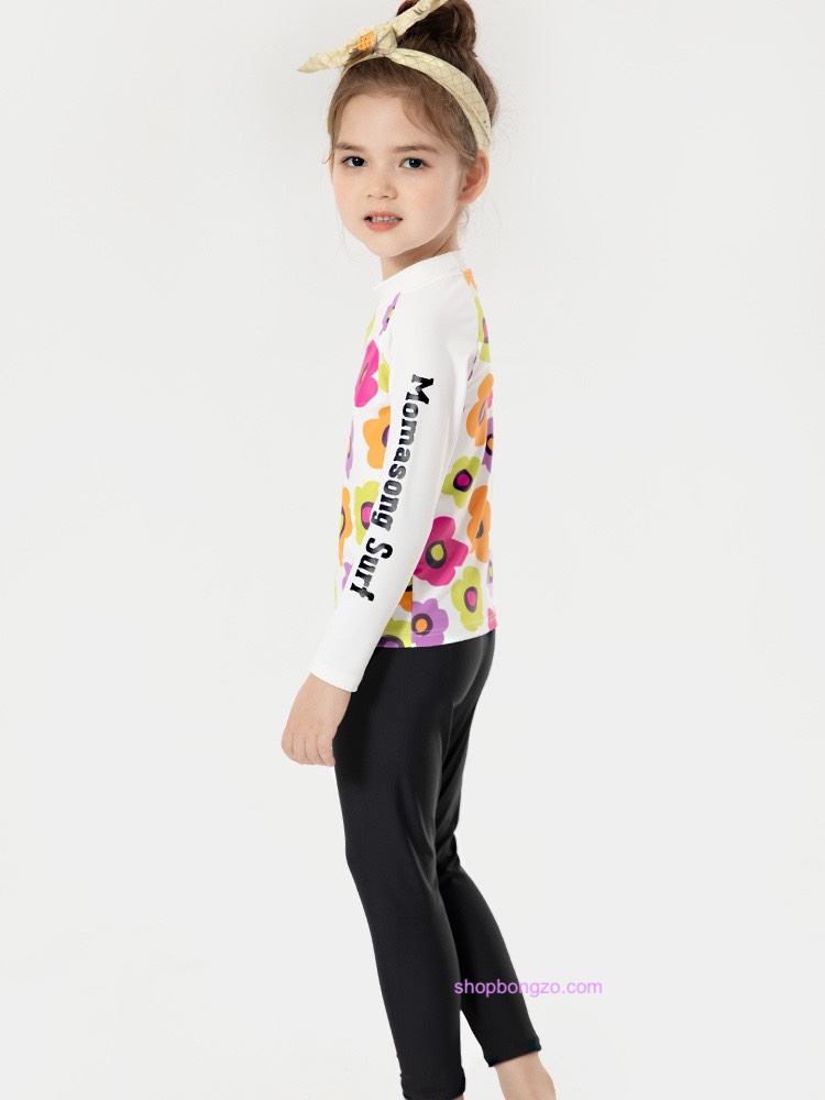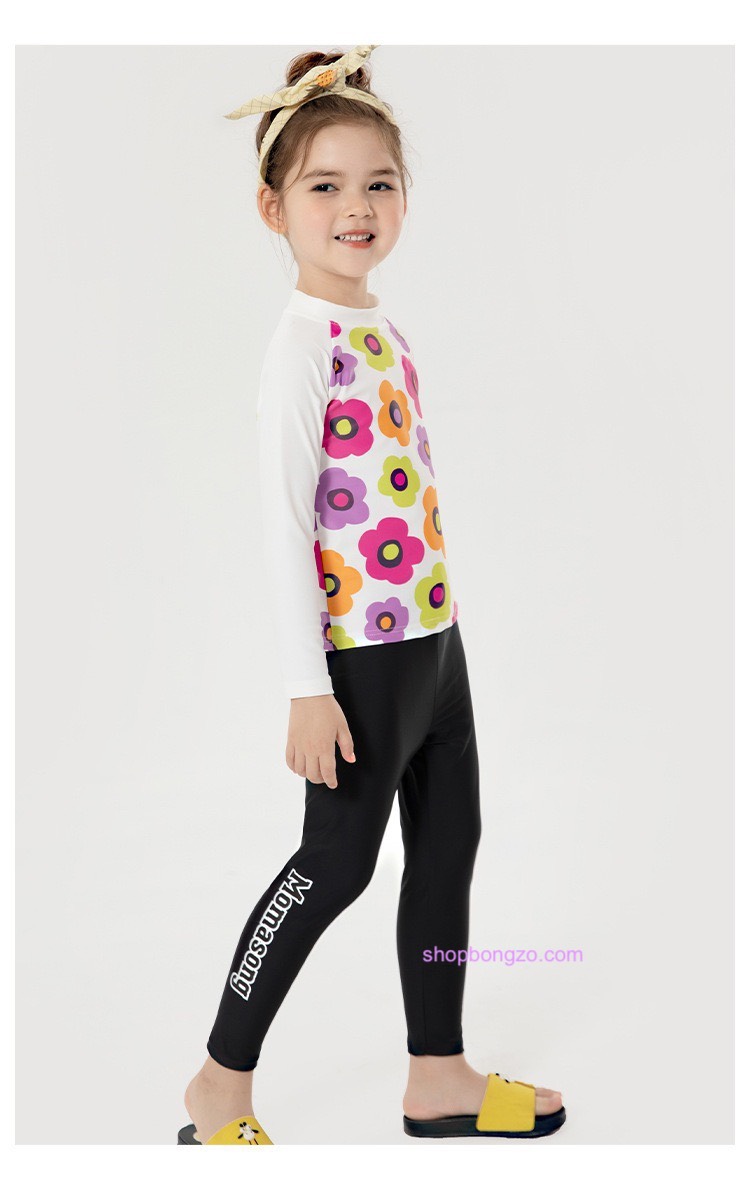 Bộ bơi bé gái dài rời, trắng hoa, quần đen dài, Momasong 907225