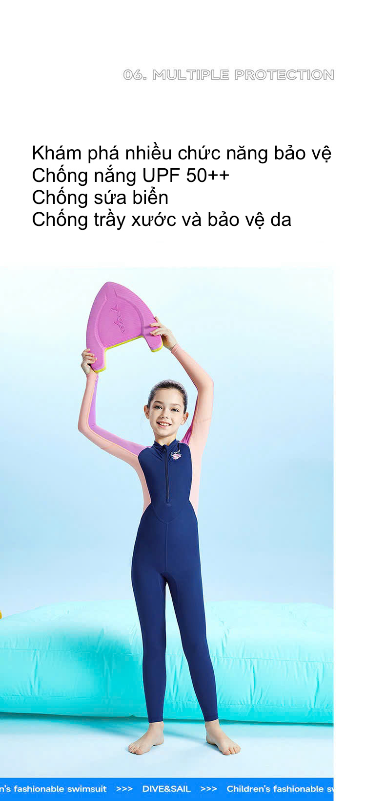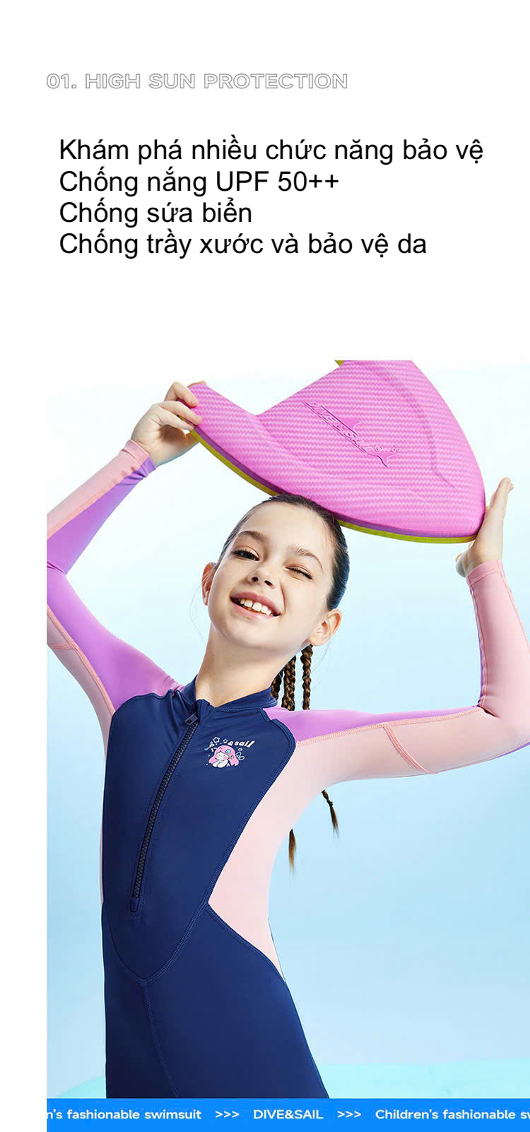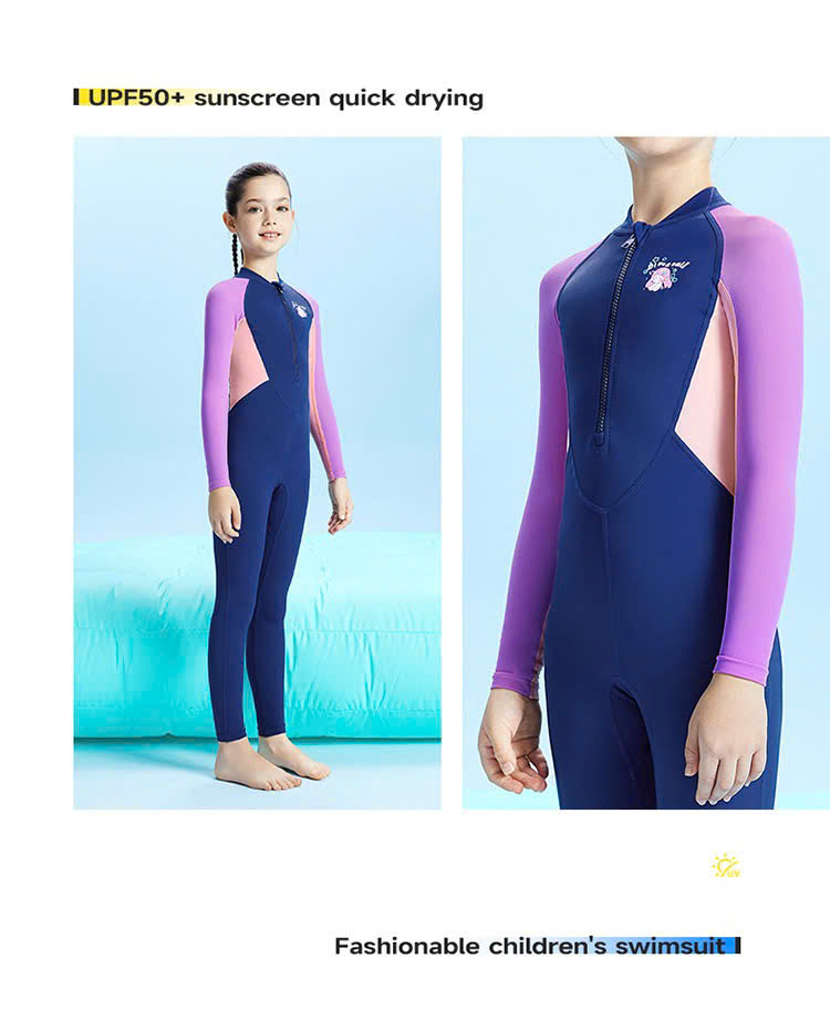 Bộ bơi 361 bé gái, dài tay chân, chống lạnh, chống nắng UPF 50+, bơi tắm biển, khoáng nóng, màu tím