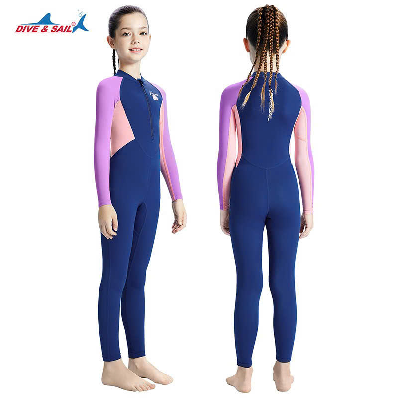Bộ bơi bé gái dài tay, màu than tím, vải chống nắng UPF 50++, Dive & Sail