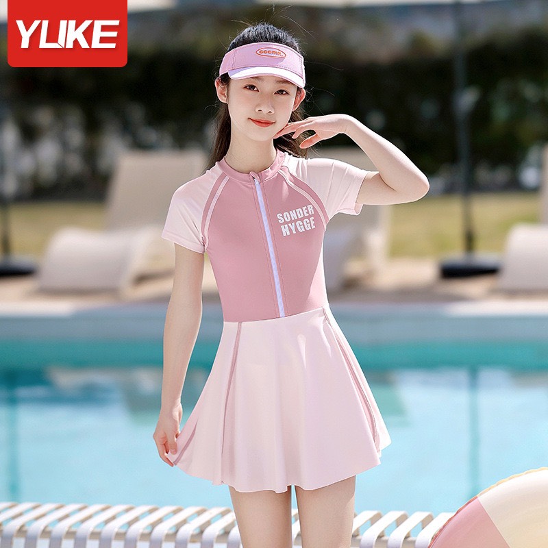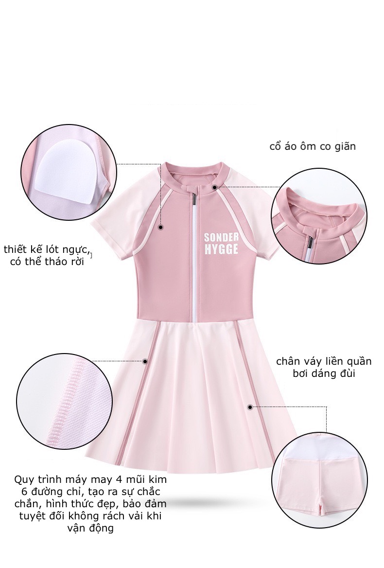 Bộ bơi bé gái hồng cộc chân váy, vải chống nắng, Sonder
