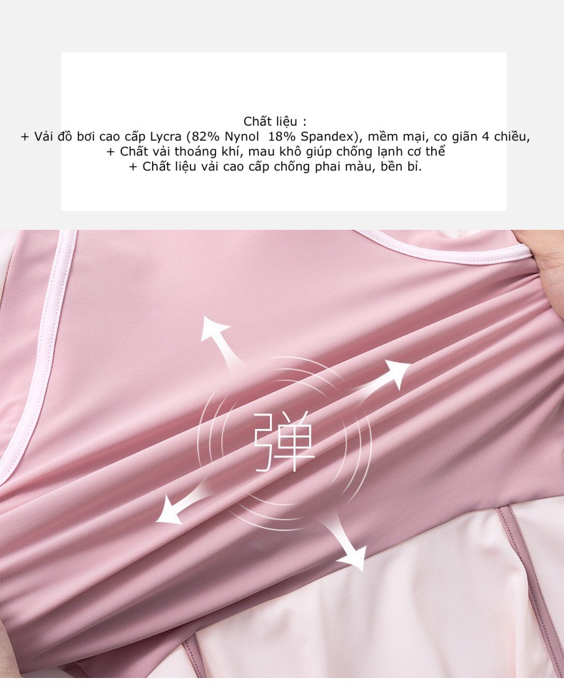 + Vải đồ bơi cao cấp Lycra (82% Nynol 18% Spandex), mềm mại, co giãn 4 chiều,