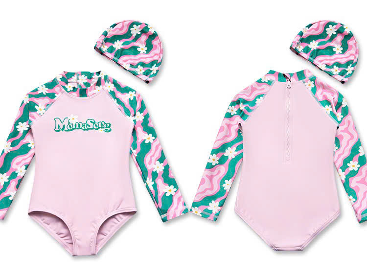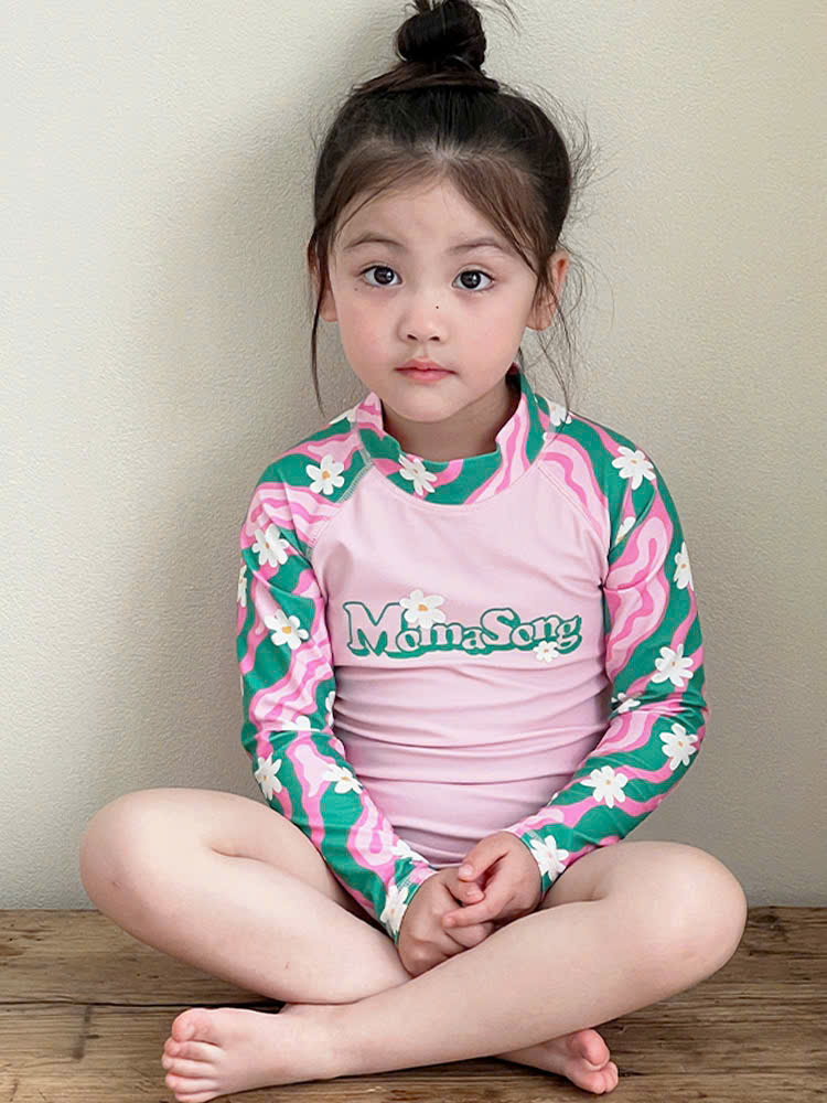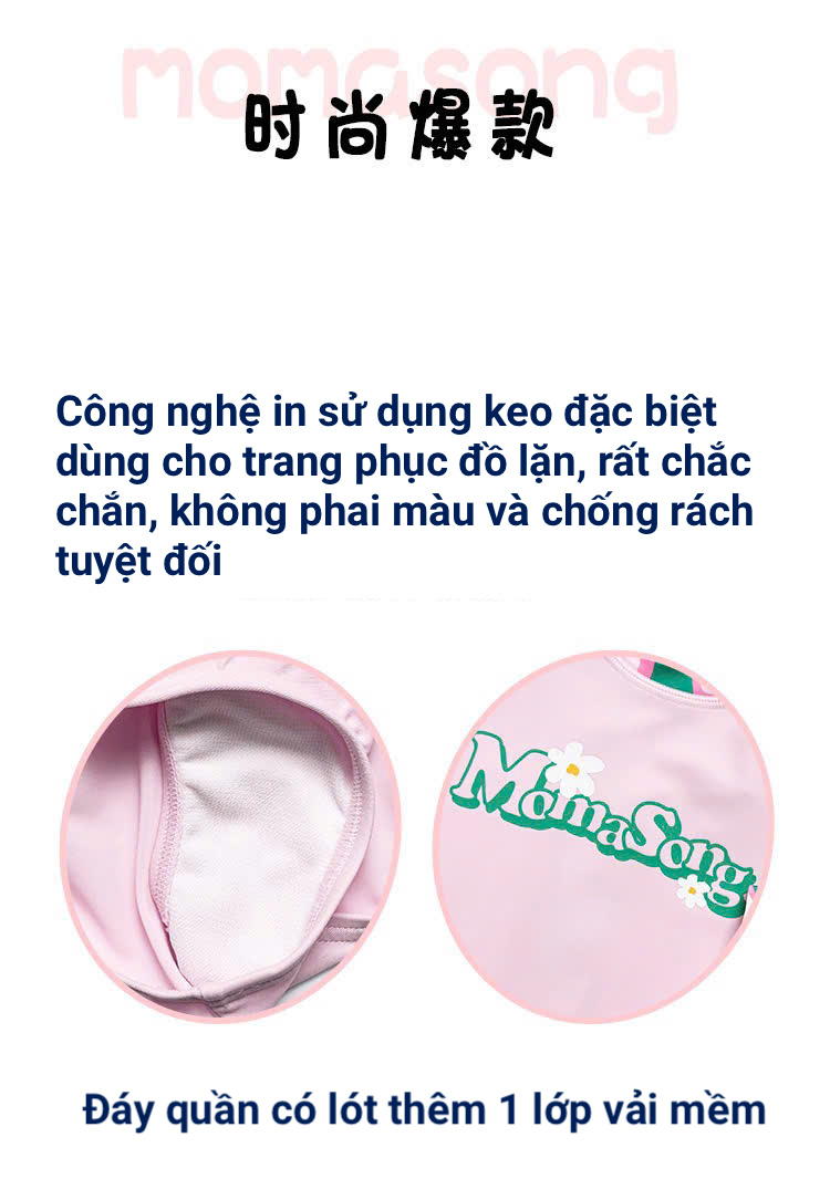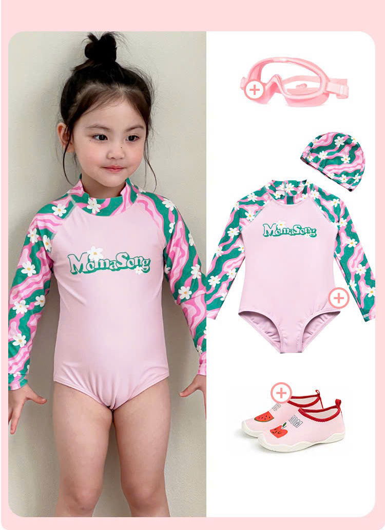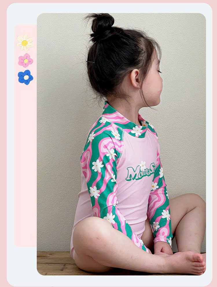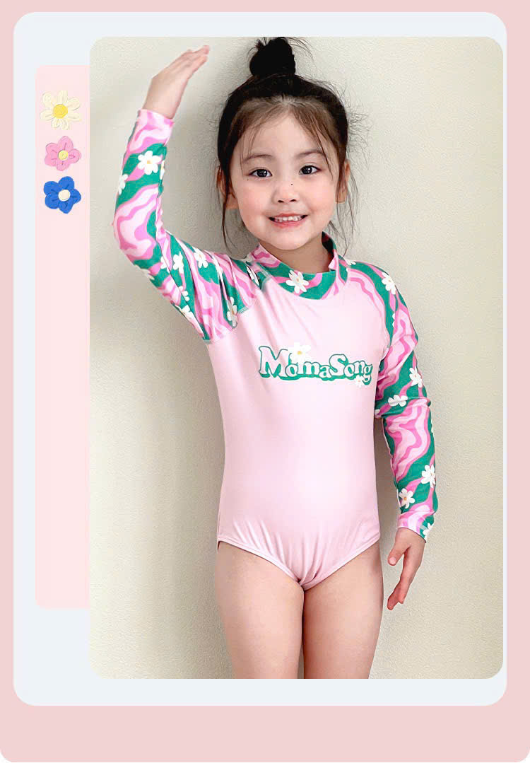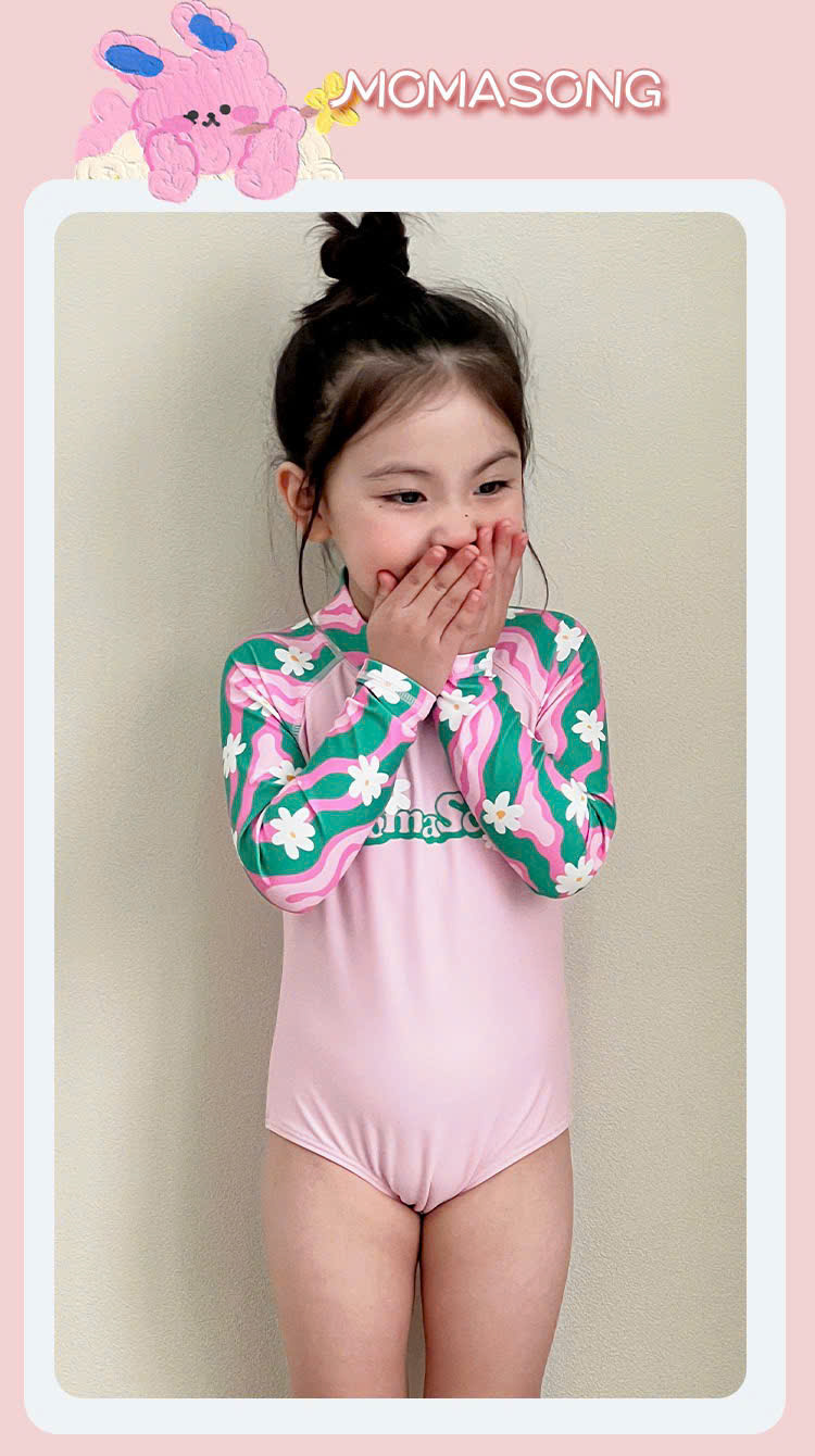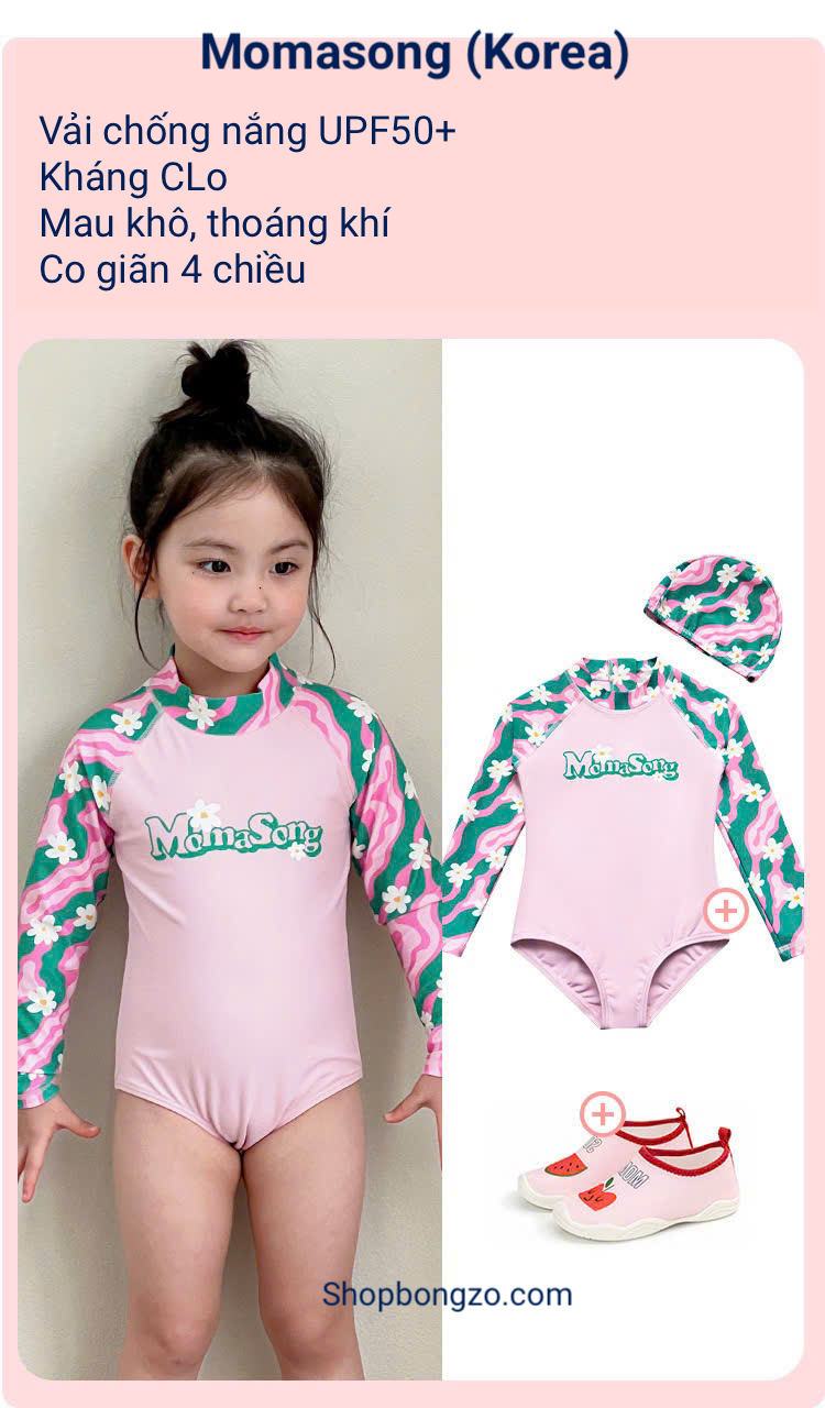 Bộ bơi bé gái hồng tay xanh, vải chống nắng chống Clo, dài tay, Momasong(Korea)