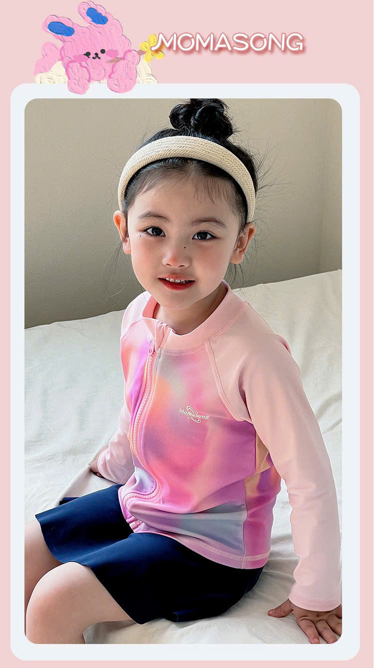 Bộ bơi bé gái dài tay, vải chống nắng UPF 50+ Momasong (Korea), hồng trắng