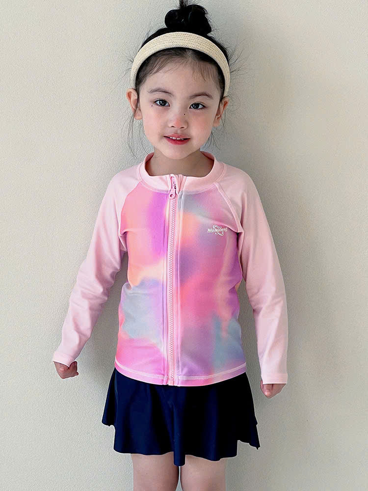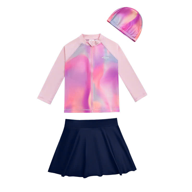 Bộ bơi bé gái màu hồng, dài tay kéo khoá, chân váy, vải UPF 50++, Momasong(Korea)