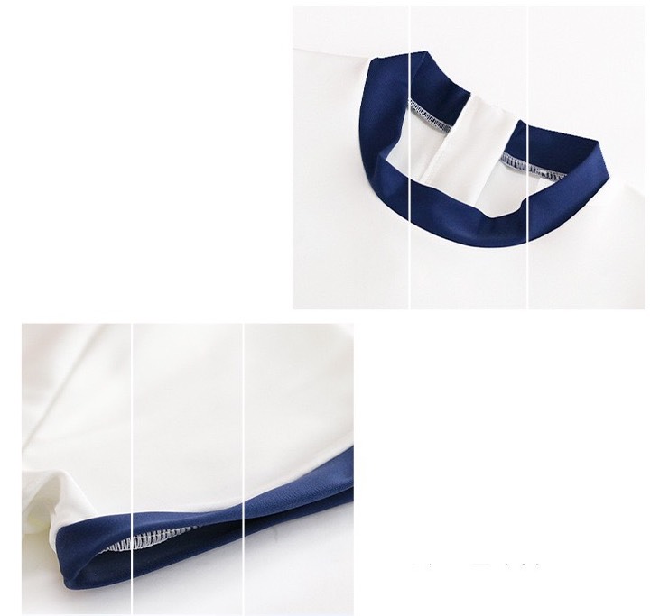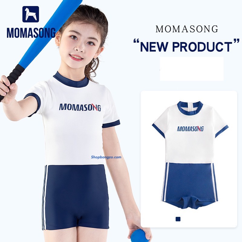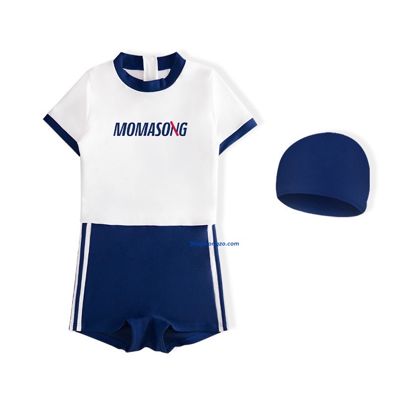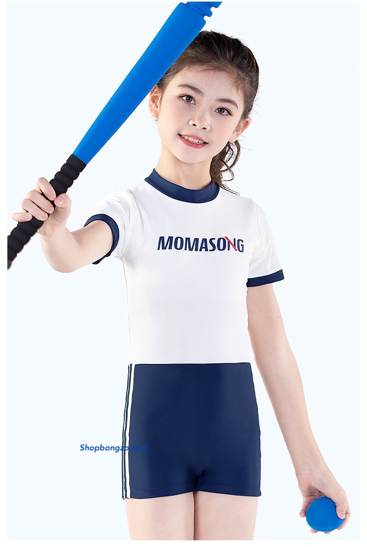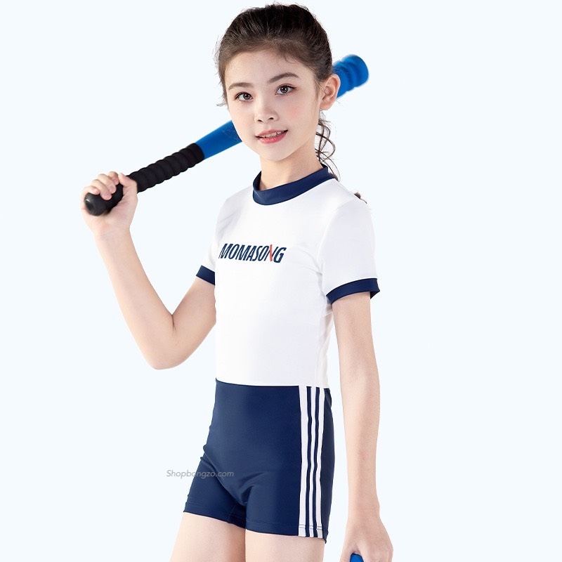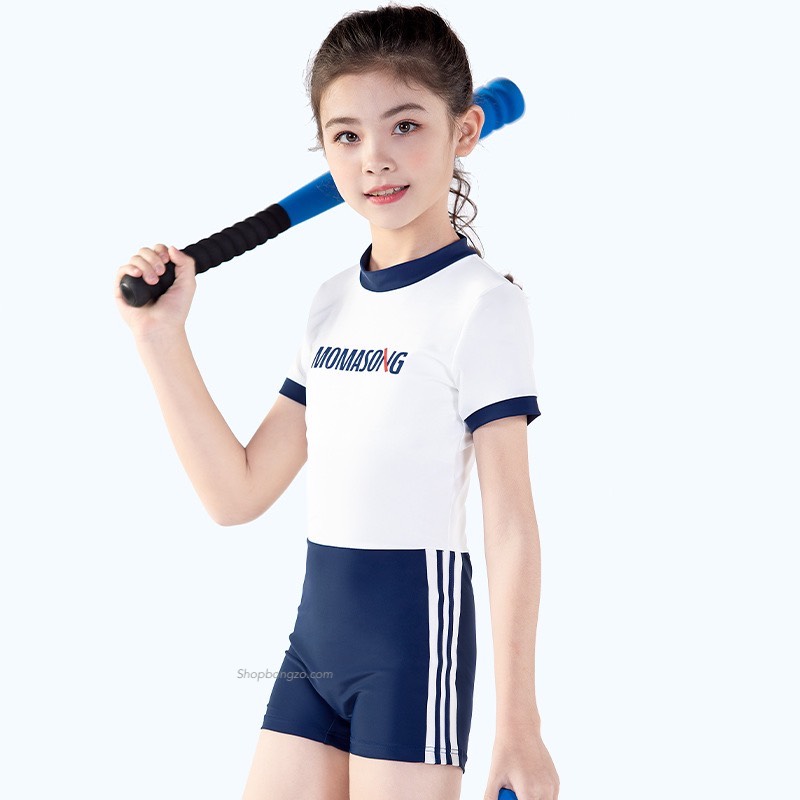 Bộ bơi bé gái trắng cộc tay, quần xanh than, vải chống nắng, Momasong