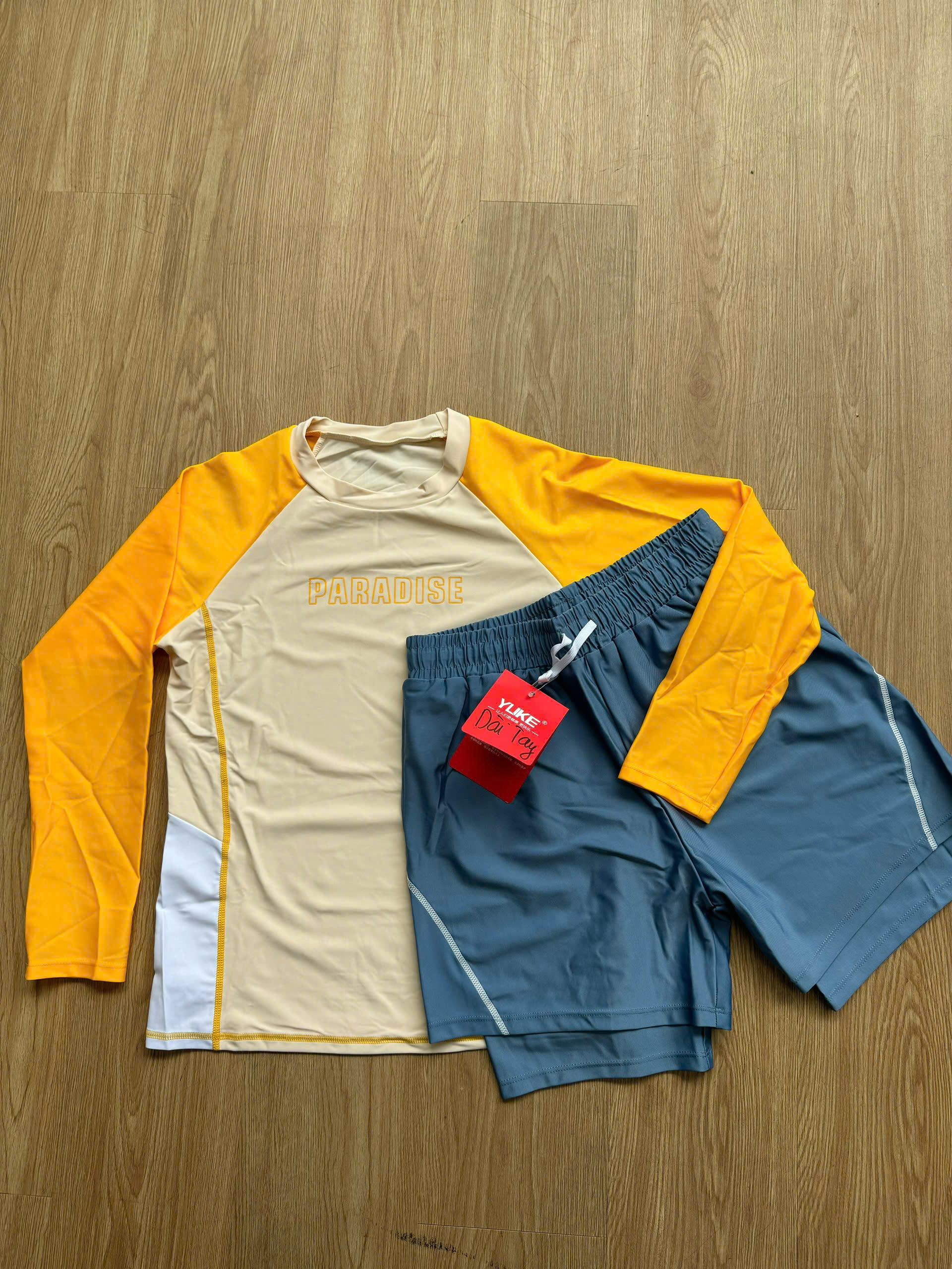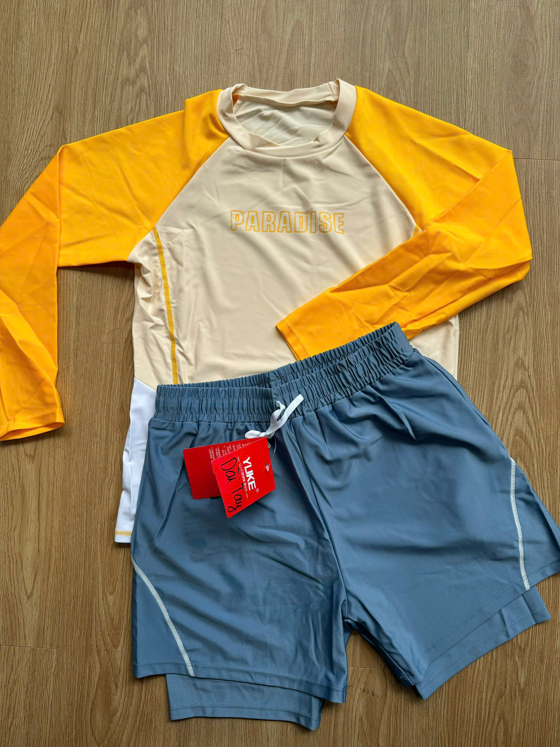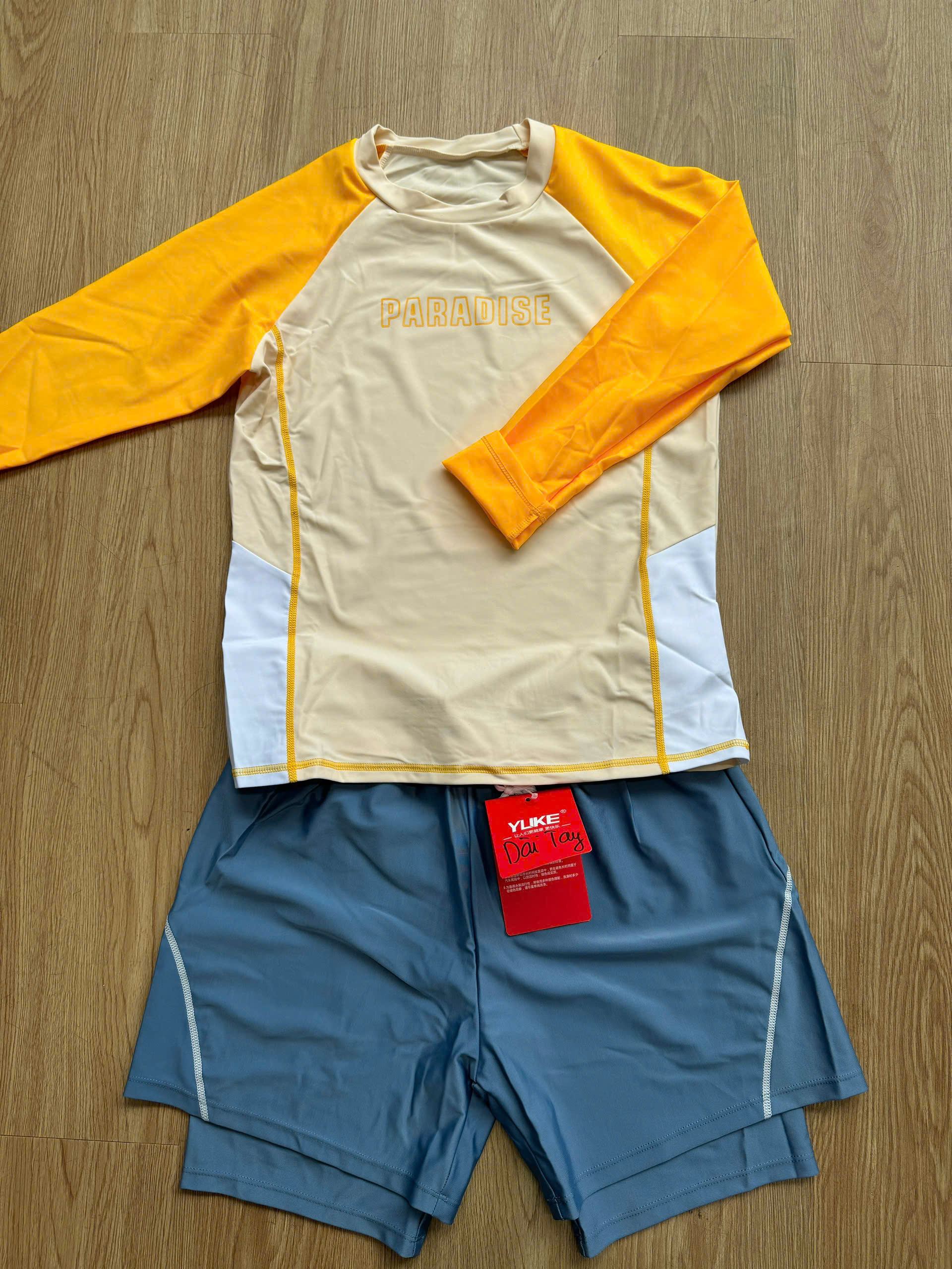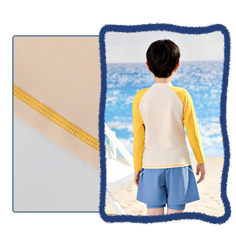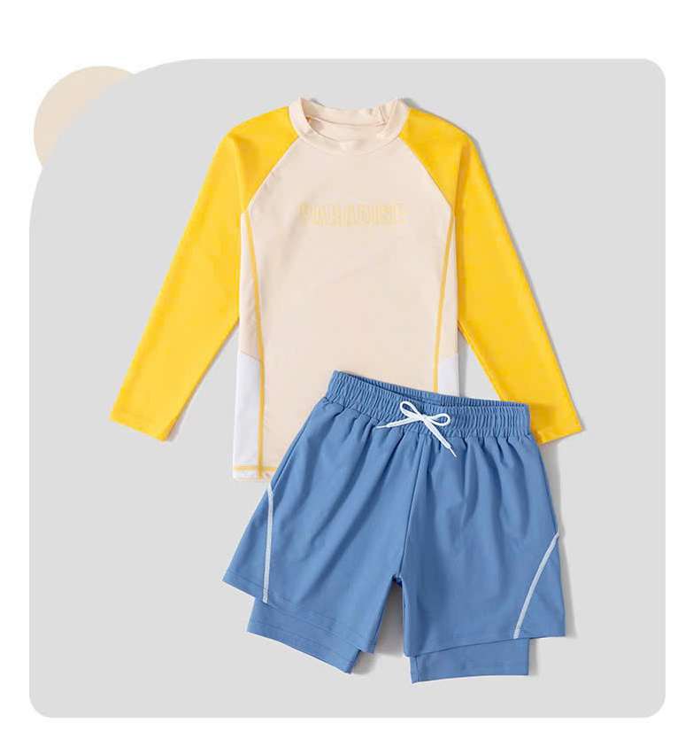 Bộ bơi bé trai chống nắng UPF50+, màu trắng tay vàng, dài tay, Paradise, YUKE