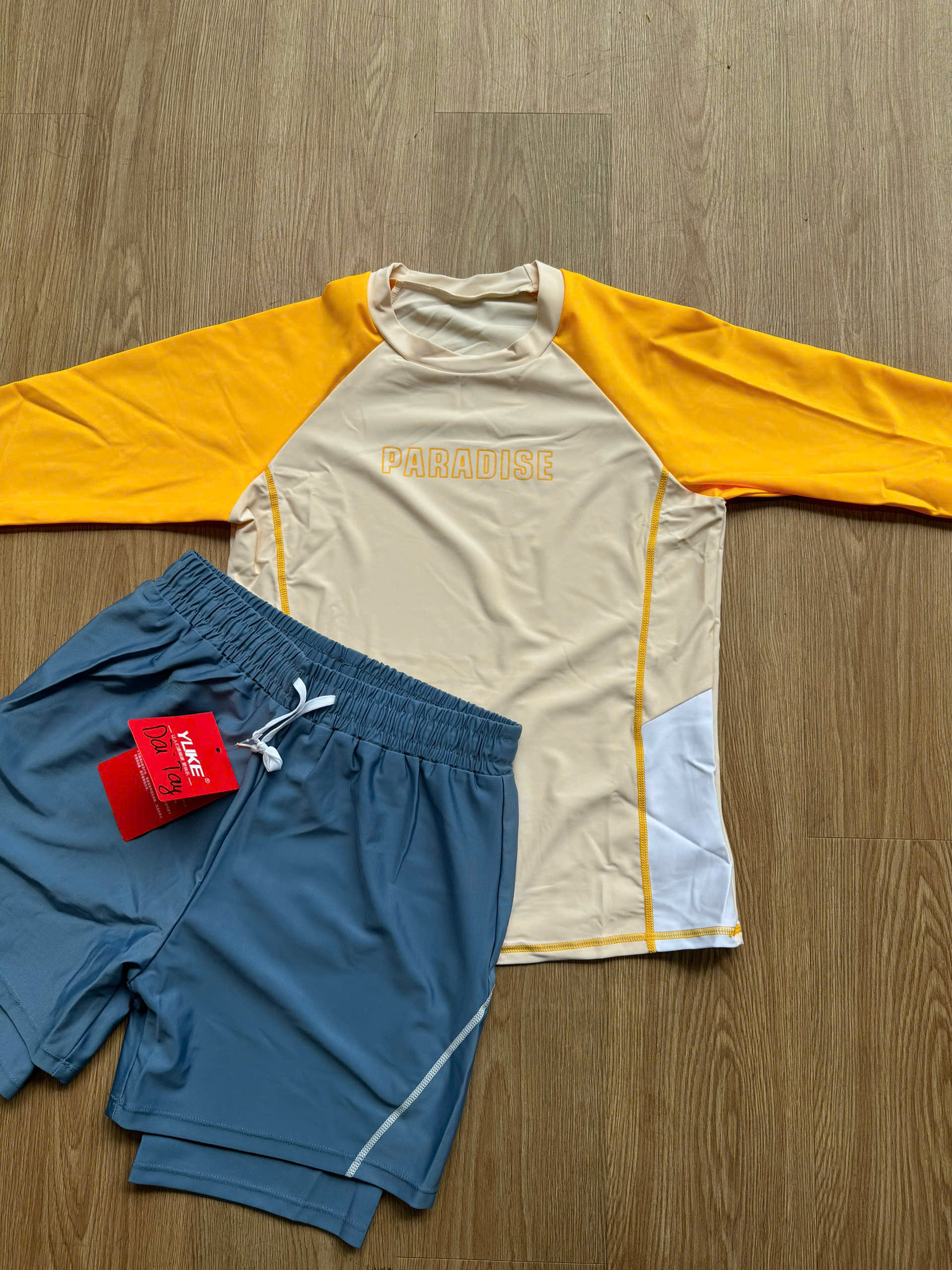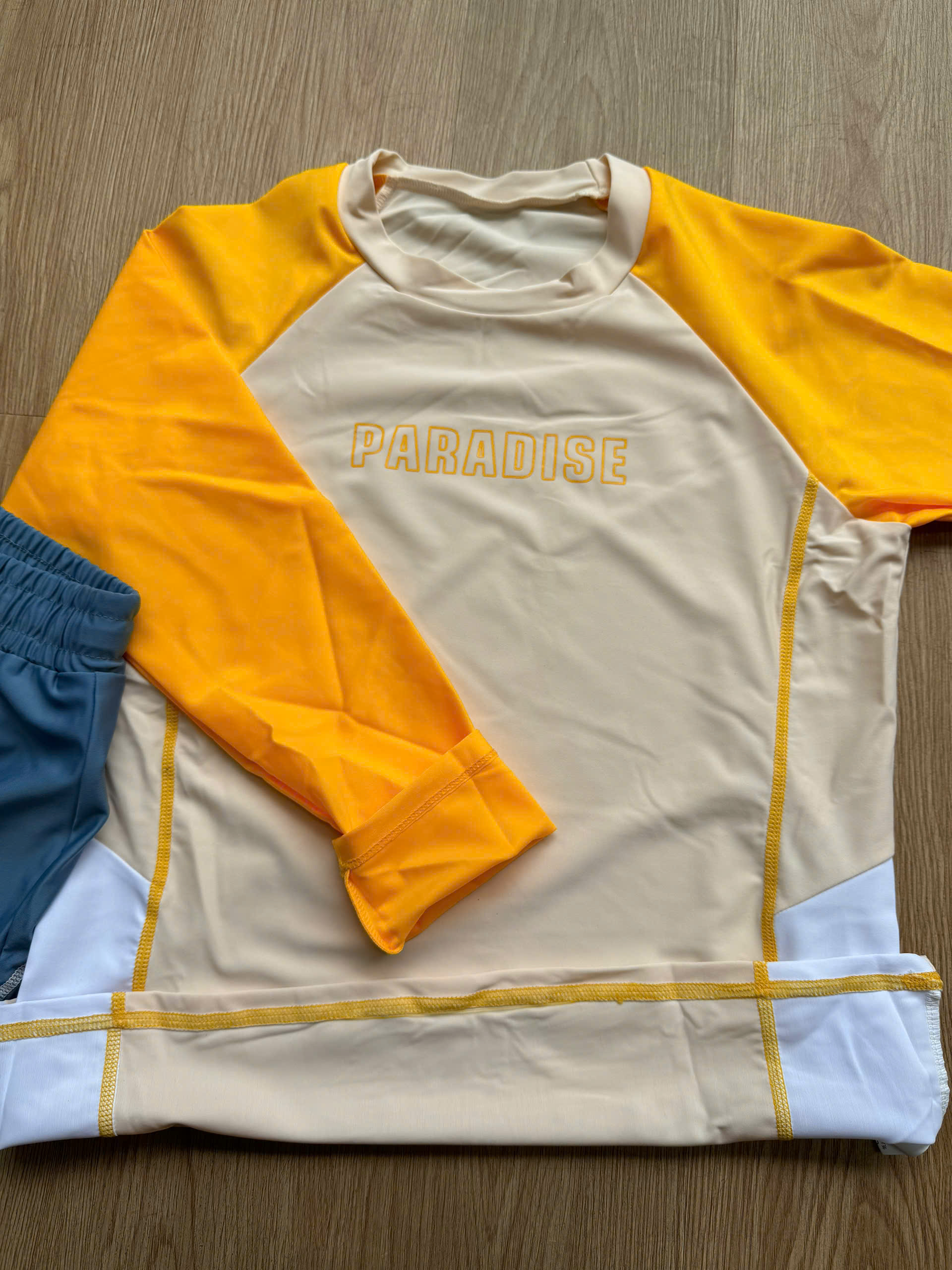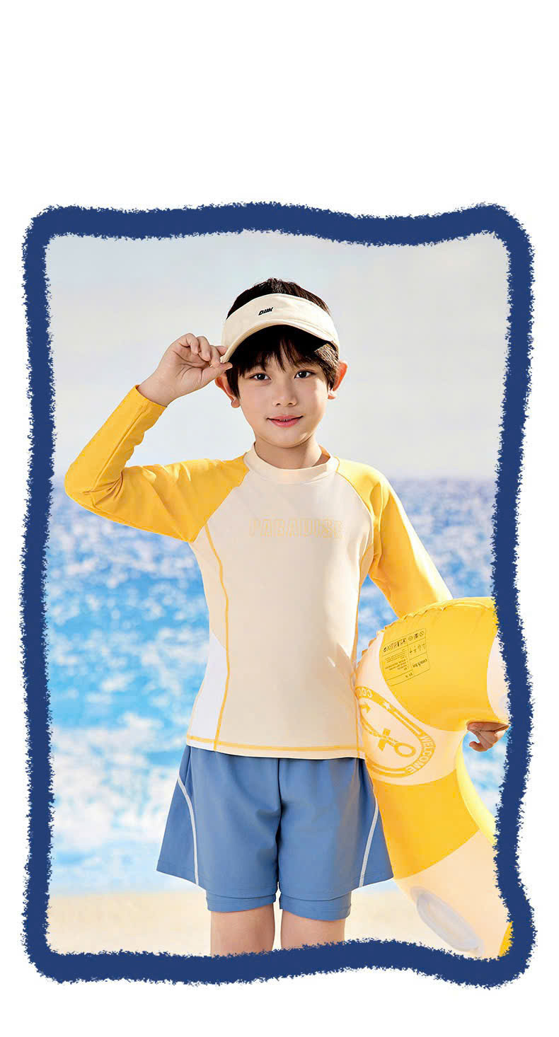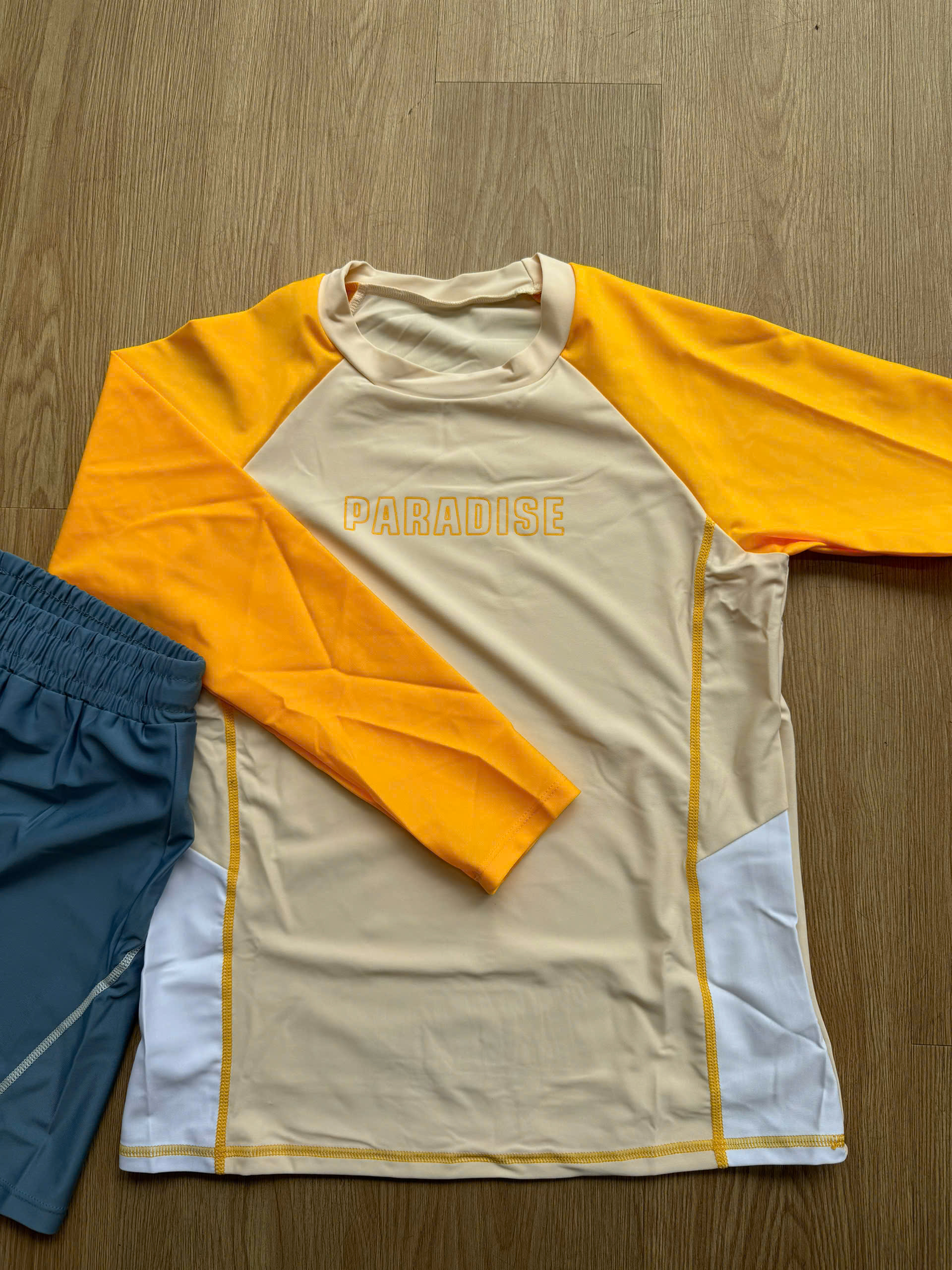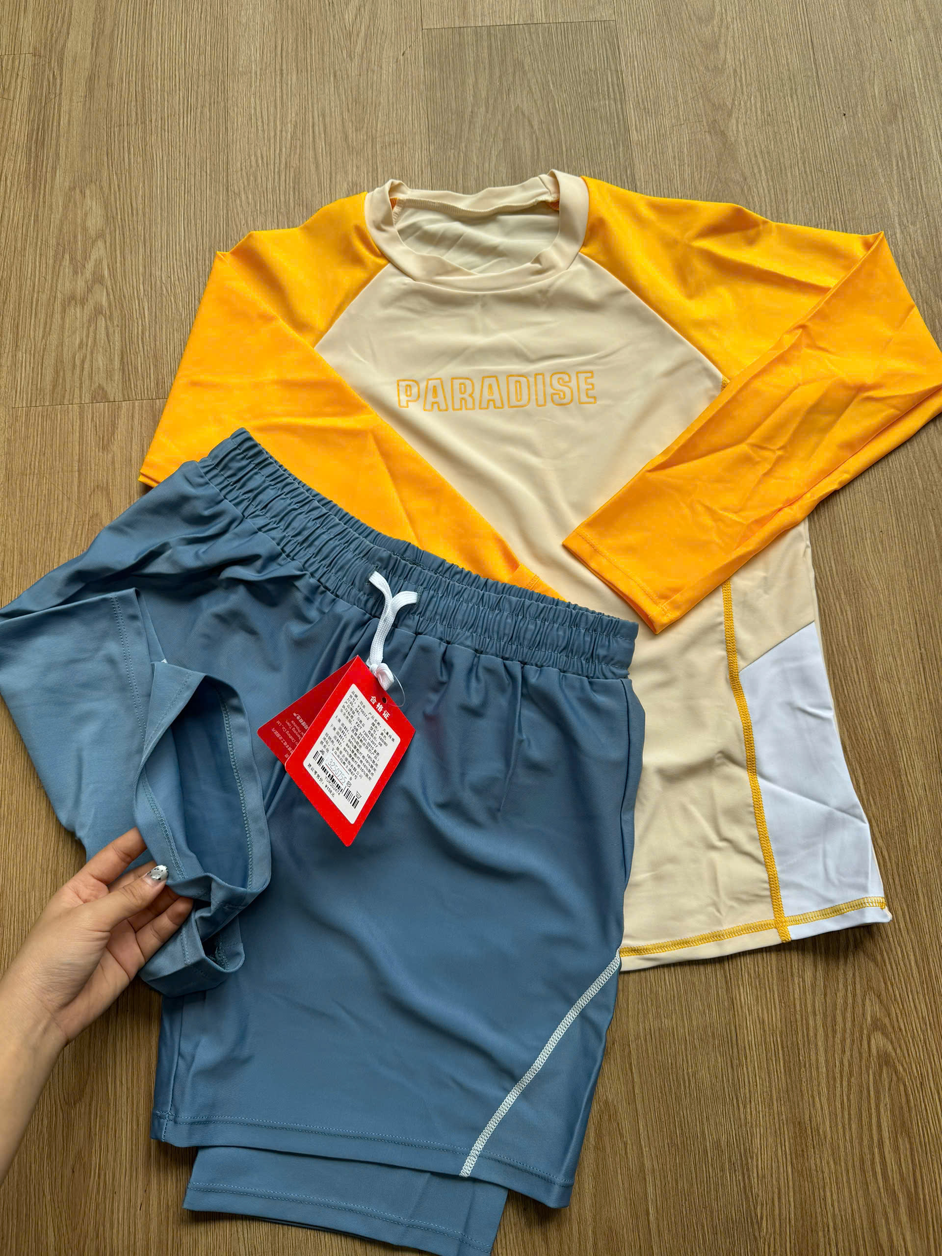 Bộ bơi bé trai chống nắng UPF50+, màu trắng tay vàng, dài tay, Paradise, YUKE