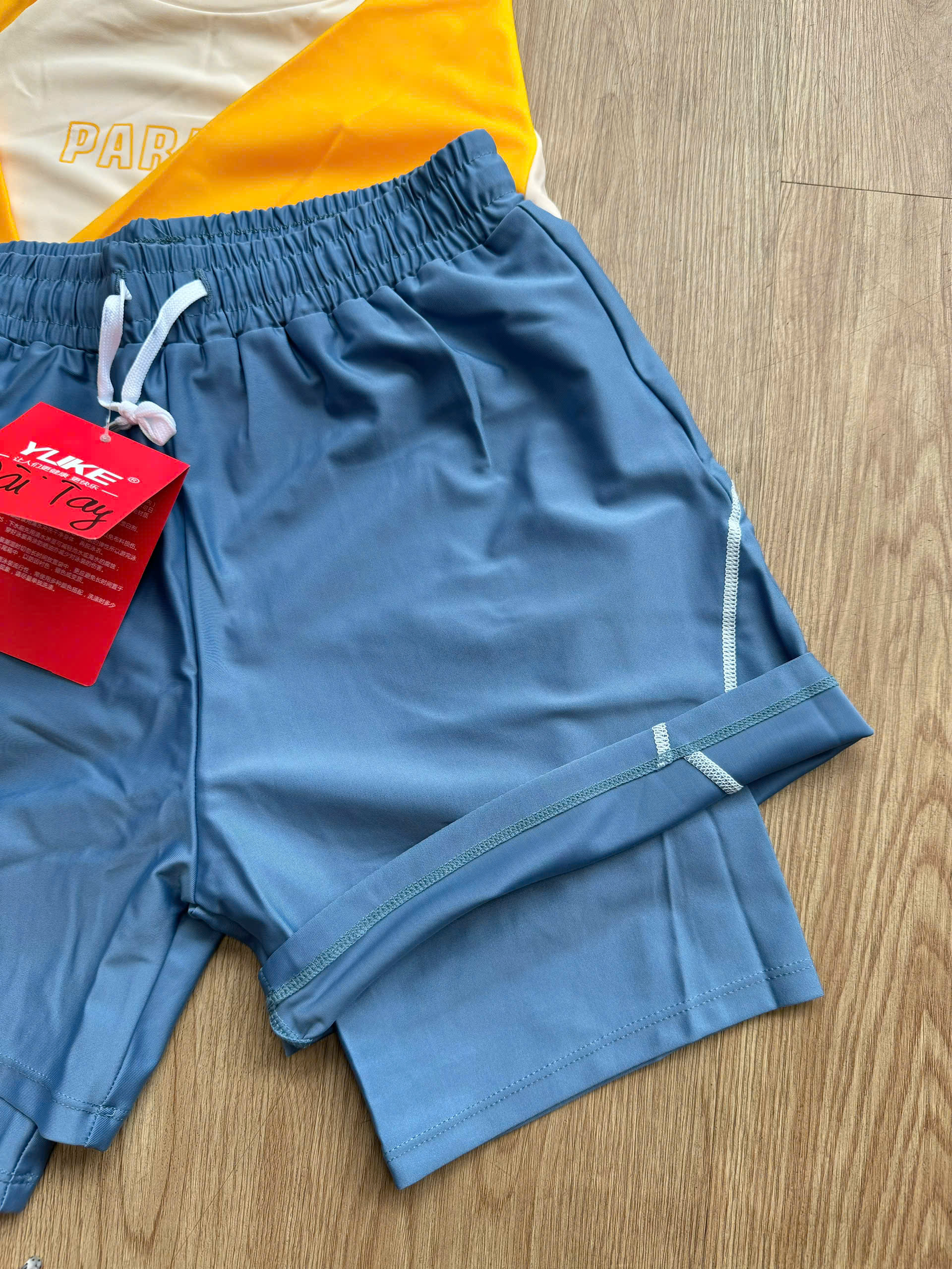 Bộ bơi dài vải chống nắng UPF 50+, dáng quần 2 lớp, màu xanh, Yuke