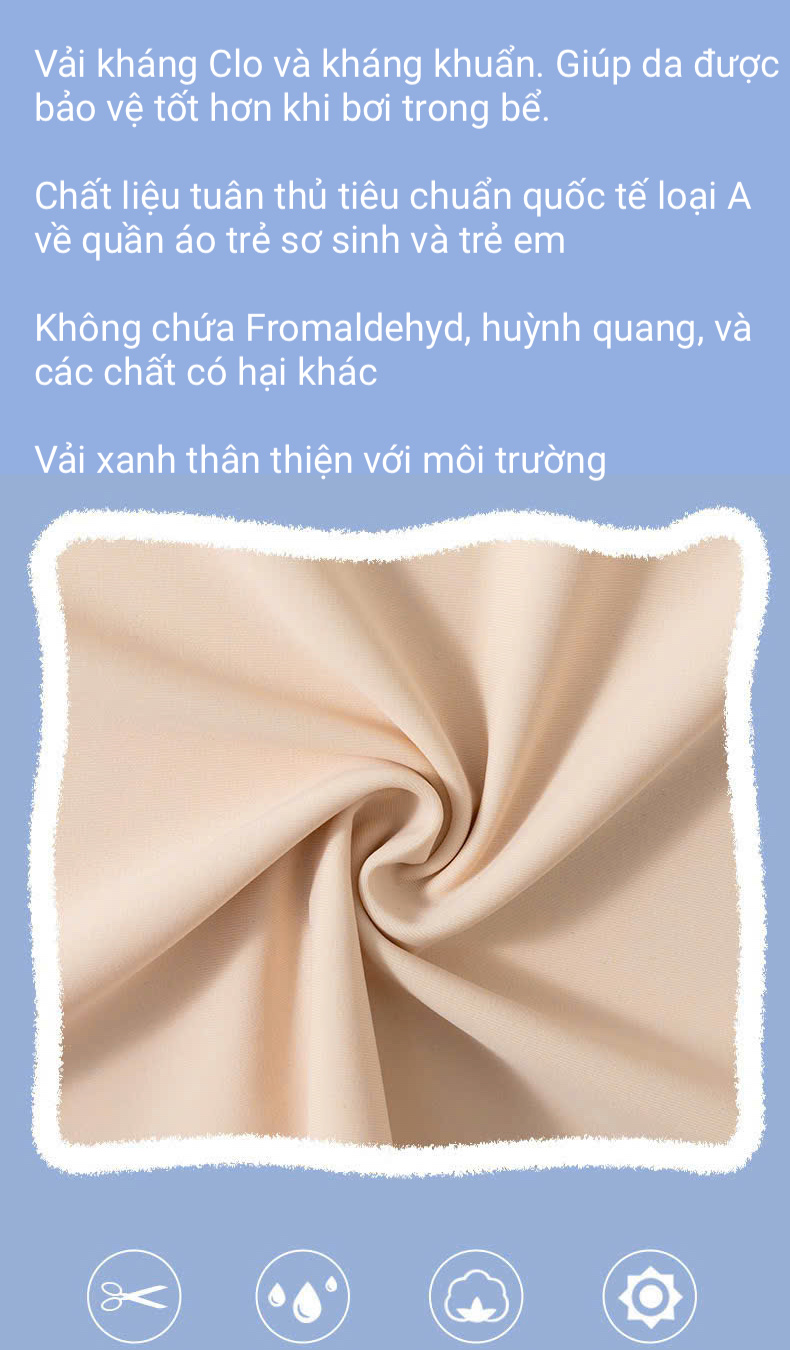 - Vải kháng Clo và kháng khuẩn. Giúp da được bảo vệ tốt hơn khi bơi trong bể.