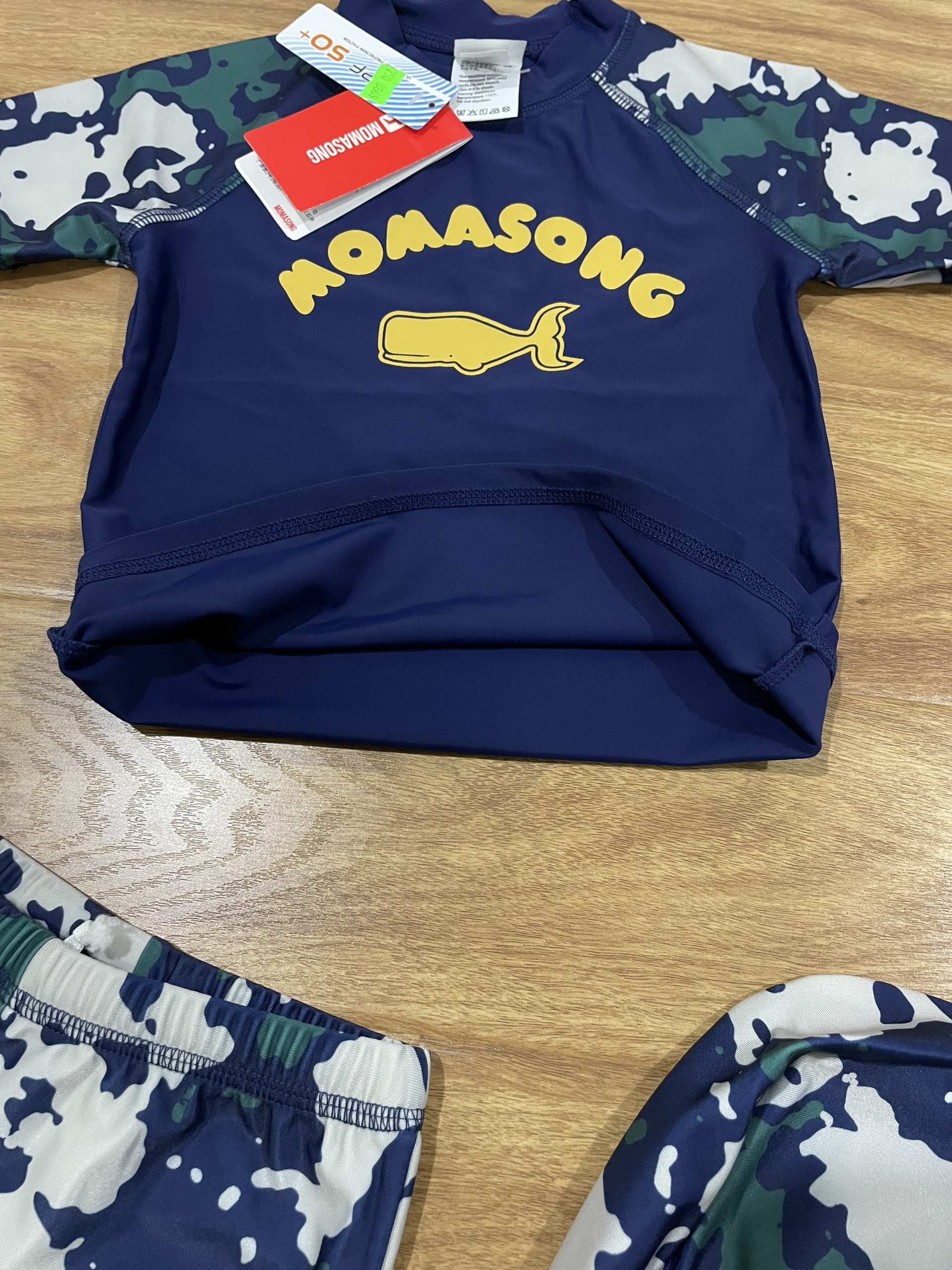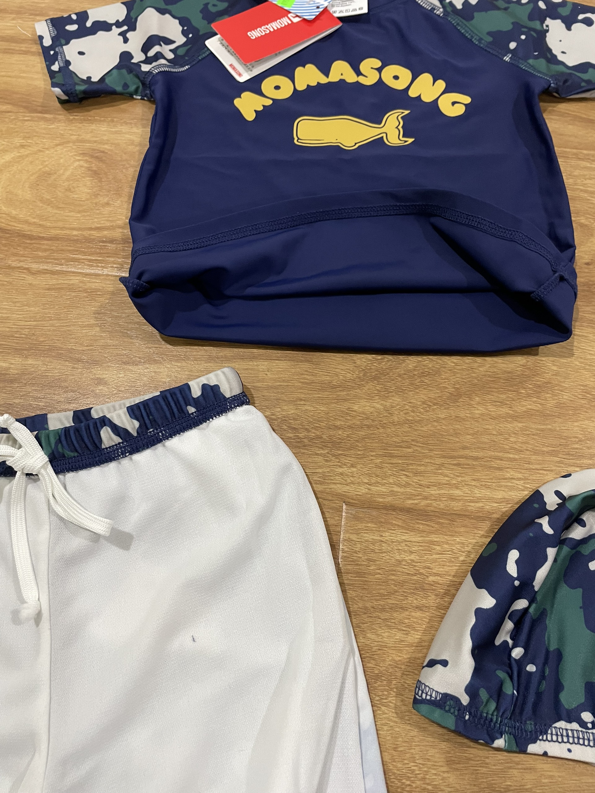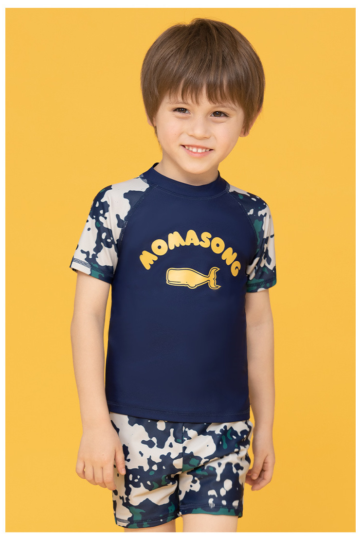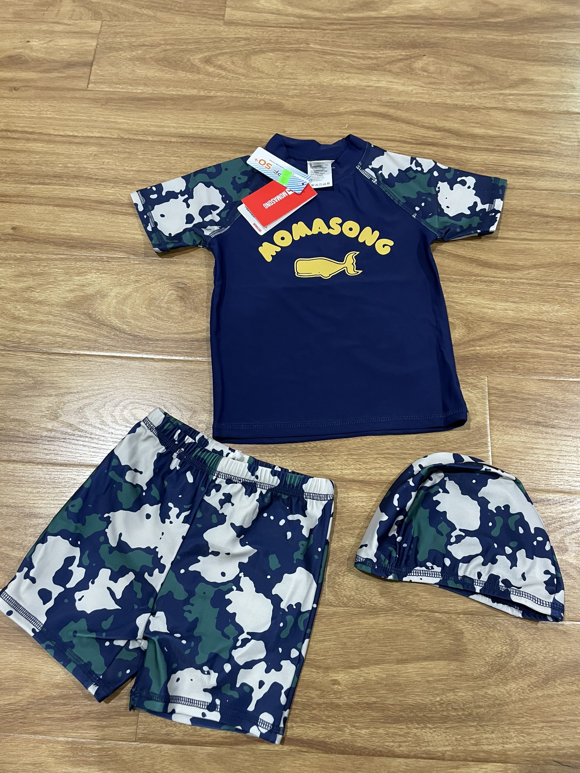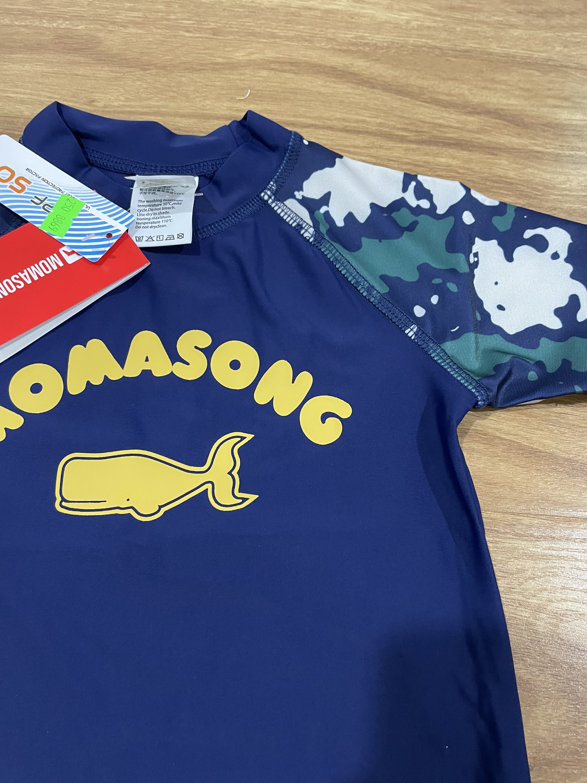 Bộ bơi bé trai cộc tay dáng rời, xanh rằn ri, vải chống nắng UPF 50++, Momasong (Korea)