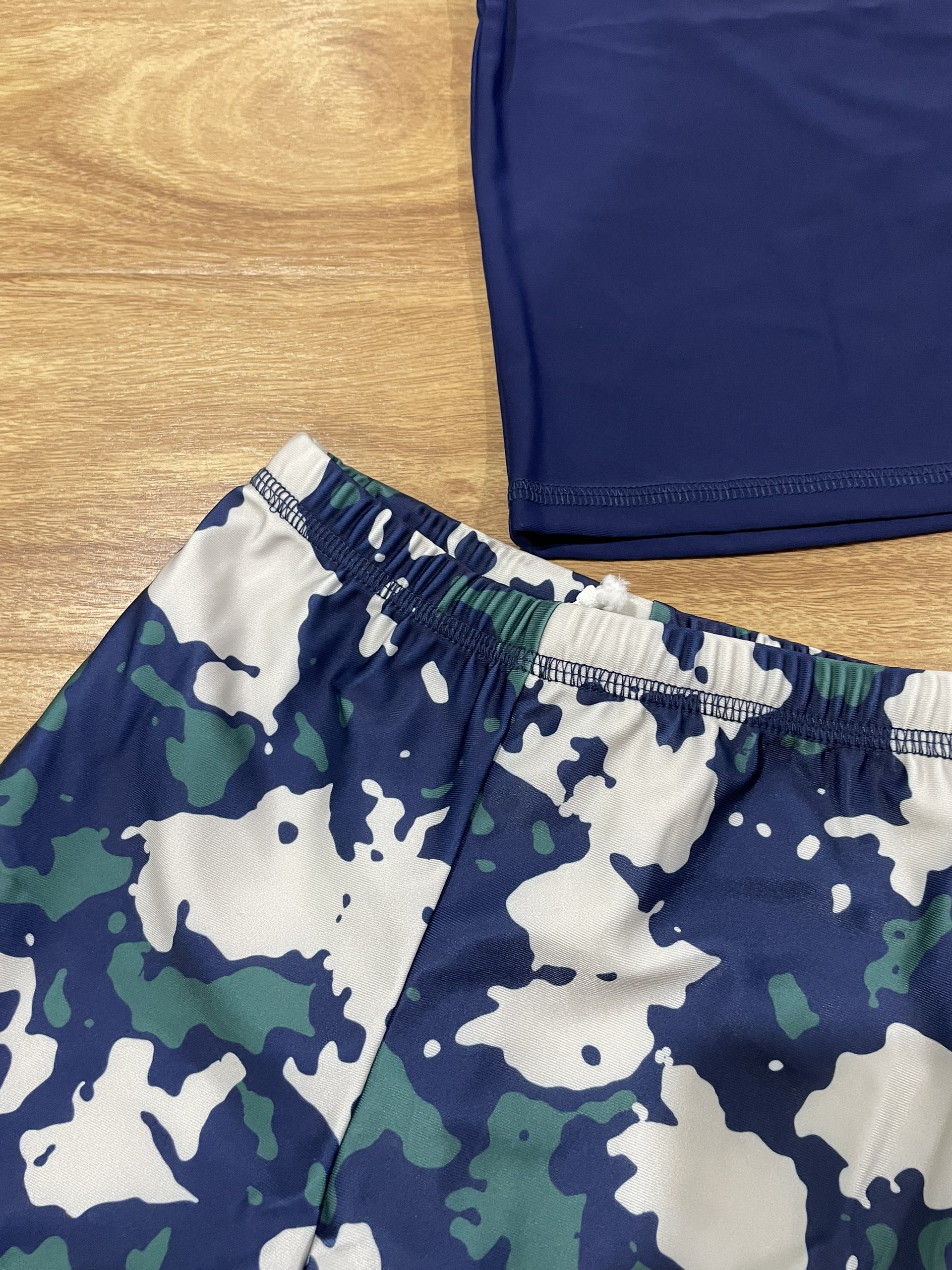 Bộ bơi cộc tay bé trai, màu trắng xanh, quần 2 lớp, chống nắng UPF 50+, YUKE
