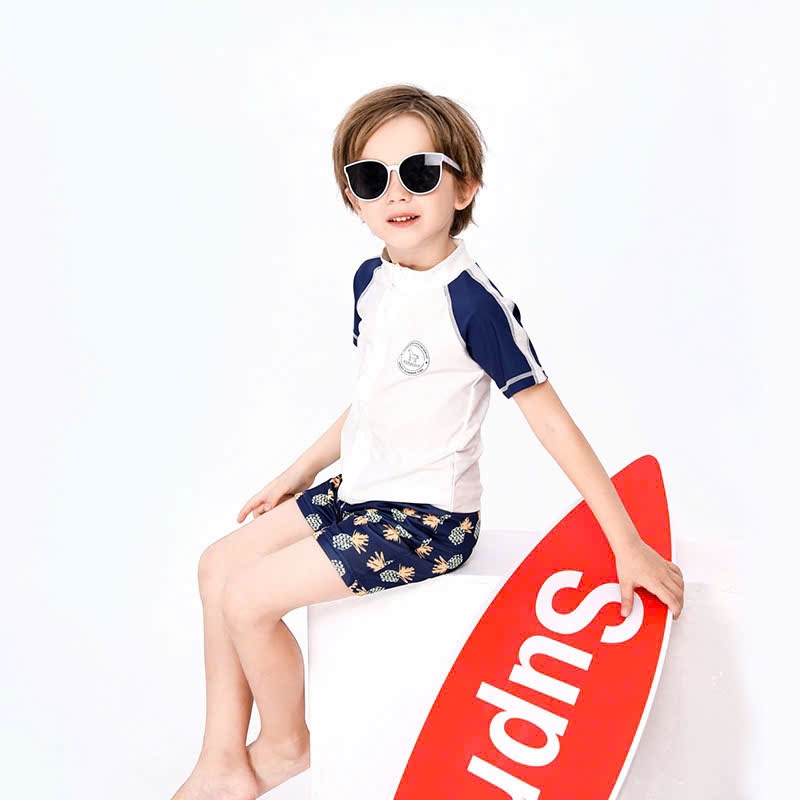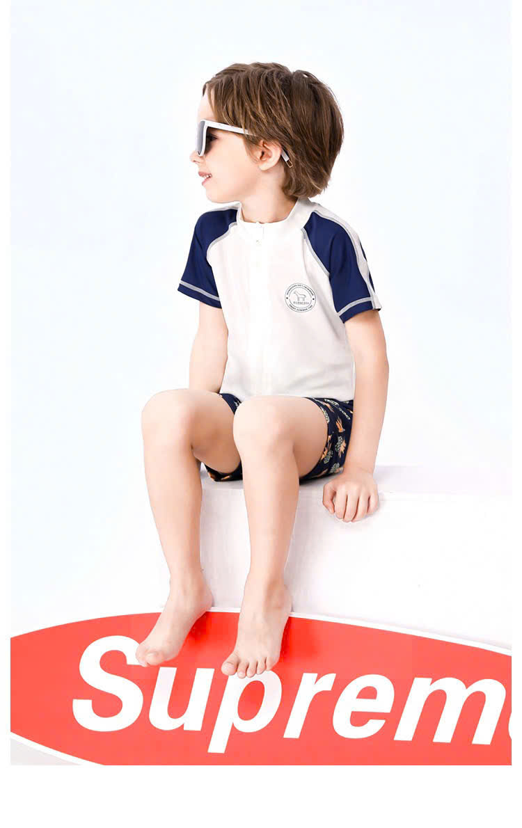 Bộ bơi cộc tay bé trai, màu trắng xanh, quần 2 lớp, chống nắng UPF 50+, YUKE