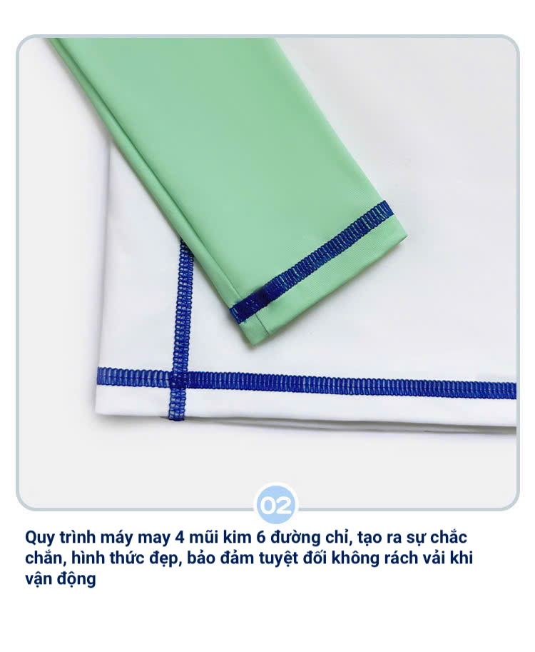 + Quy trình máy may 4 mũi kim 6 đường chỉ, tạo ra sự chắc chắn, hình thức đẹp, bảo đảm tuyệt đối không rách vải khi vận động