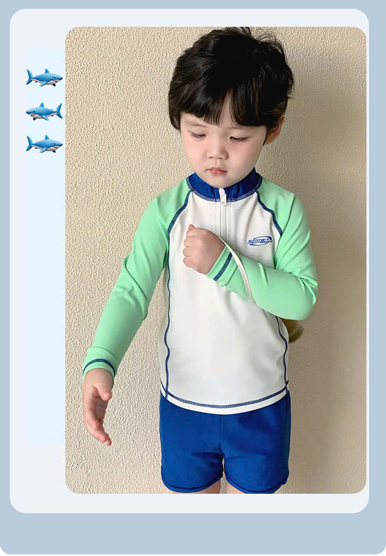 Bộ bơi bé trai dài tay, trắng tay xanh, vải chống nắng chống clo, Momasong(Korea)