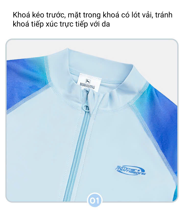 Bộ bơi bé trai vải chống nắng chống clo, màu xanh dài tay, kéo khoá Momasong(Korea)