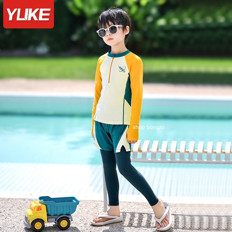 Bộ bơi bé trai chống nắng UPF50+, màu trắng tay vàng, dài tay, Paradise, YUKE
