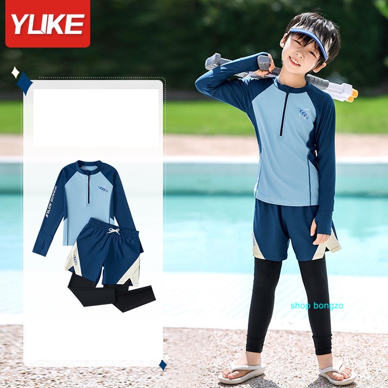 Bộ bơi dài vải chống nắng UPF 50+, dáng quần 2 lớp, màu xanh, Yuke