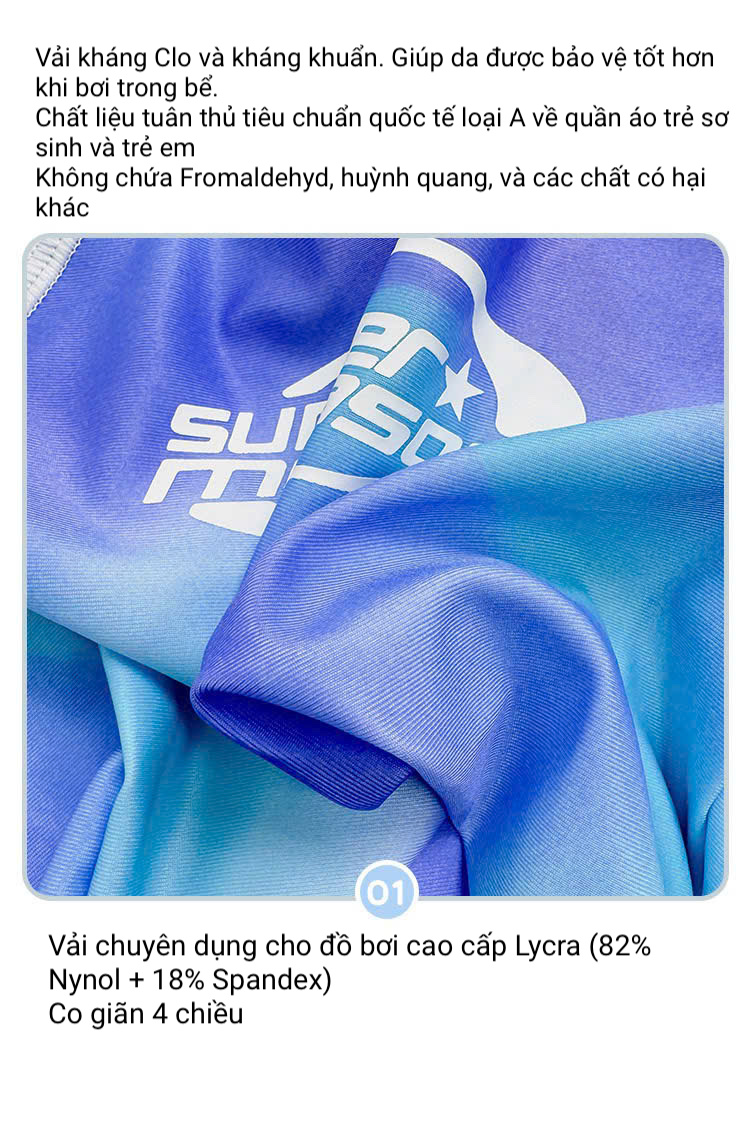 - Vải kháng Clo và kháng khuẩn. Giúp da được bảo vệ tốt hơn khi bơi trong bể.