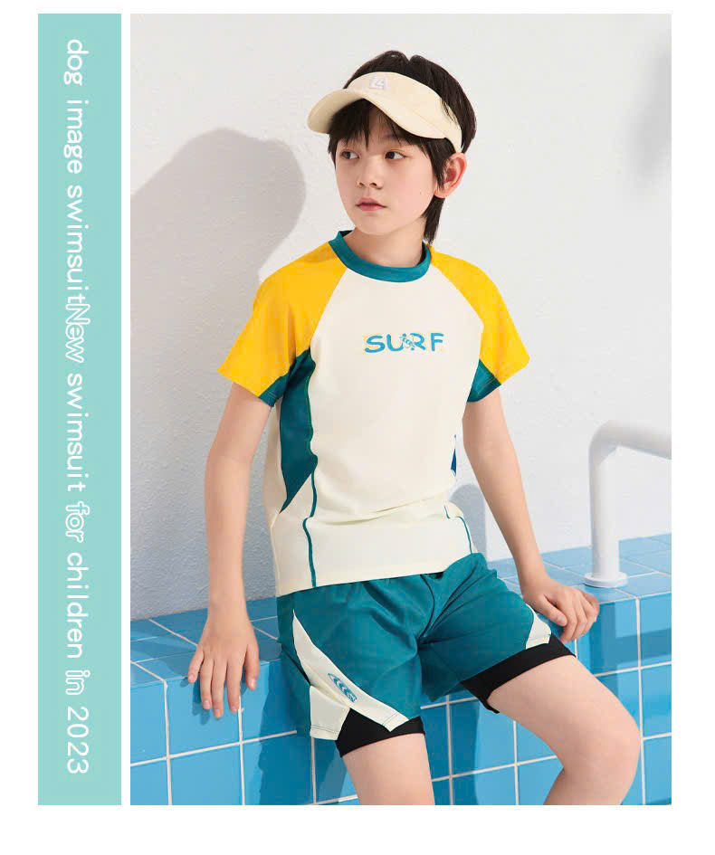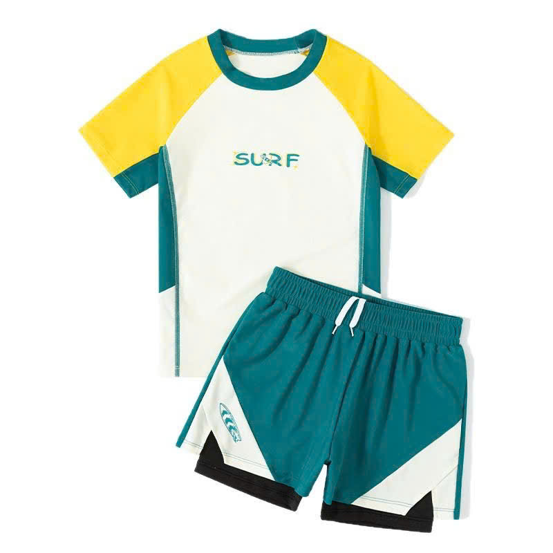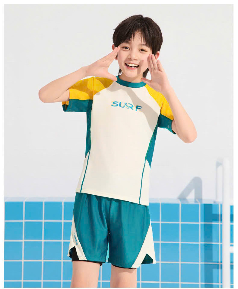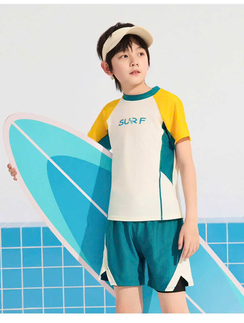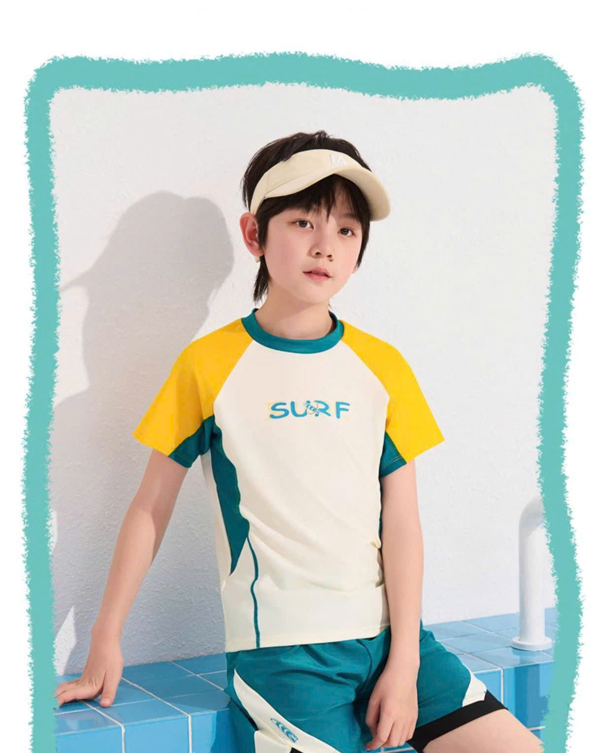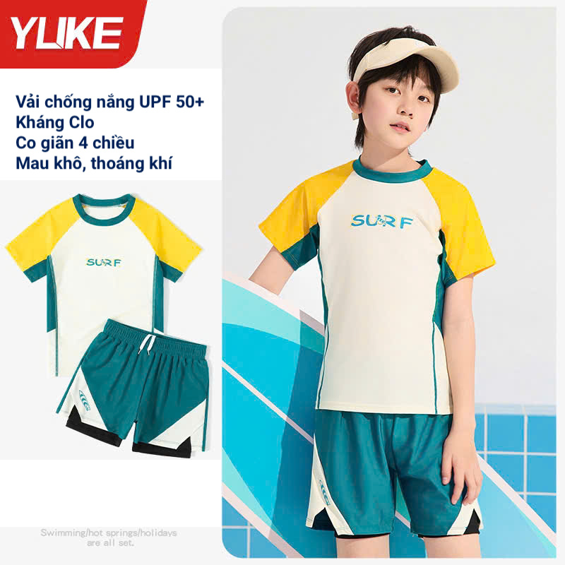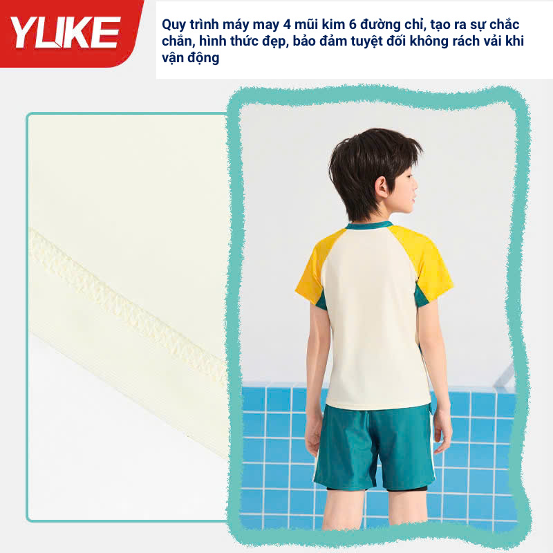 Bộ bơi cộc tay bé trai, màu trắng xanh, quần 2 lớp, chống nắng UPF 50+, YUKE