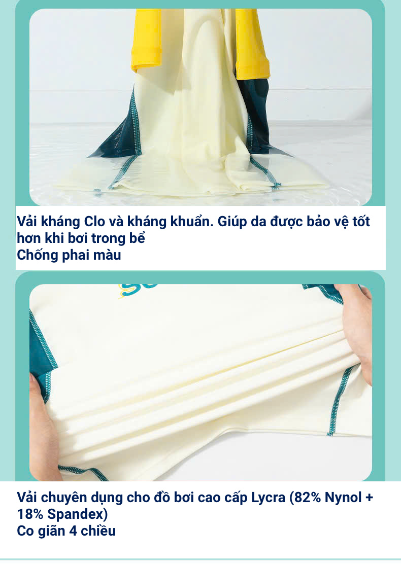 - Vải kháng Clo và kháng khuẩn. Giúp da được bảo vệ tốt hơn khi bơi trong bể.