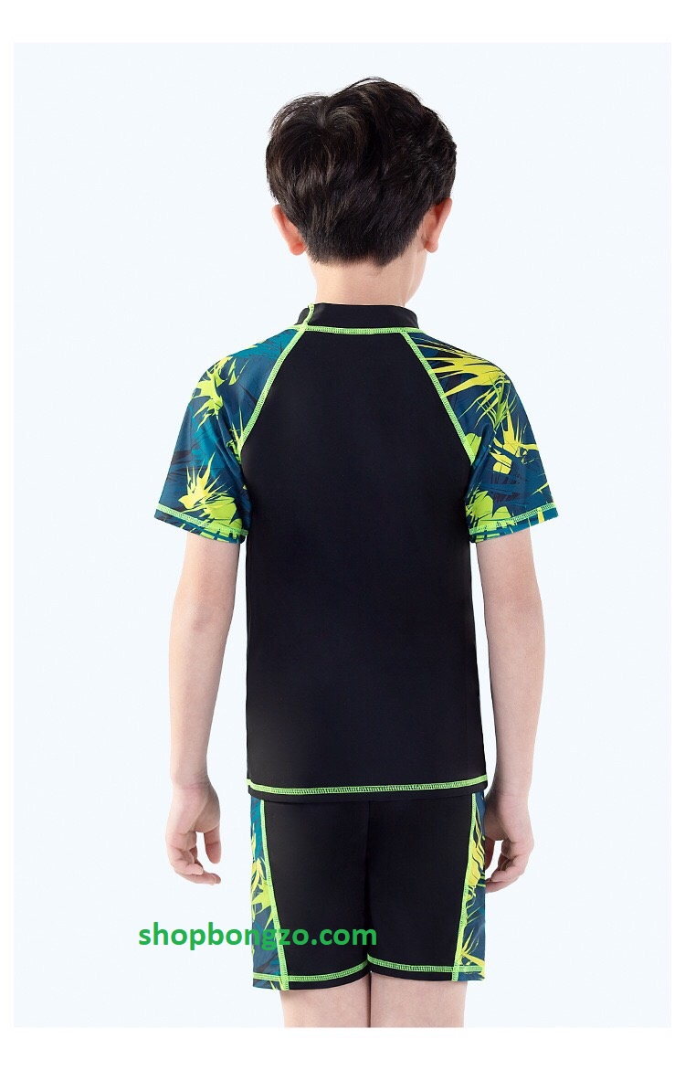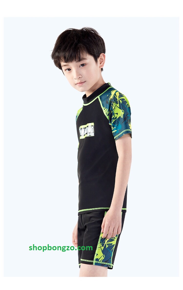 Bộ bơi cộc tay bé trai, màu trắng xanh, quần 2 lớp, chống nắng UPF 50+, YUKE