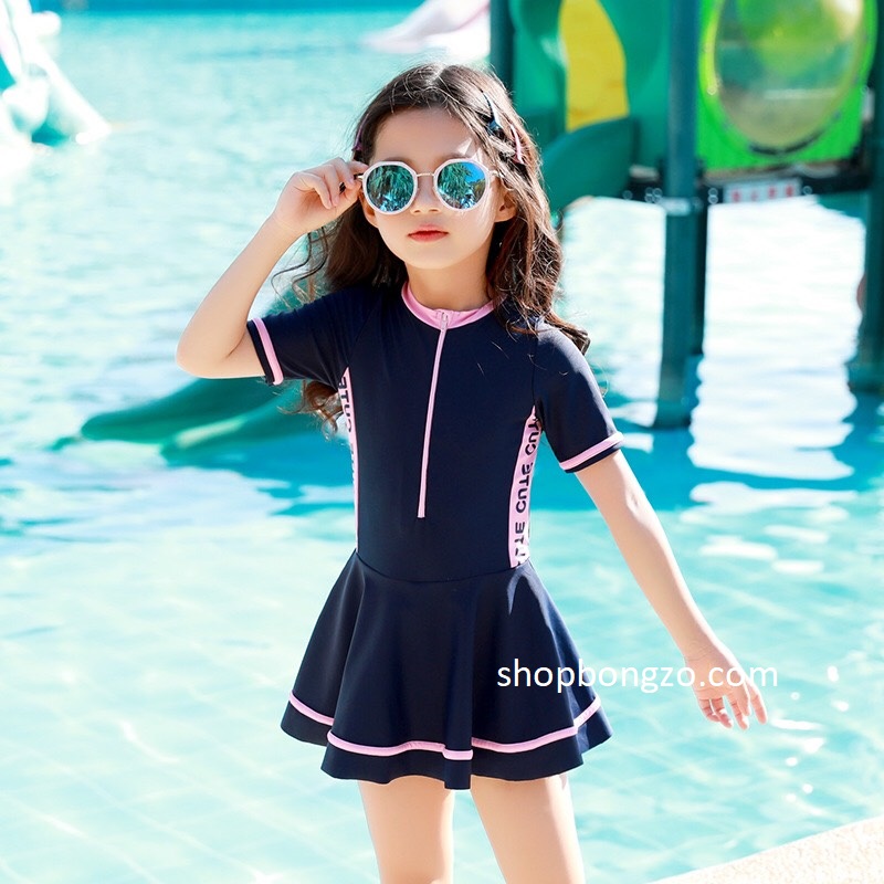 Bộ bơi bé gái cộc tay, màu trắng đen, vải cao cấp chống nắng UPF 50+, YUKE