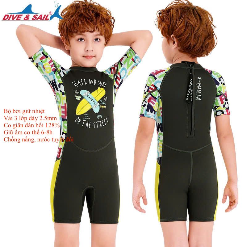 Bộ bơi giữ nhiệt cho bé, xanh liền dài tay chân, vải dày 2.5mm, Dive Sail