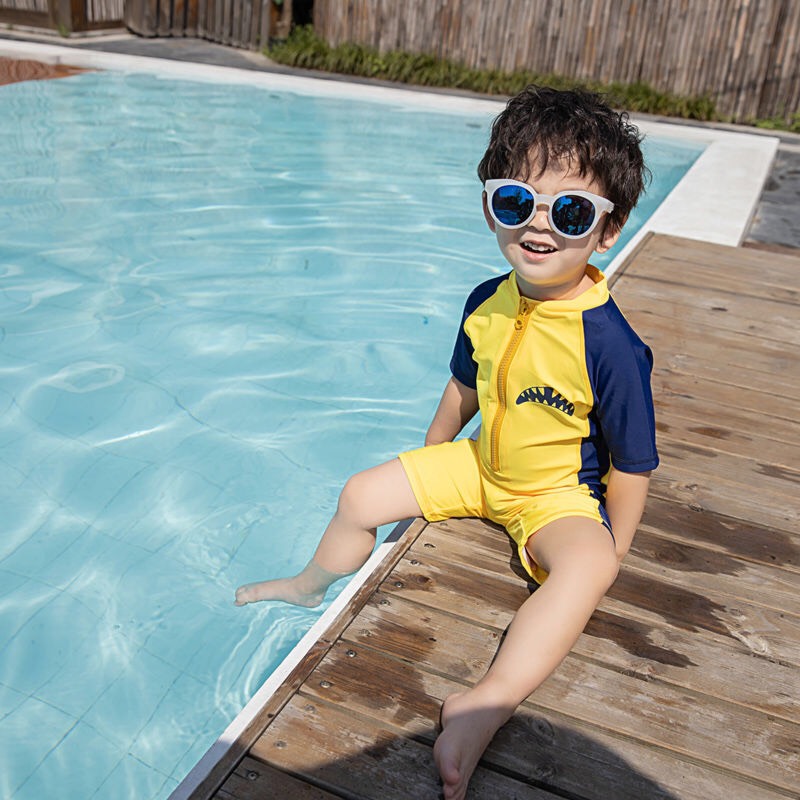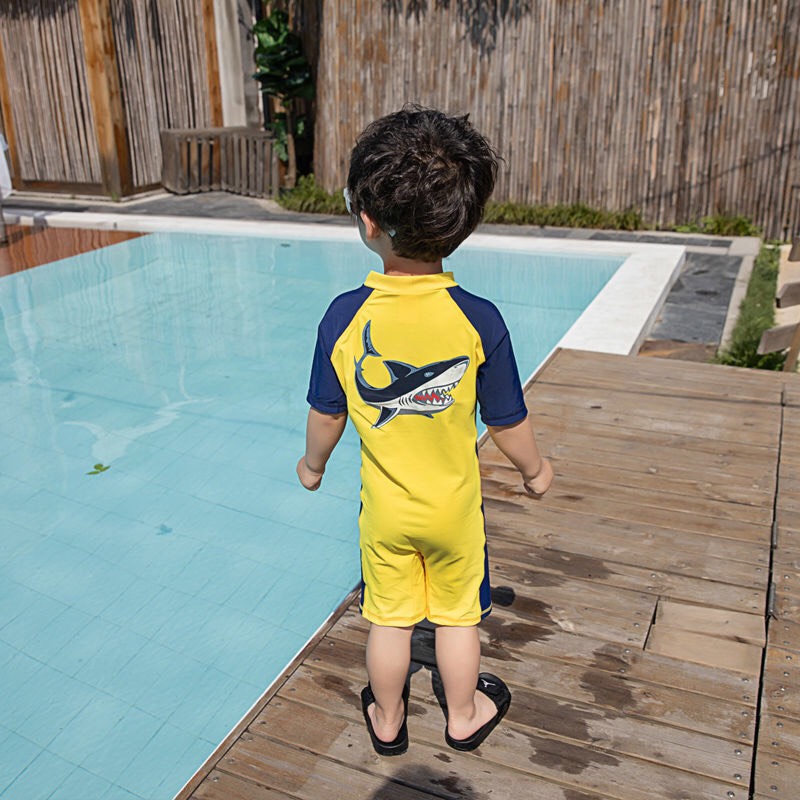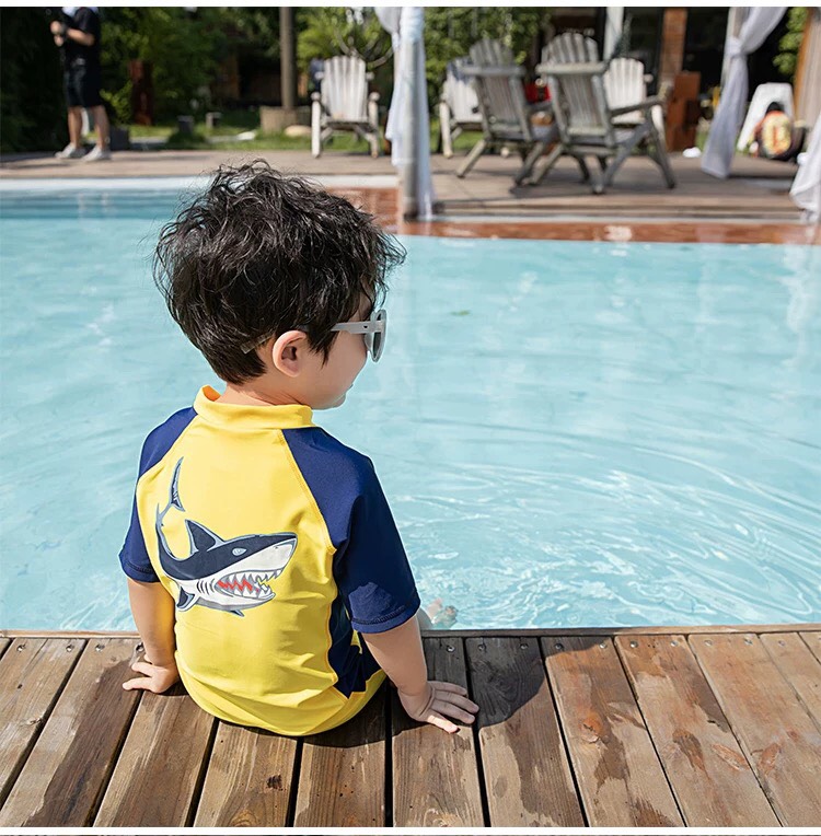 Bộ bơi cộc tay bé trai, màu trắng xanh, quần 2 lớp, chống nắng UPF 50+, YUKE