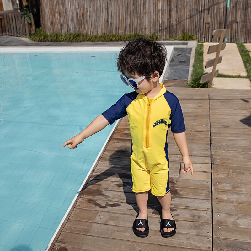 Bộ bơi bé trai chống nắng UPF50+, màu trắng tay vàng, dài tay, Paradise, YUKE