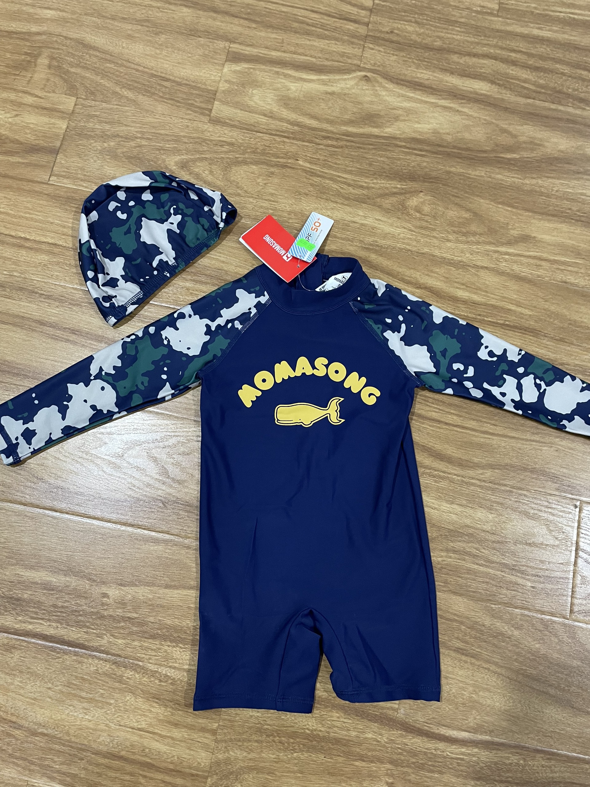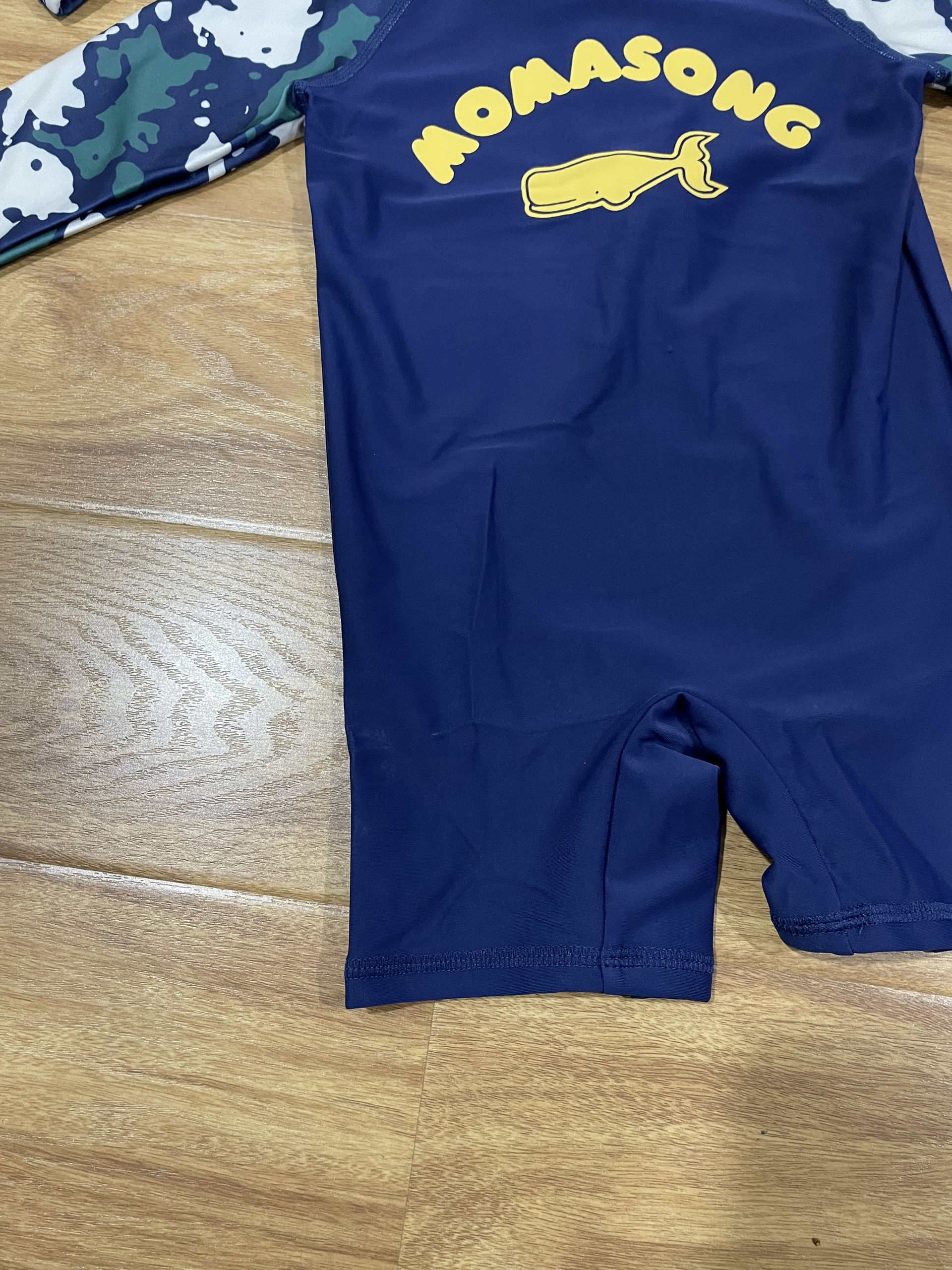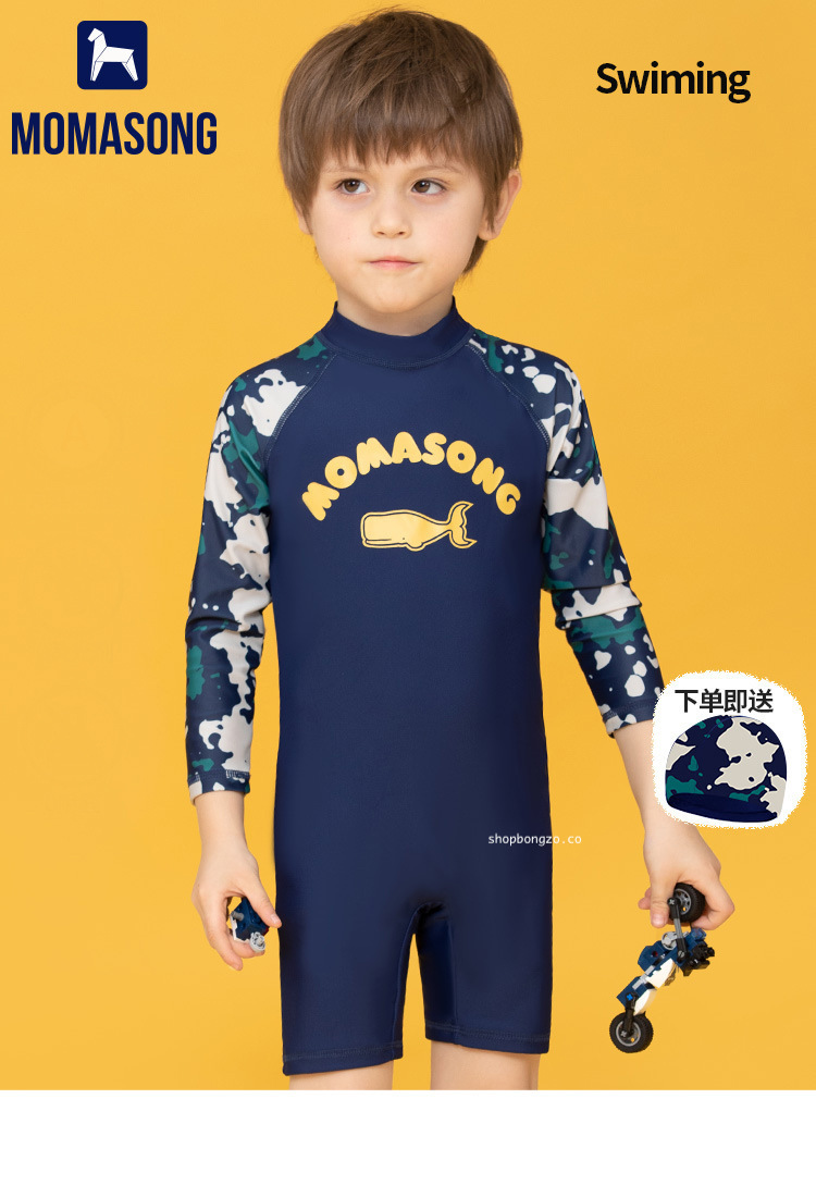 Bộ bơi bé trai dài tay, dáng liền, xanh rằn ri, vải chống nắng chống clo, Momasong (Korea)