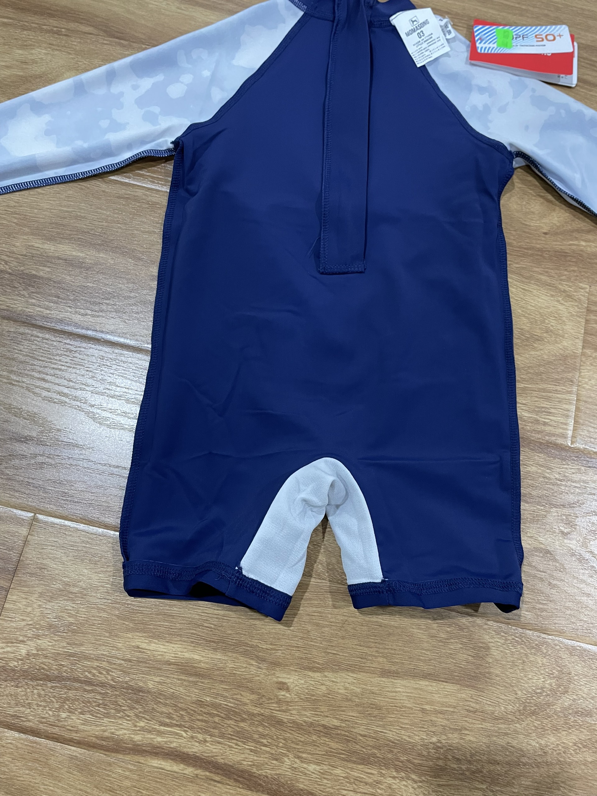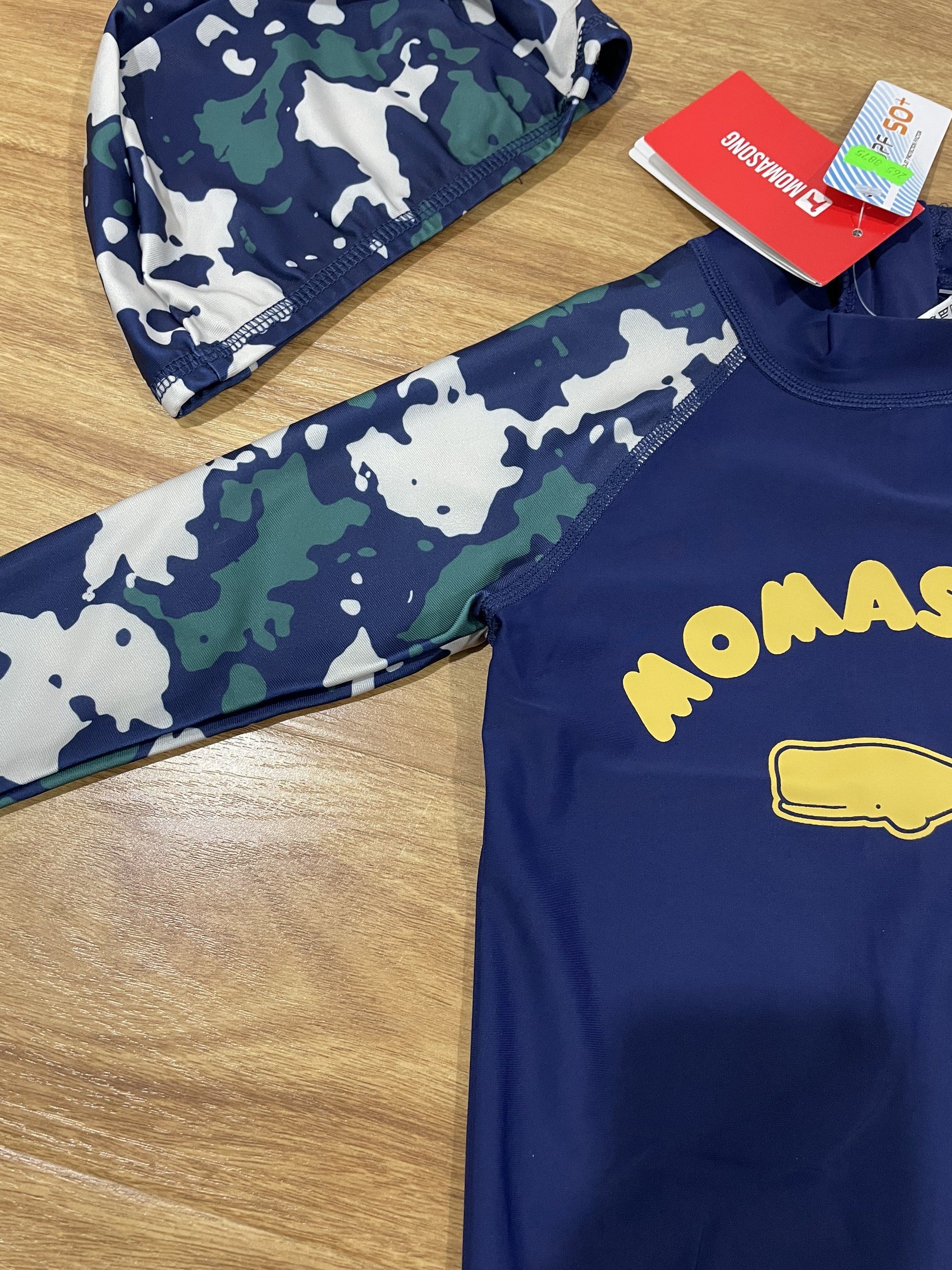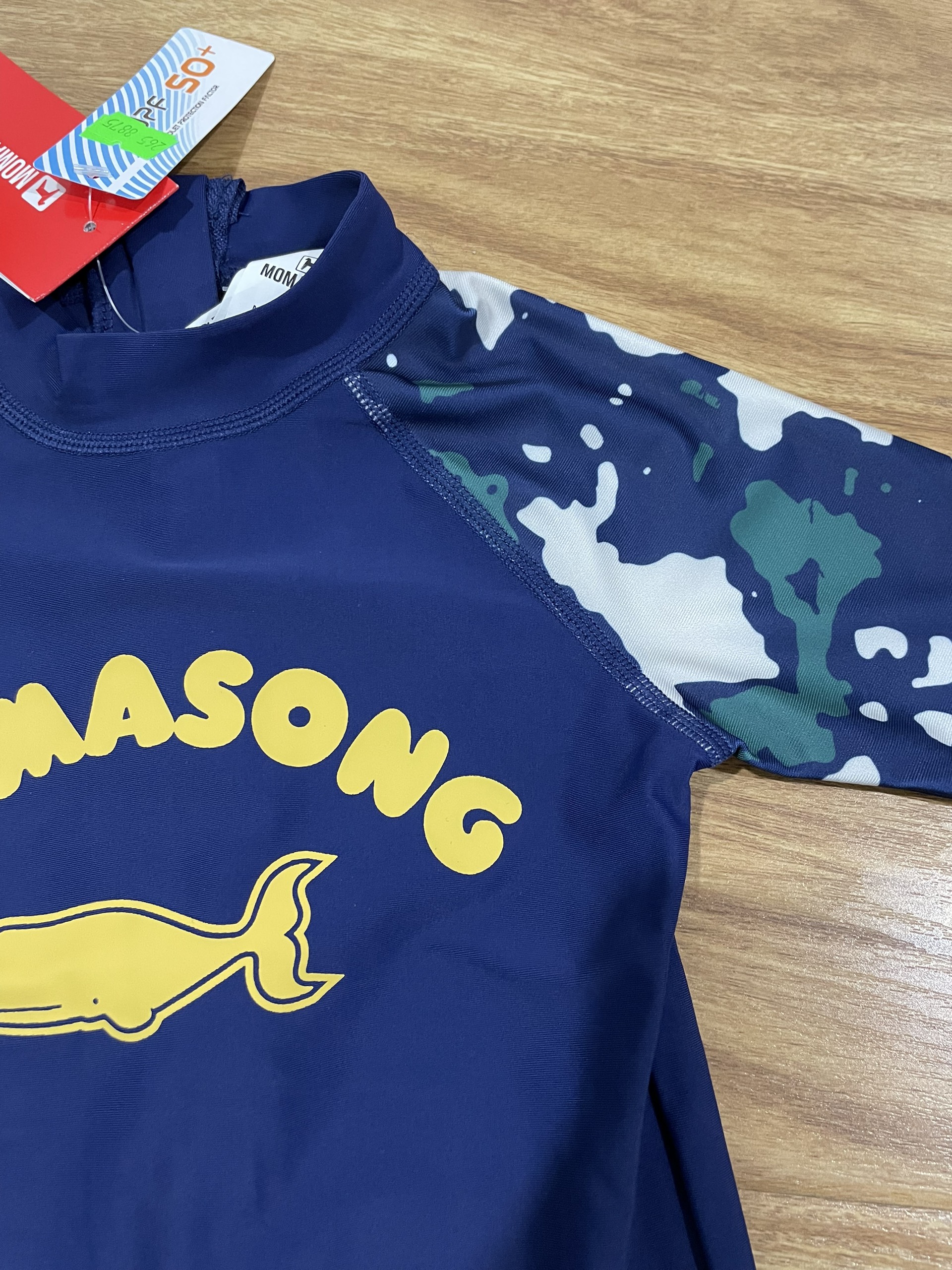 Bộ bơi bé trai dài tay, dáng liền, xanh rằn ri, vải chống nắng chống clo, Momasong (Korea)