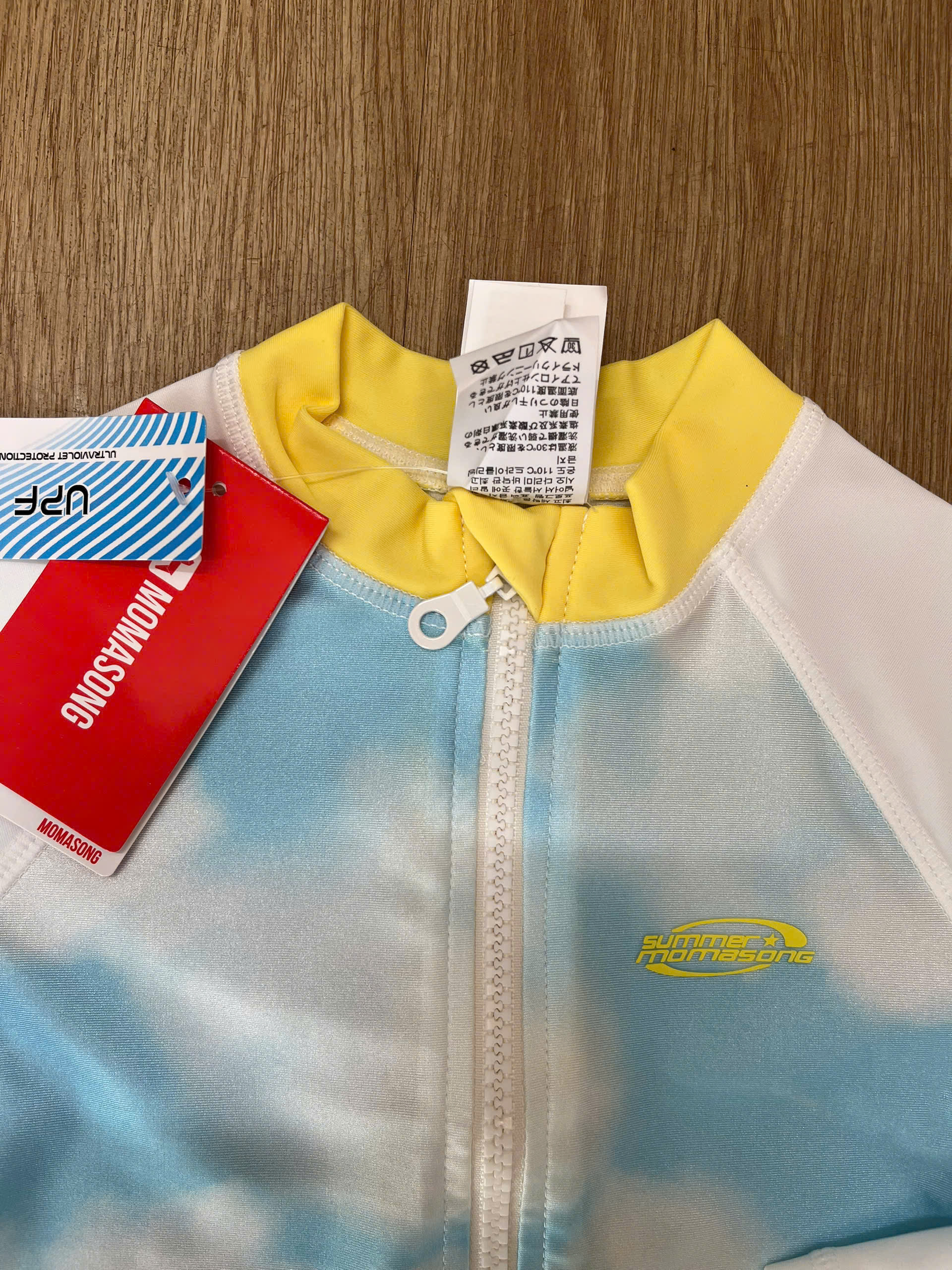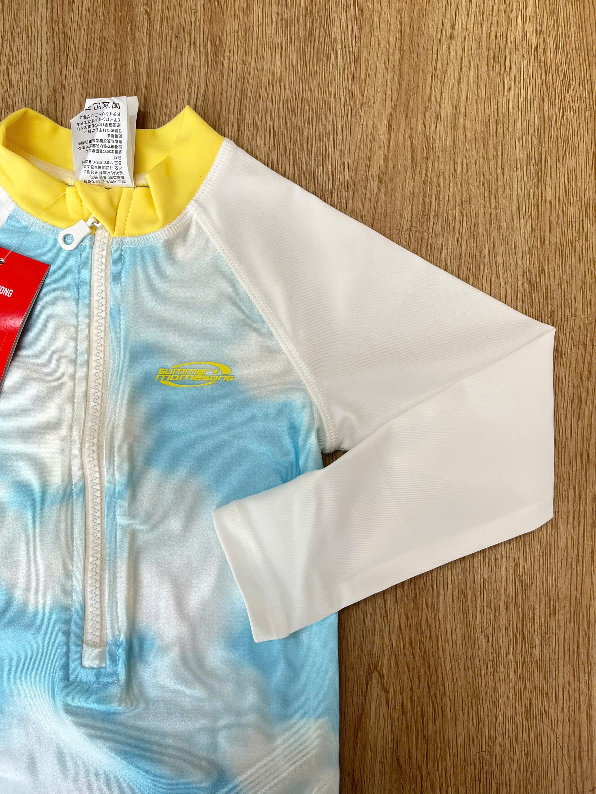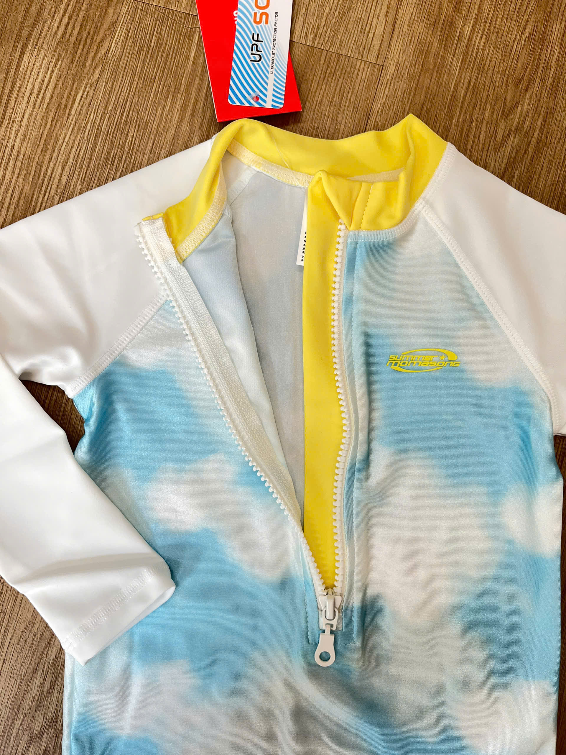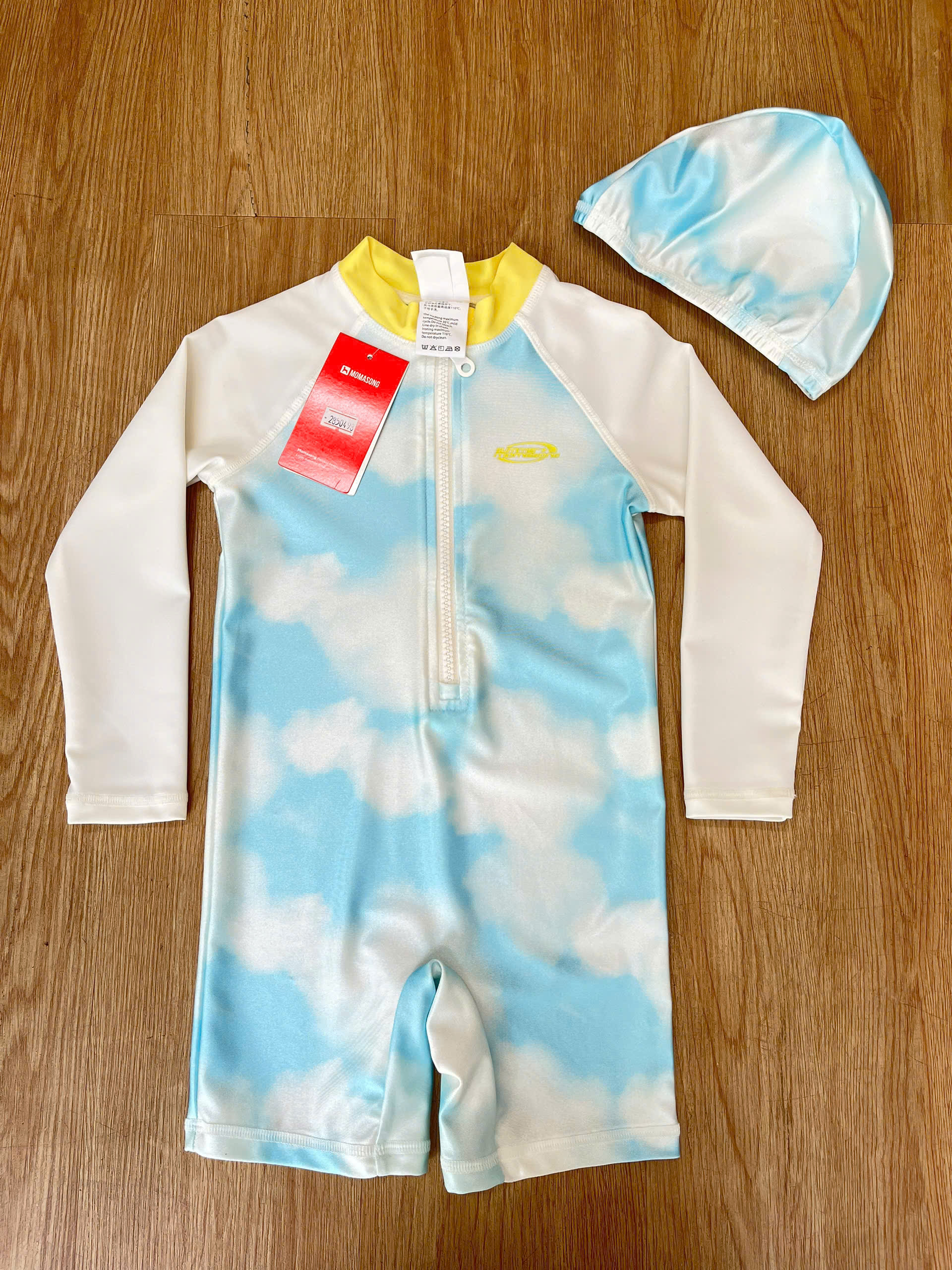 Bộ bơi dài tay chống nắng UPF 50+, Kháng Clo, dáng liền, trắng xanh, Momasong(Korea)