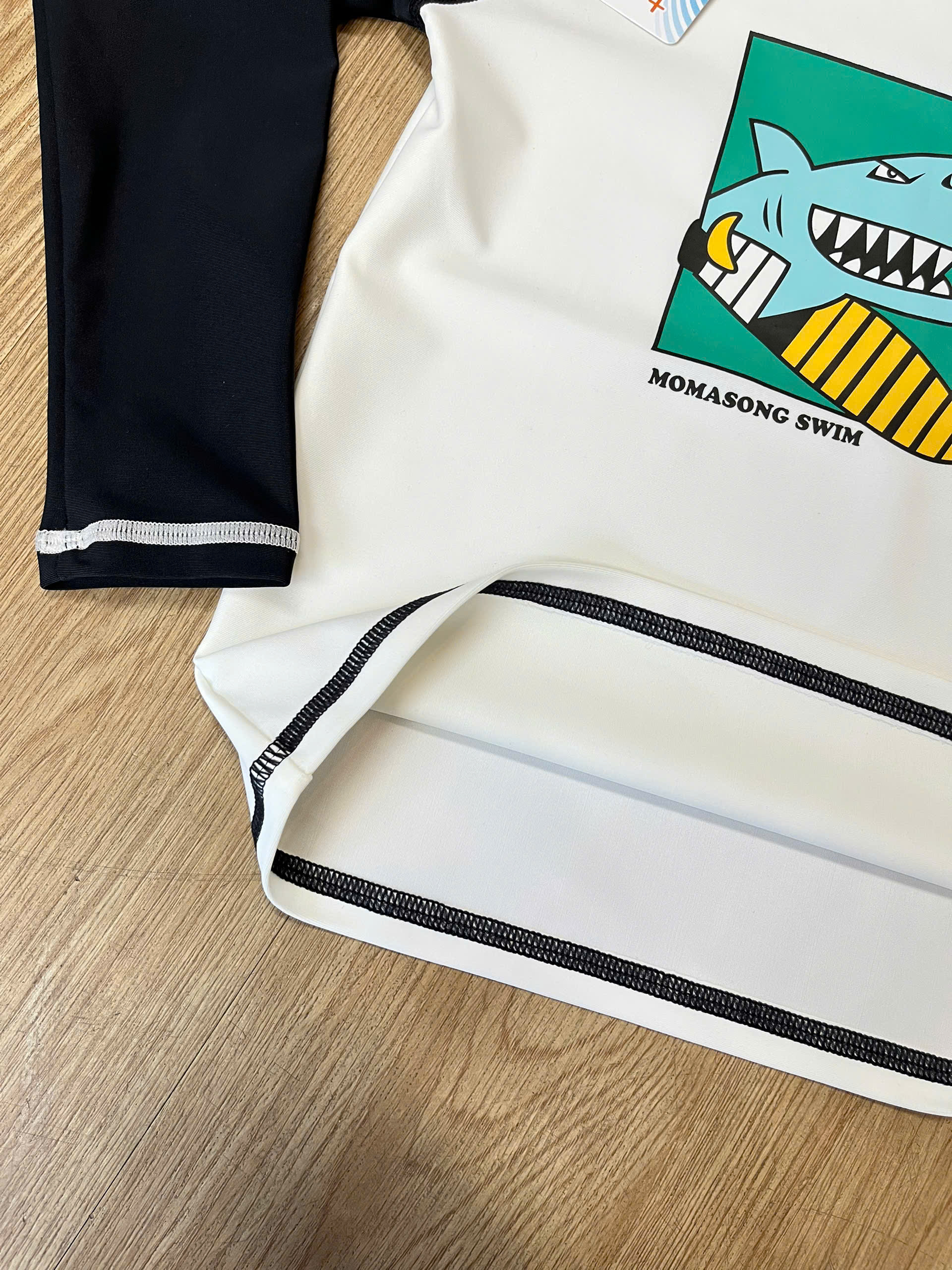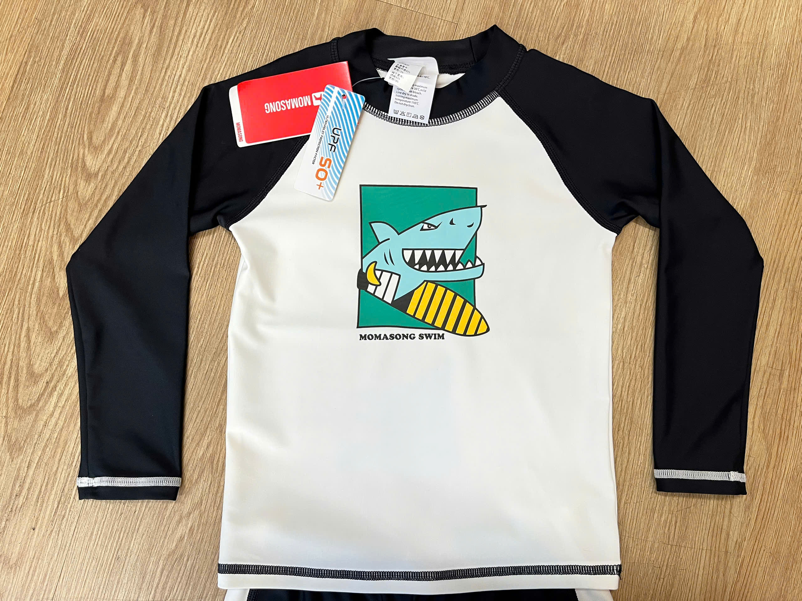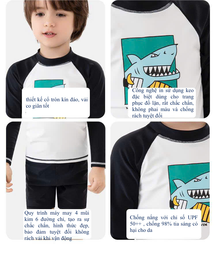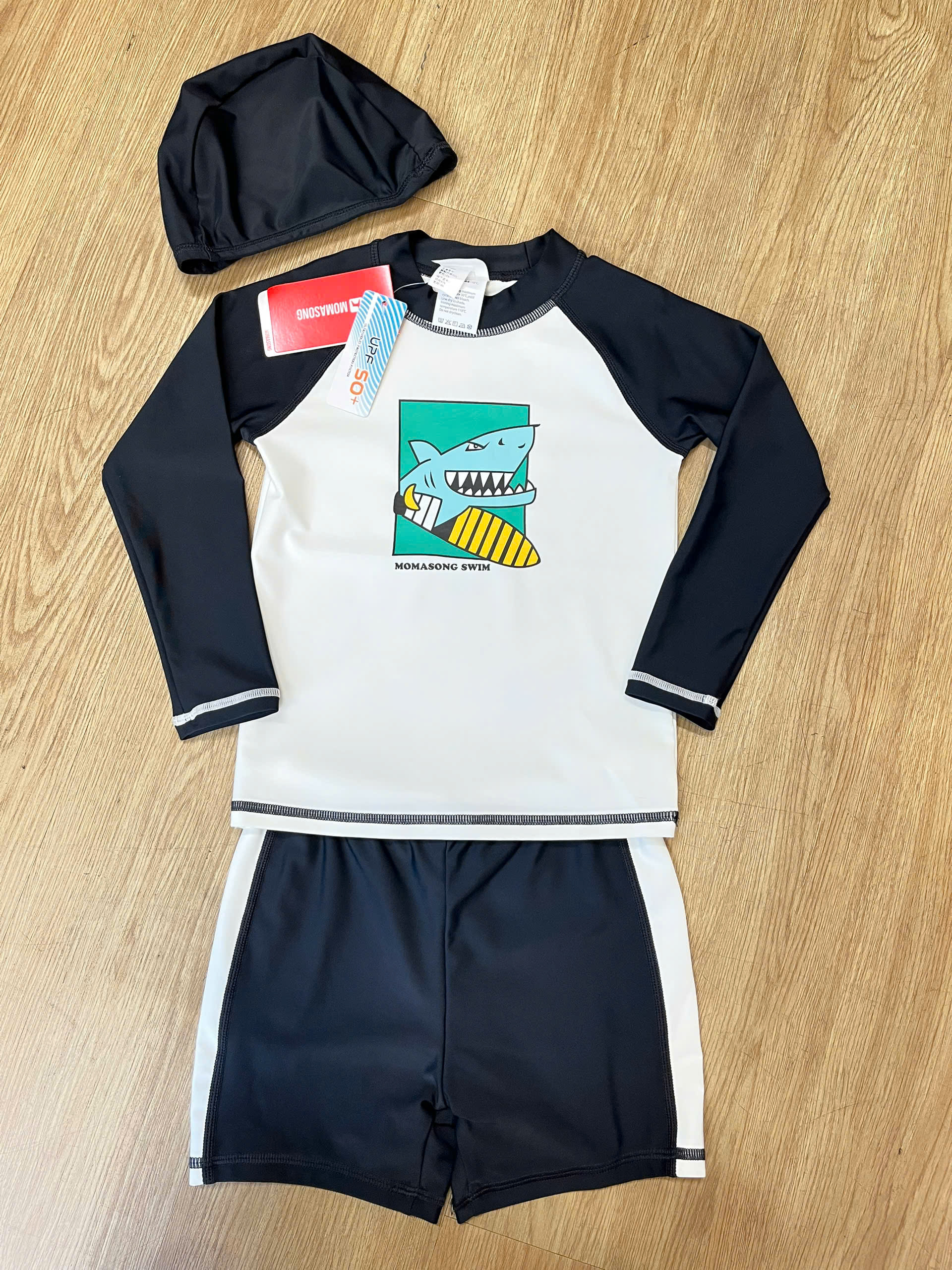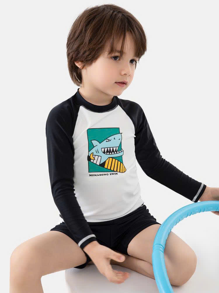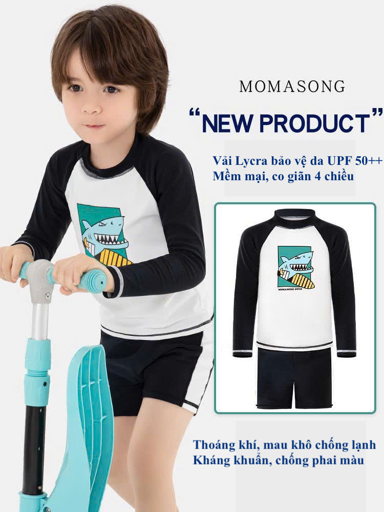 Bộ bơi dài tay, trắng tay đen, cá mập, vải chống nắng UPF50+ Momasong (Korea)