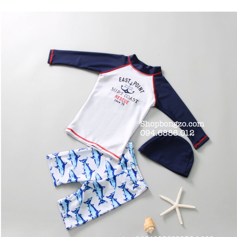 Bộ bơi cộc tay bé trai, màu trắng xanh, quần 2 lớp, chống nắng UPF 50+, YUKE