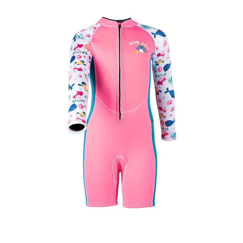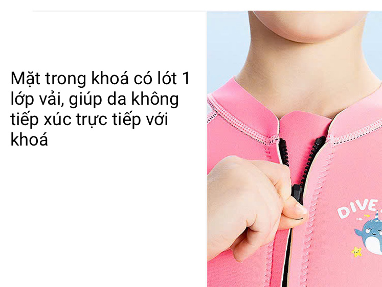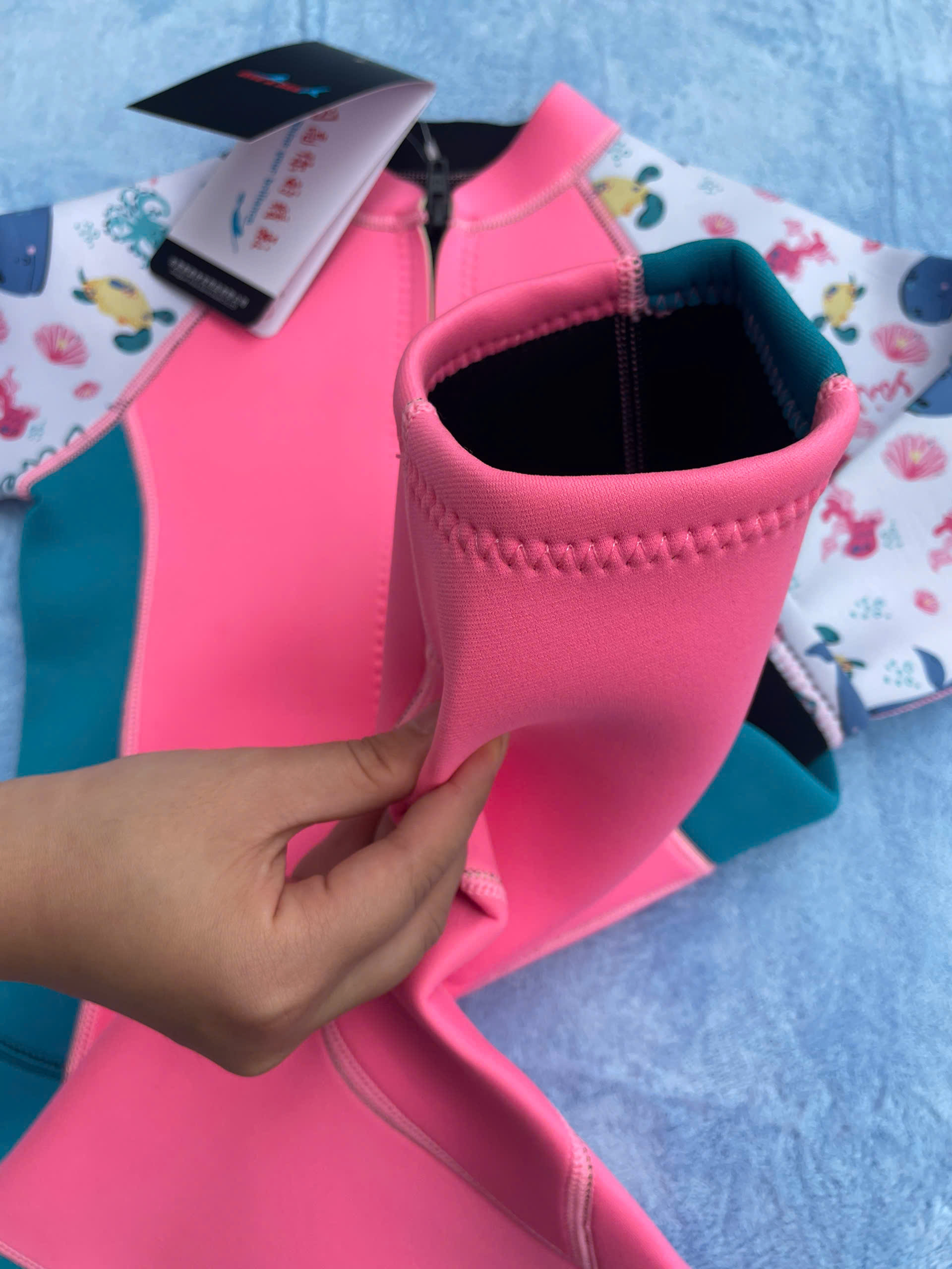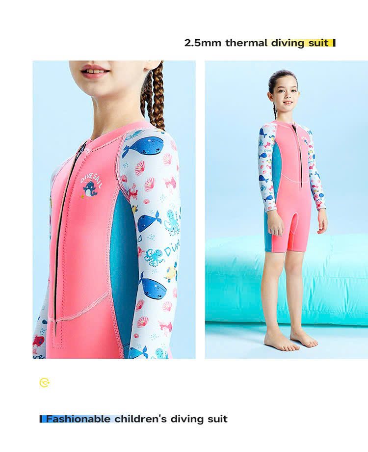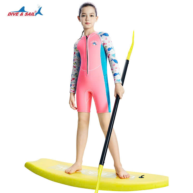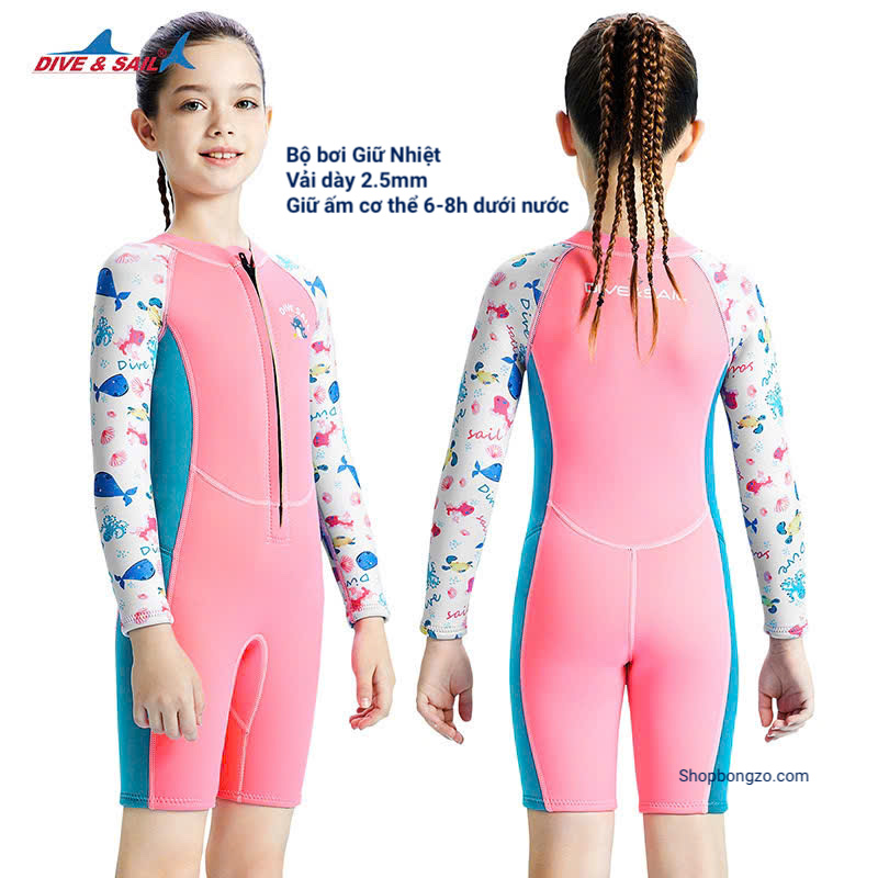 Bộ bơi giữ nhiệt bé gái, dài tay dáng liền, màu hồng tay cá, vải dày 2.5mm, Dive & Sail