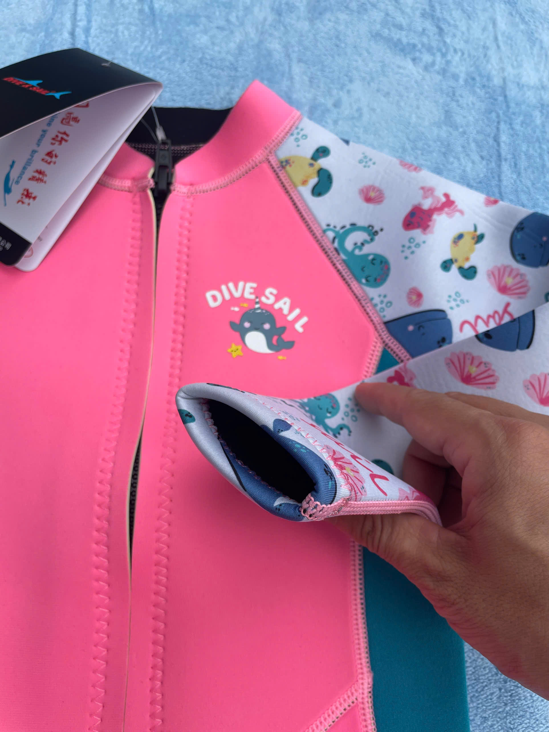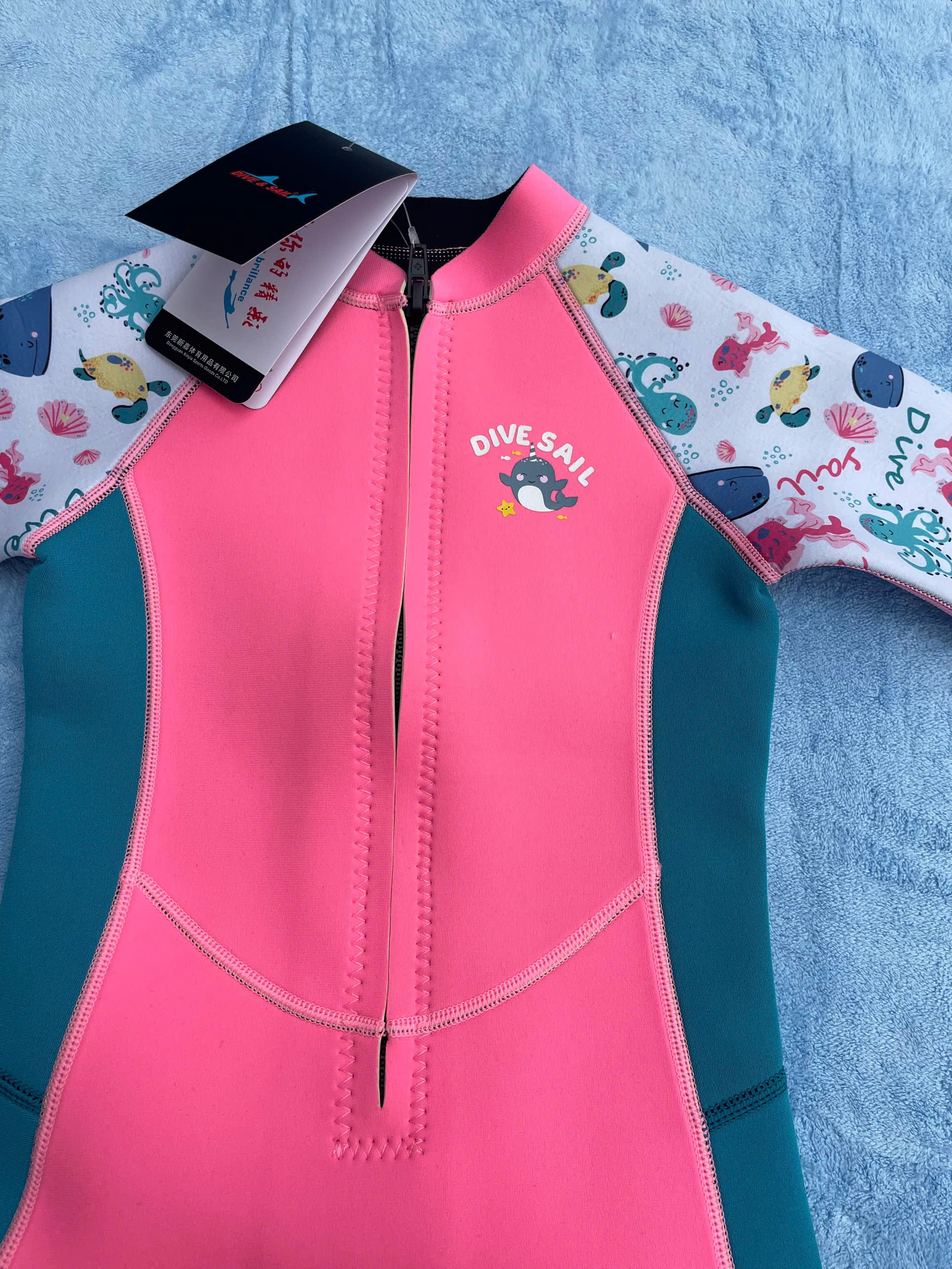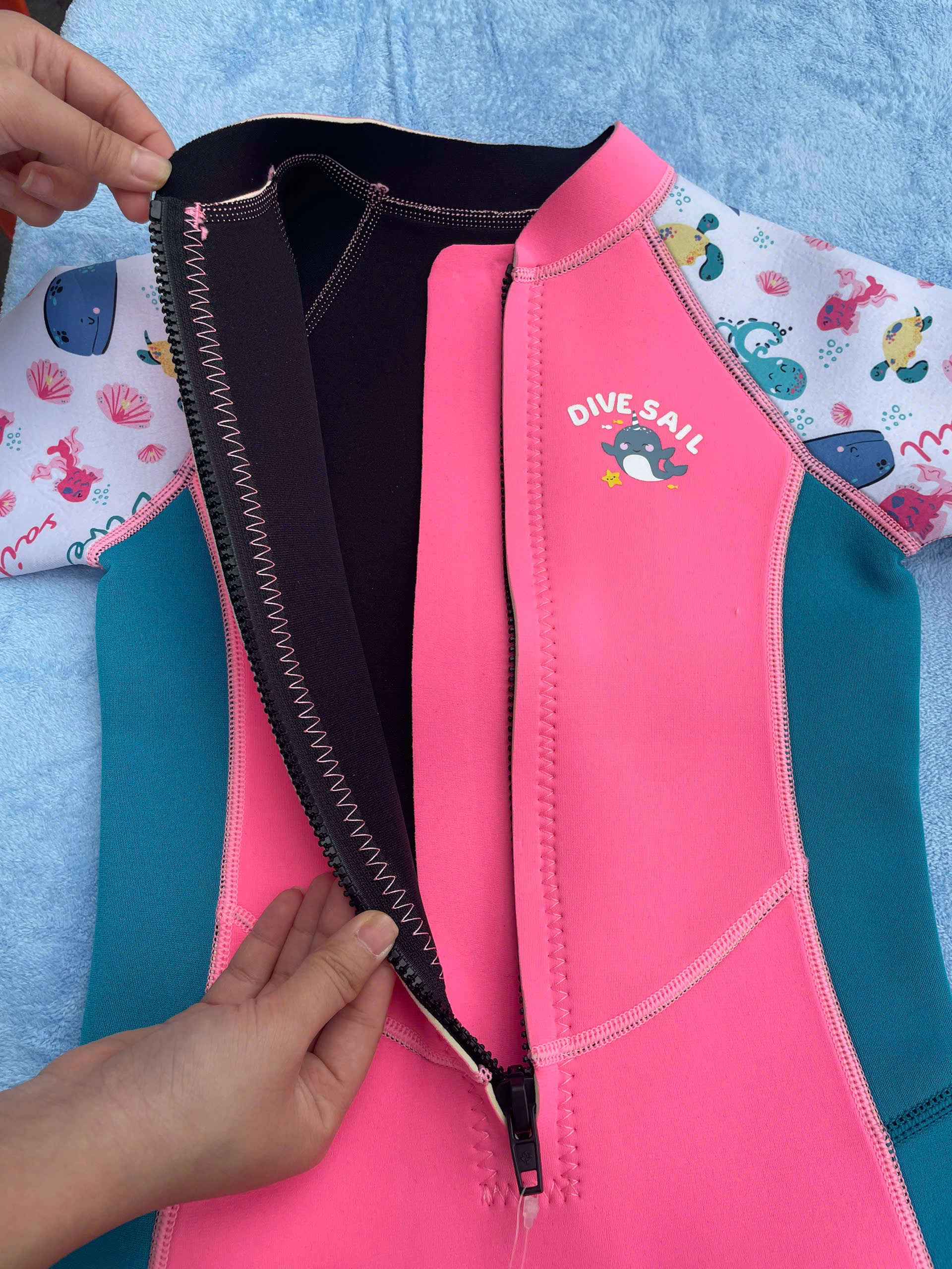 Bộ bơi giữ nhiệt bé gái, dài tay dáng liền, màu hồng tay cá, vải dày 2.5mm, Dive & Sail